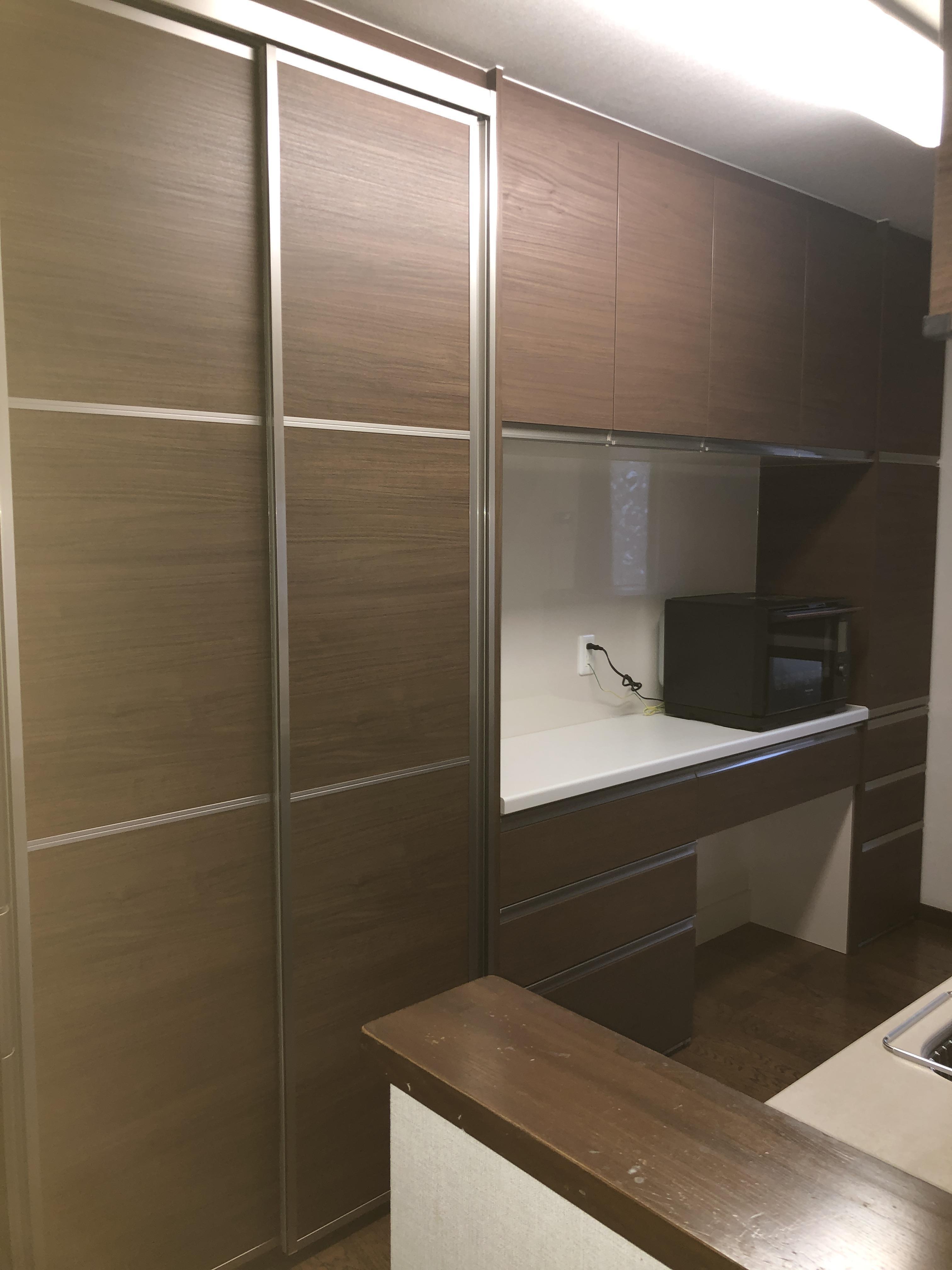 キッチンに合わせた一体感のある色合い、3mを超えるサイズの背面収納になります
