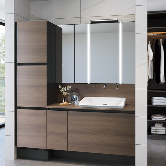 ●ルミシス ⇒ 美しさと使いやすさを兼ね備え、水栓まわりに水が溜まらずお手入れ簡単!オススメの洗面化粧台
