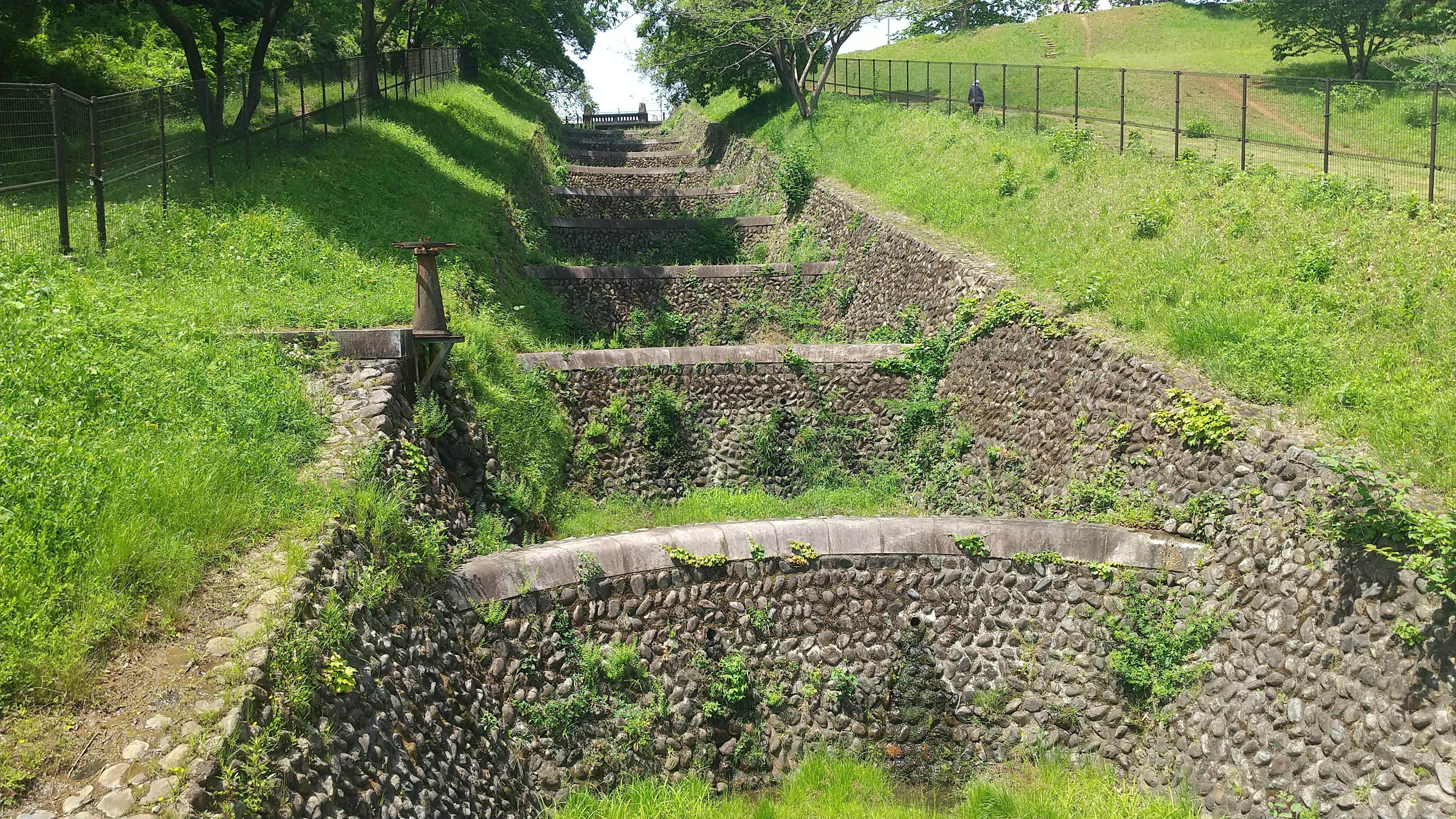 堤防からのオーバーフローの水を流す十二段の滝があります。(通常時は水は流れてません。)