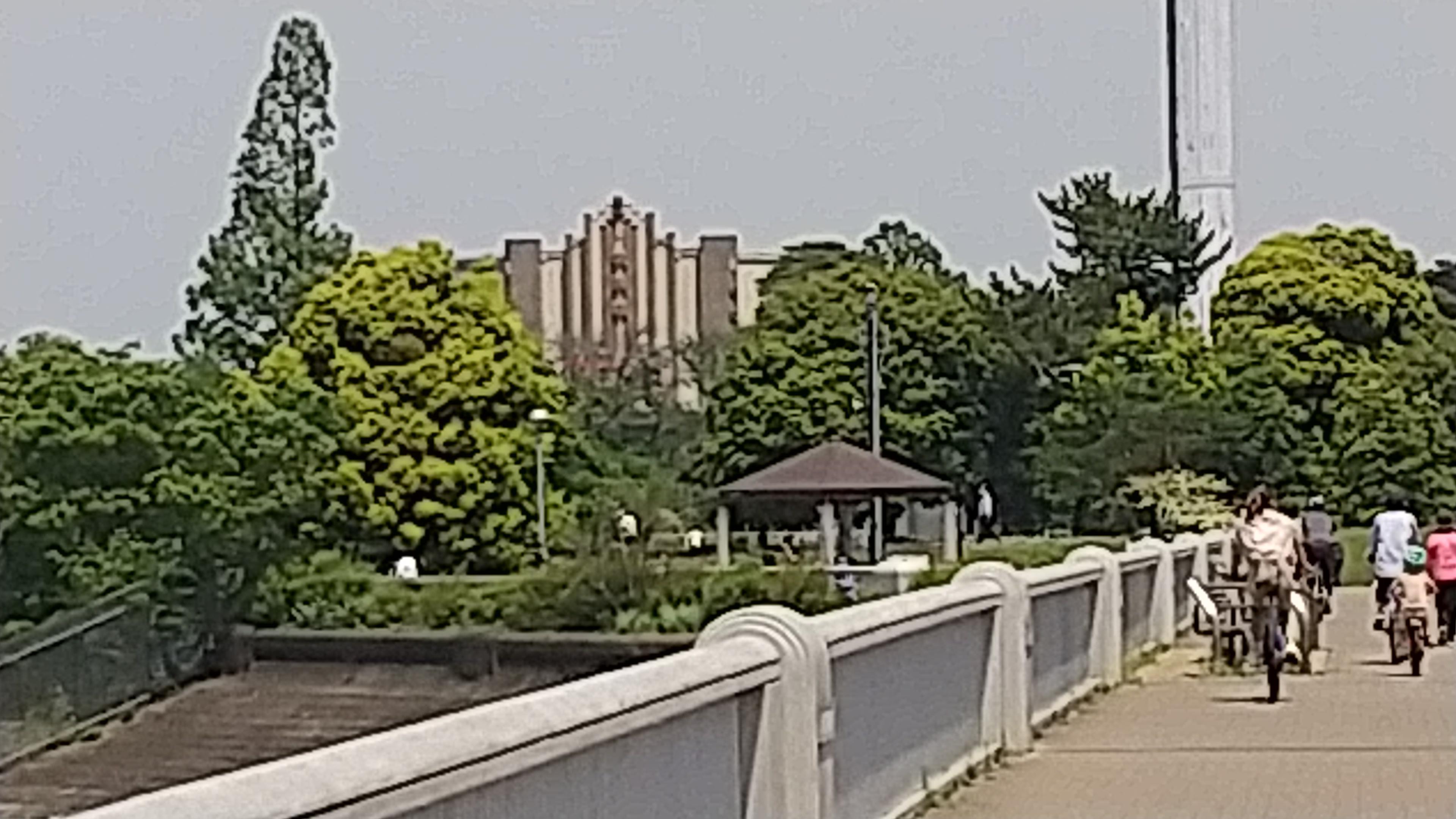 堤防の先にまもなくオープンの予定の西武園ゆうえんちの建物が見えます。