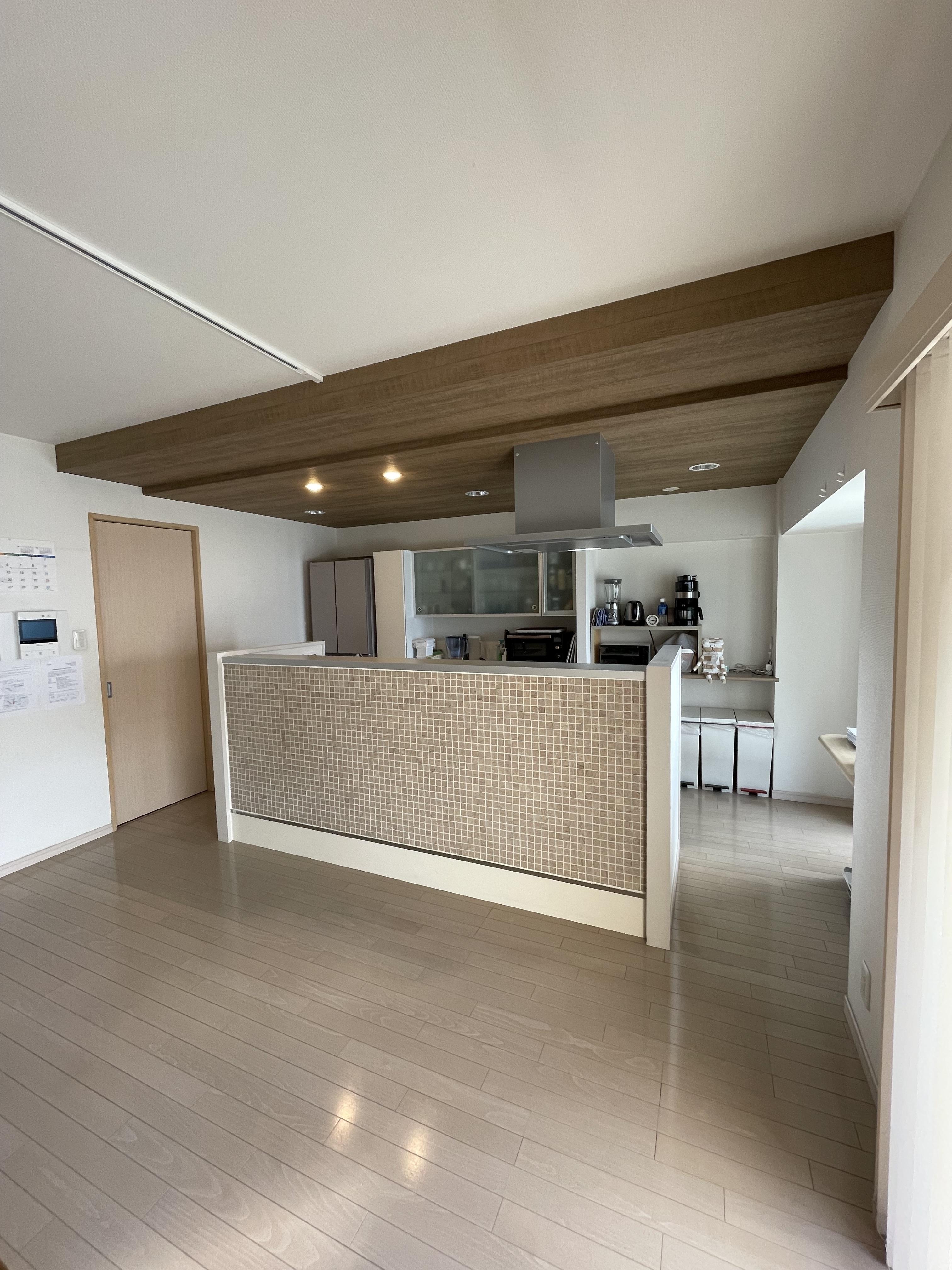 今回、キッチンを入れ替え、経年で不具合が出てきたダウンライトを配線ダクトタイプに変更し、天井の一部、仕上げ材の貼替をしました。木目調クロスで、今までとは違うテイスト、色合いですが、カッコ良くスマートなお部屋の雰囲気に変わりました!!