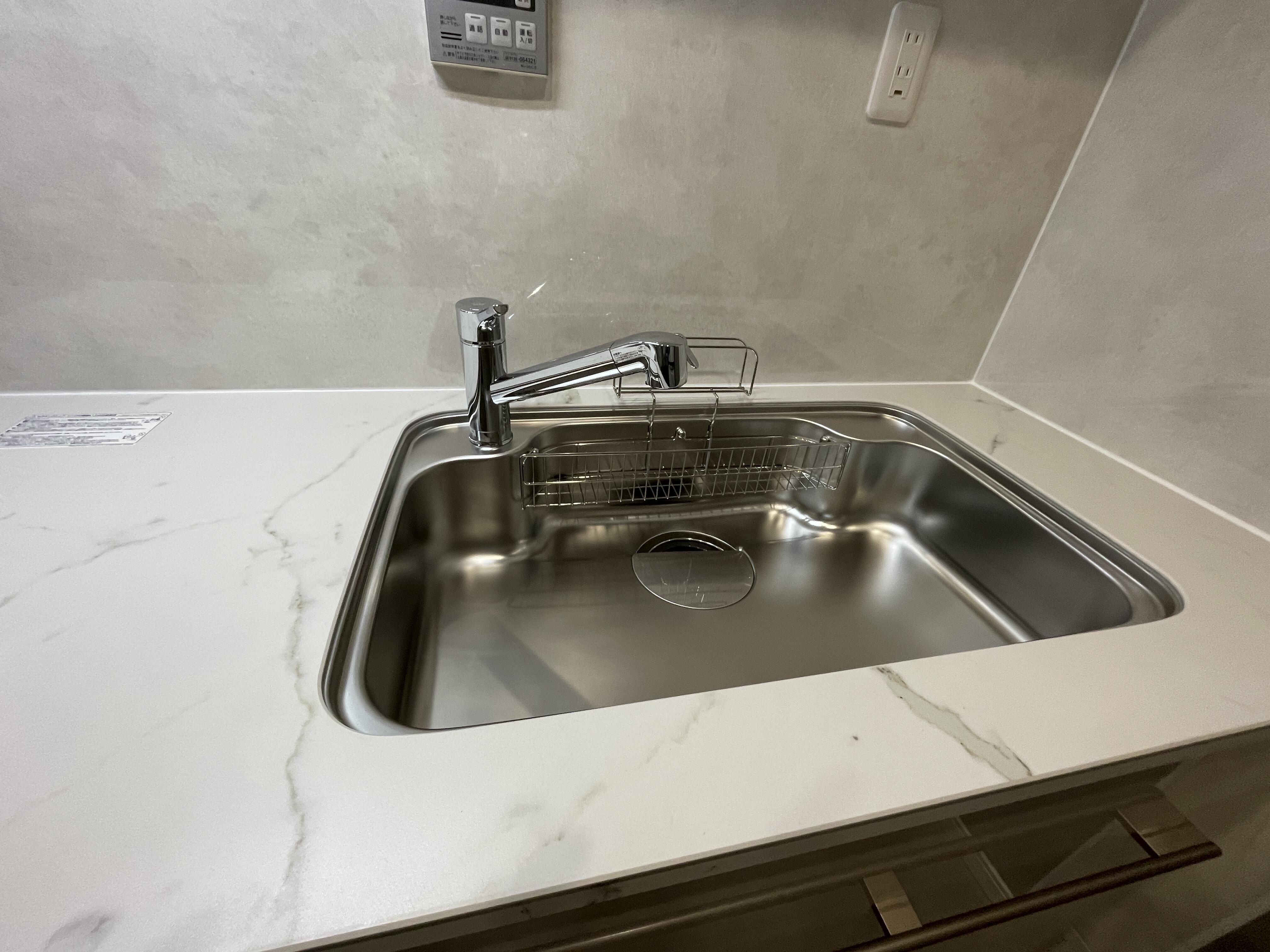 カウンターはやわらかい石目調のホワイト系 セラミックカウンターのカルカッタホワイト。