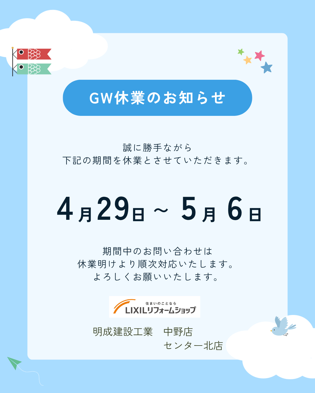 一覧へ戻る明成建設工業センター北店では以下の期間をGW休業といたしますので