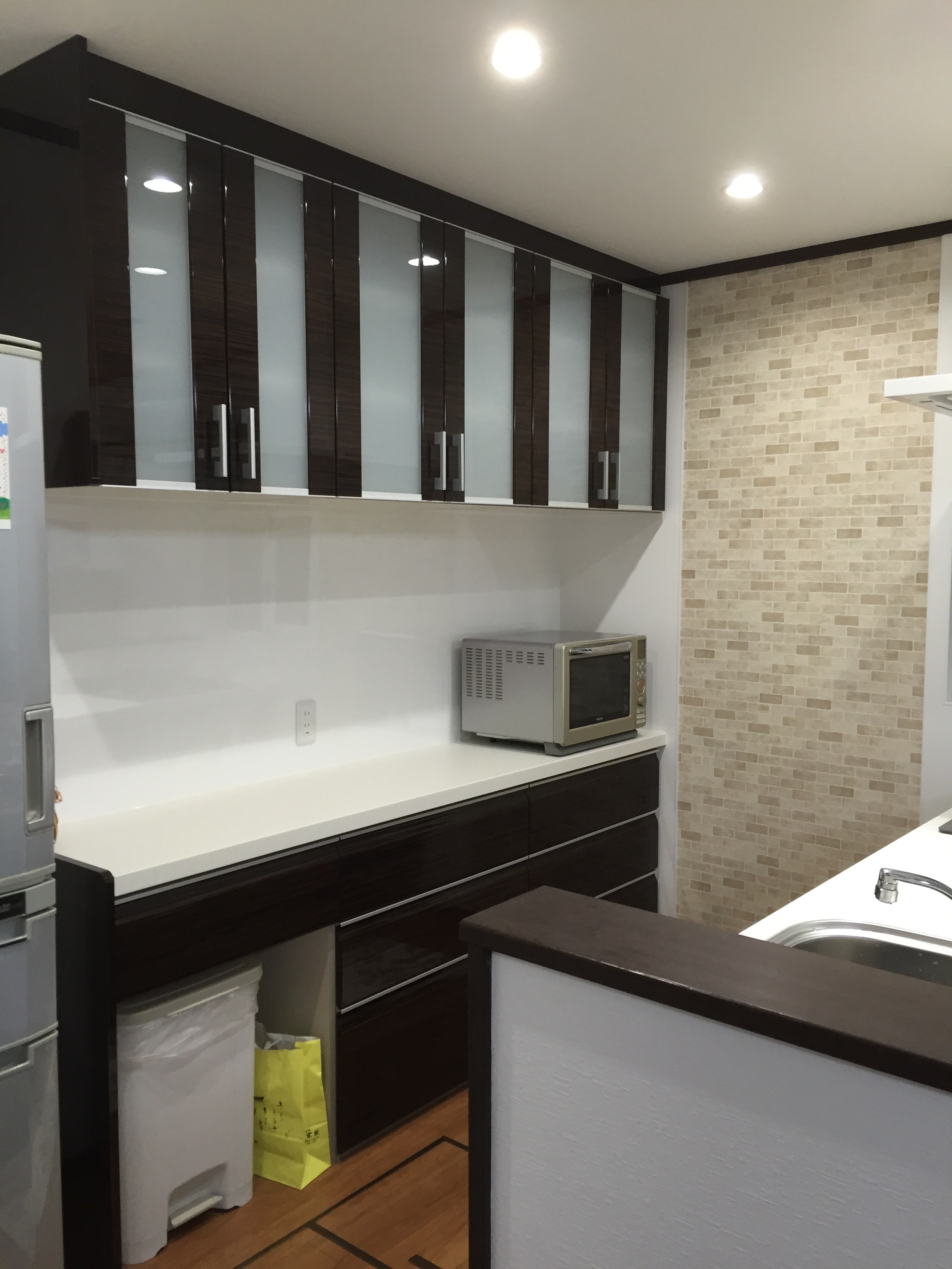長年使い続けていたL型キッチン。建てた当時は良いと思っていたけれど、デッドスペースができてしまう、あっち向いたりこっち向いたりしないといけない、などなど普段キッチンに立つことが多い奥様には悩みの種でした。そこで思い切ってキッチンの形を変えてみることに。すっきりしたⅠ型キッチンの後ろに、たっぷりとしたワークスペースのカウンターを確保。そうすると動線がシンプルになりますので、作業効率もアップ。LIXILのシステムキッチン リシェルなら、寸法までカスタマイズが可能なので、自分好みのキッチンが可能です。
