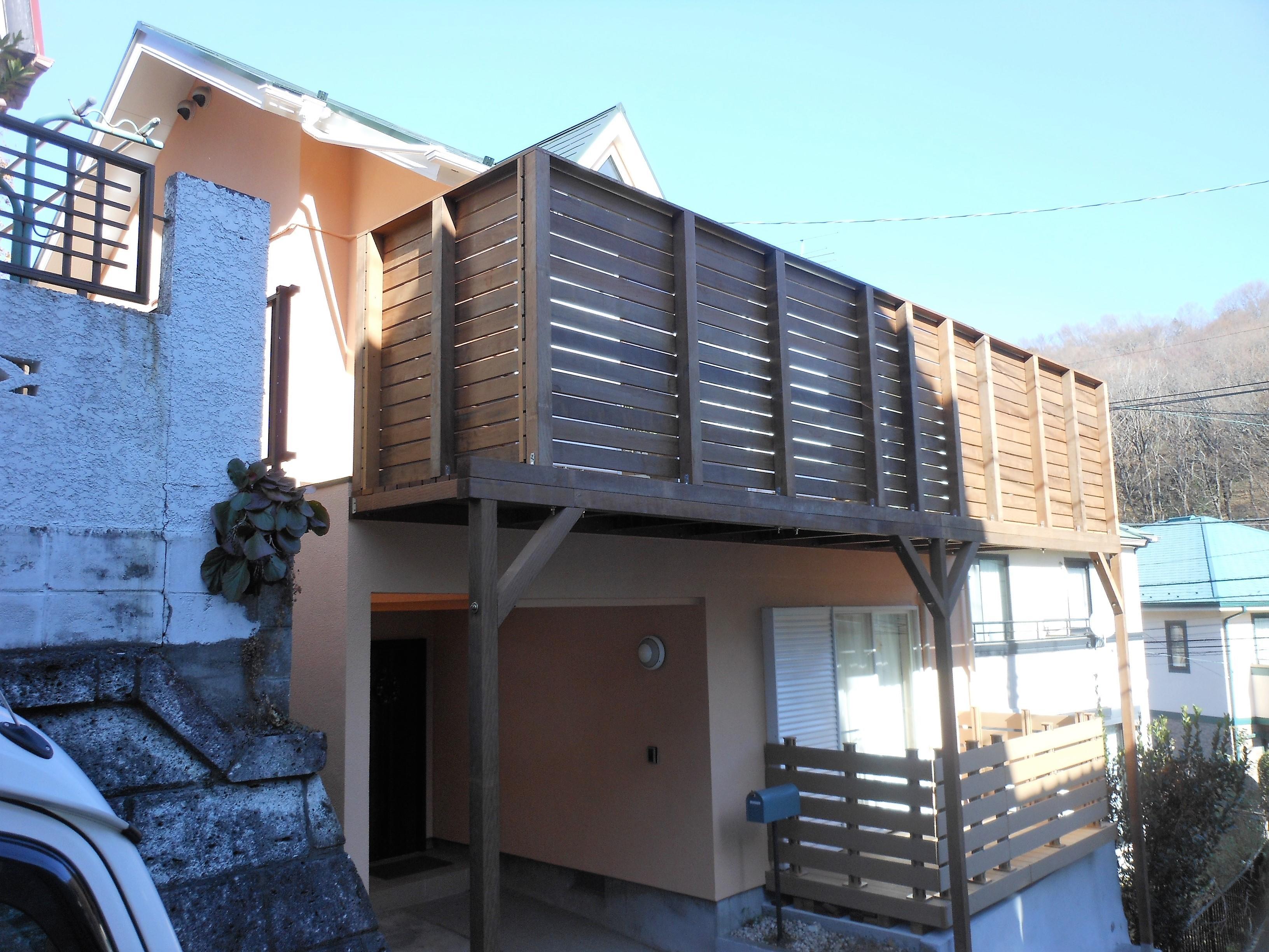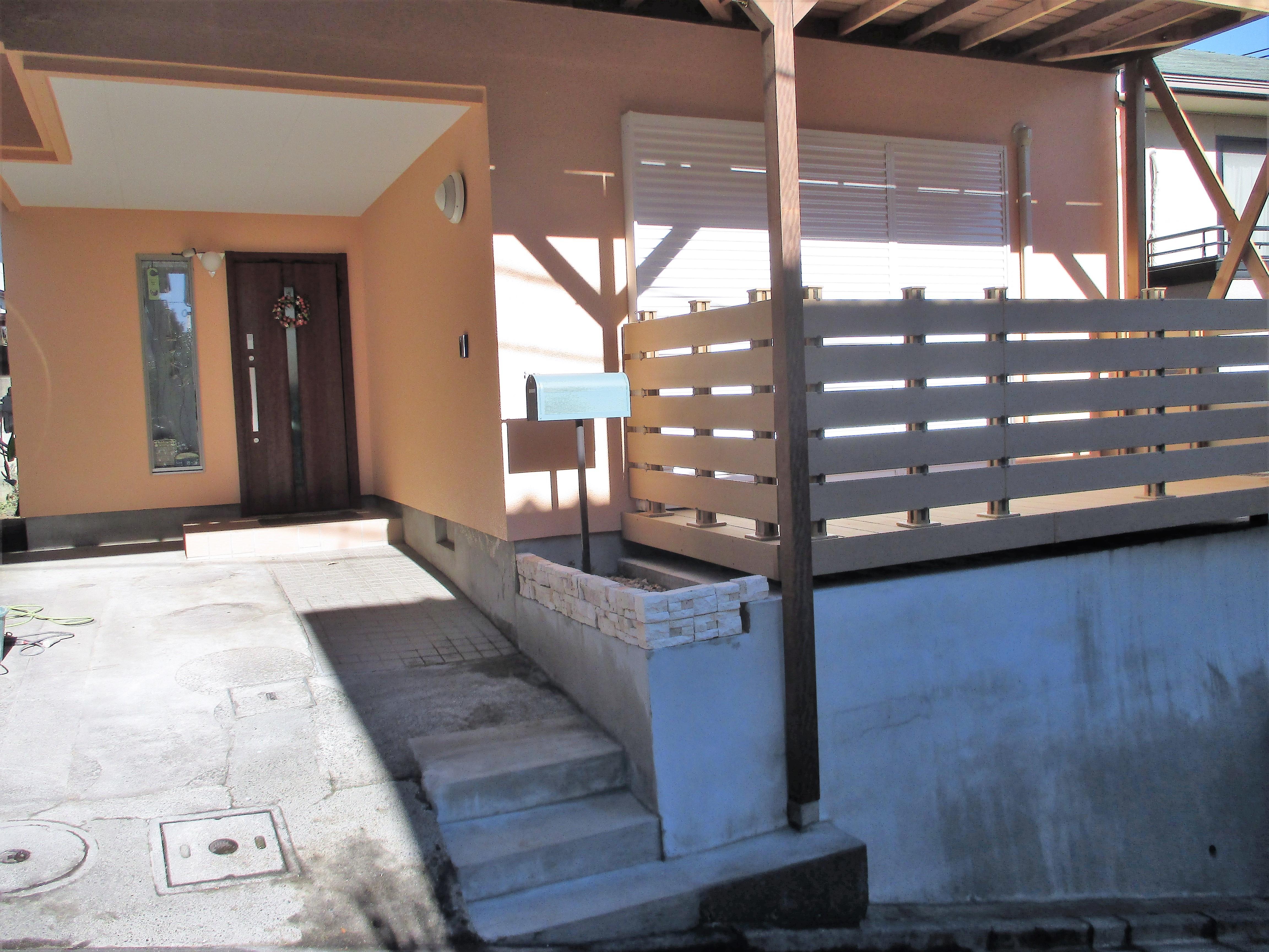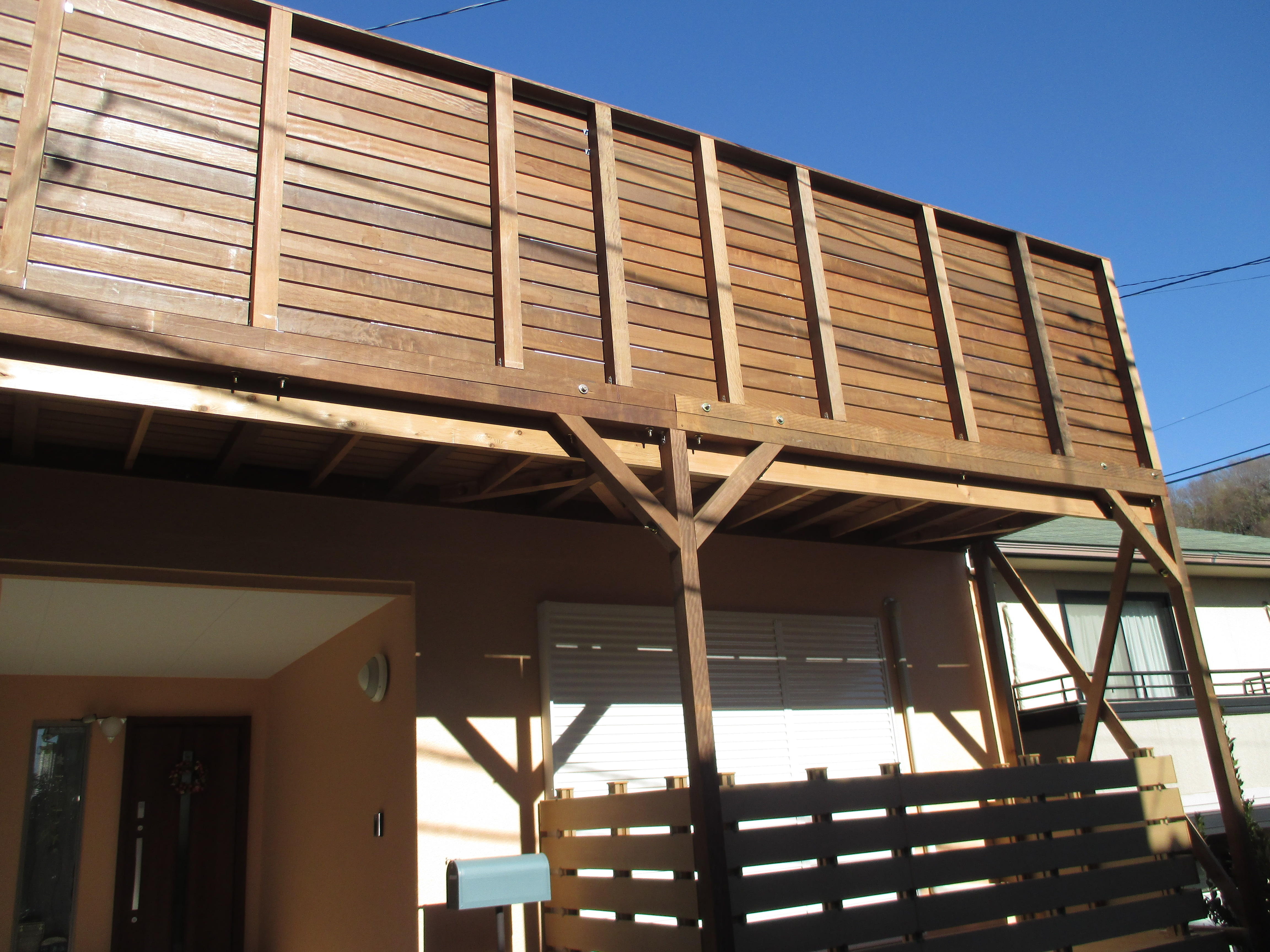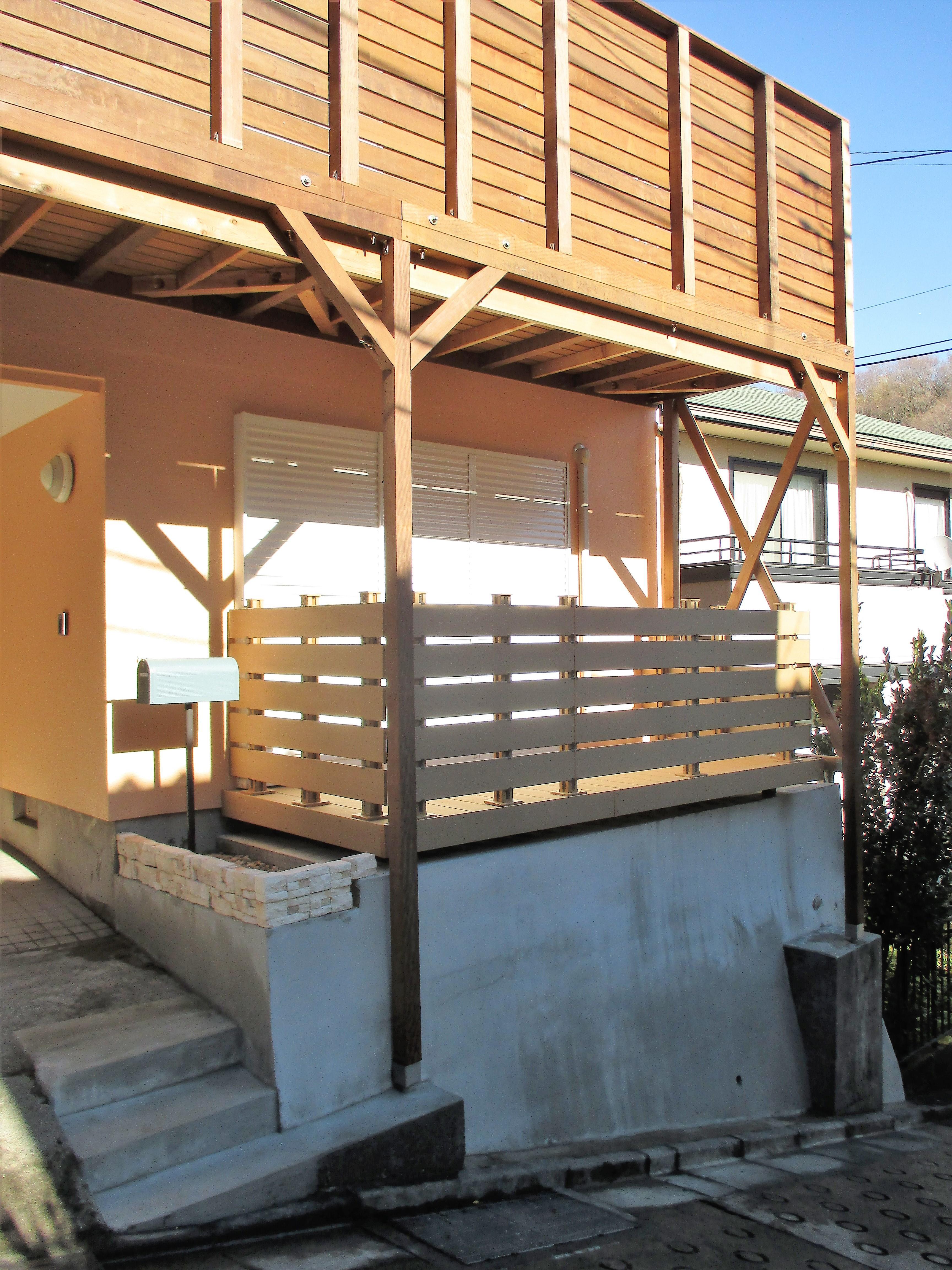 以前に室内の全面改装を承りましたお客様です。 今回は、外部の壁・屋根の塗装、玄関扉交換、懸案だったウッドデッキ工事をご注文いただきました。 お客様は、このウッドデッキには思入れがあり、メンテナンスのしやすさと、目隠し、 そして補強を含めてこだわりぬいて選ばれました。 最近は、アルミの材料も多いですが、柔らかさと手触りの点で、あえて木素材を使用いたしました。