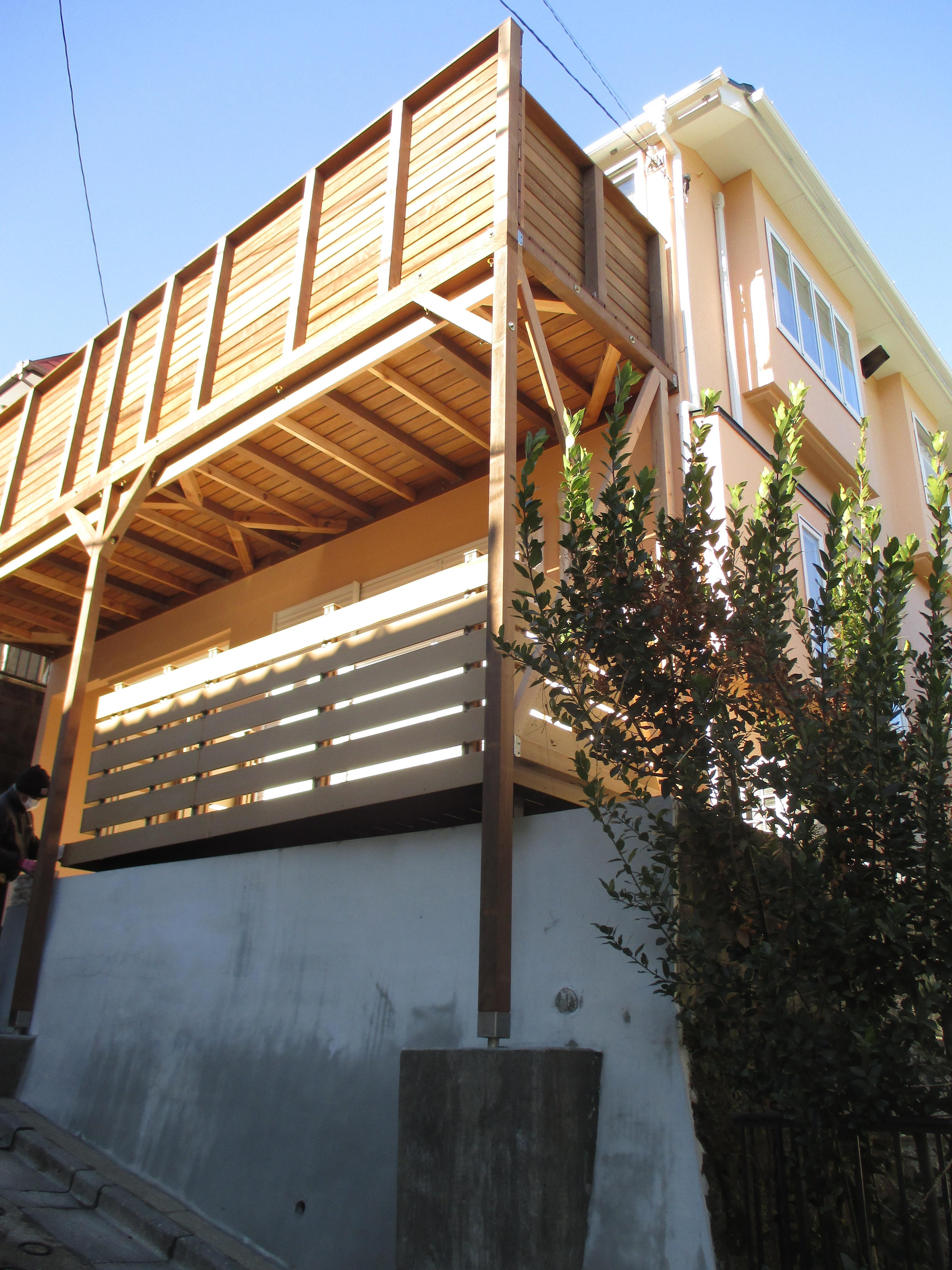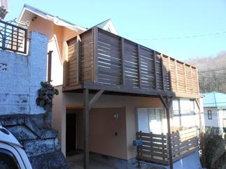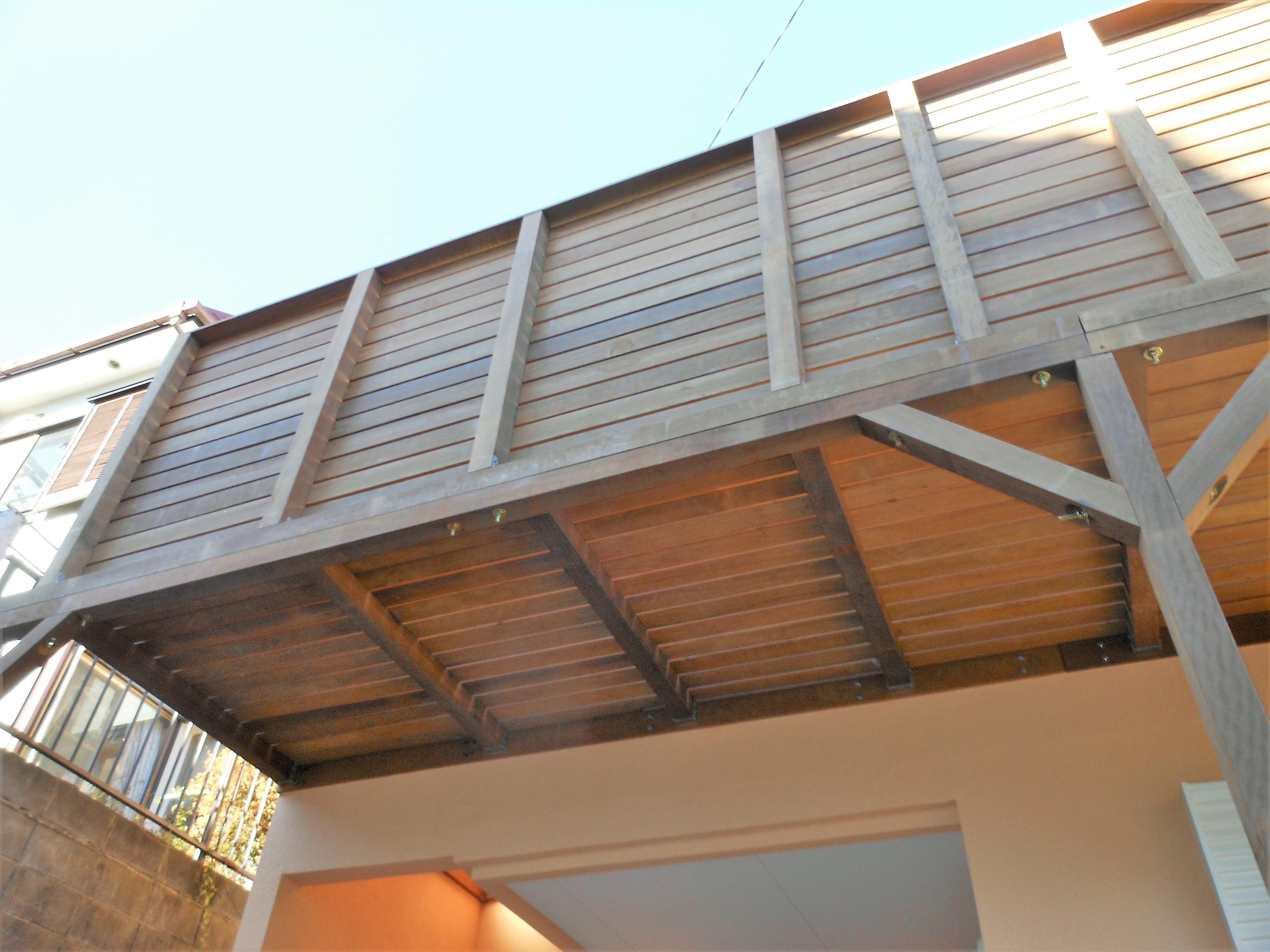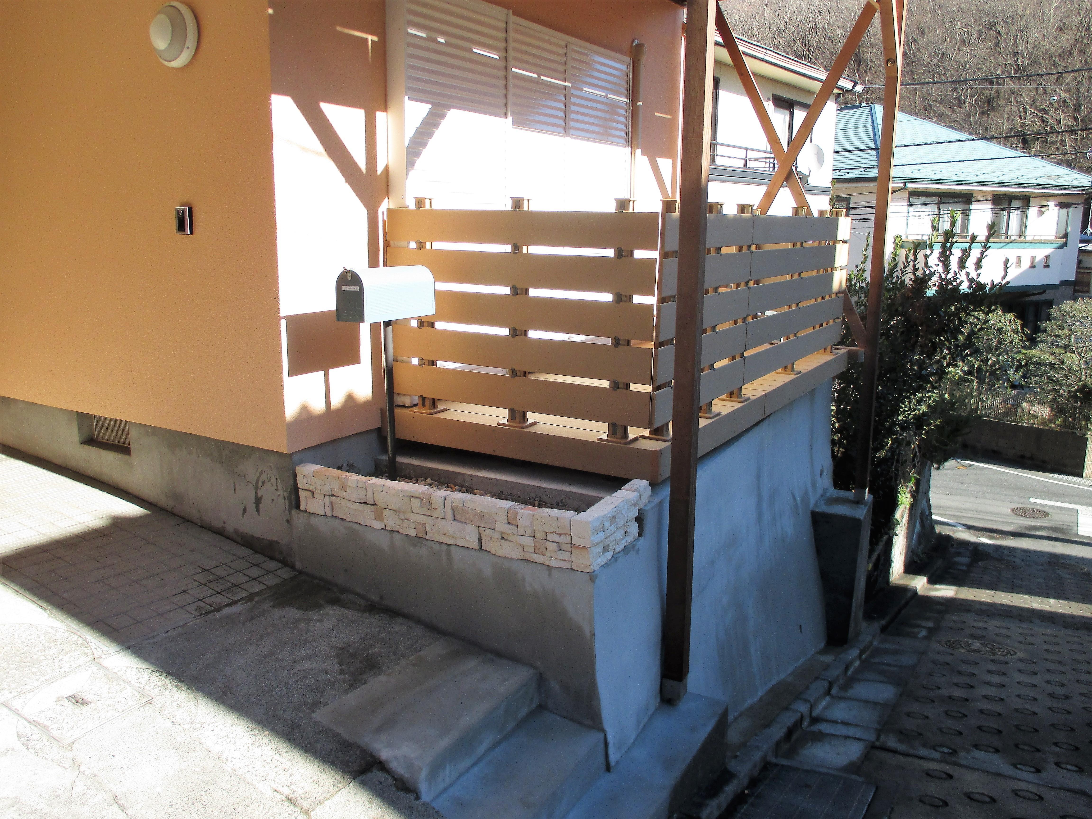 以前に室内の全面改装を承りましたお客様です。 今回は、外部の壁・屋根の塗装、玄関扉交換、懸案だったウッドデッキ工事をご注文いただきました。 お客様は、このウッドデッキには思入れがあり、メンテナンスのしやすさと、目隠し、 そして補強を含めてこだわりぬいて選ばれました。 最近は、アルミの材料も多いですが、柔らかさと手触りの点で、あえて木素材を使用いたしました。
