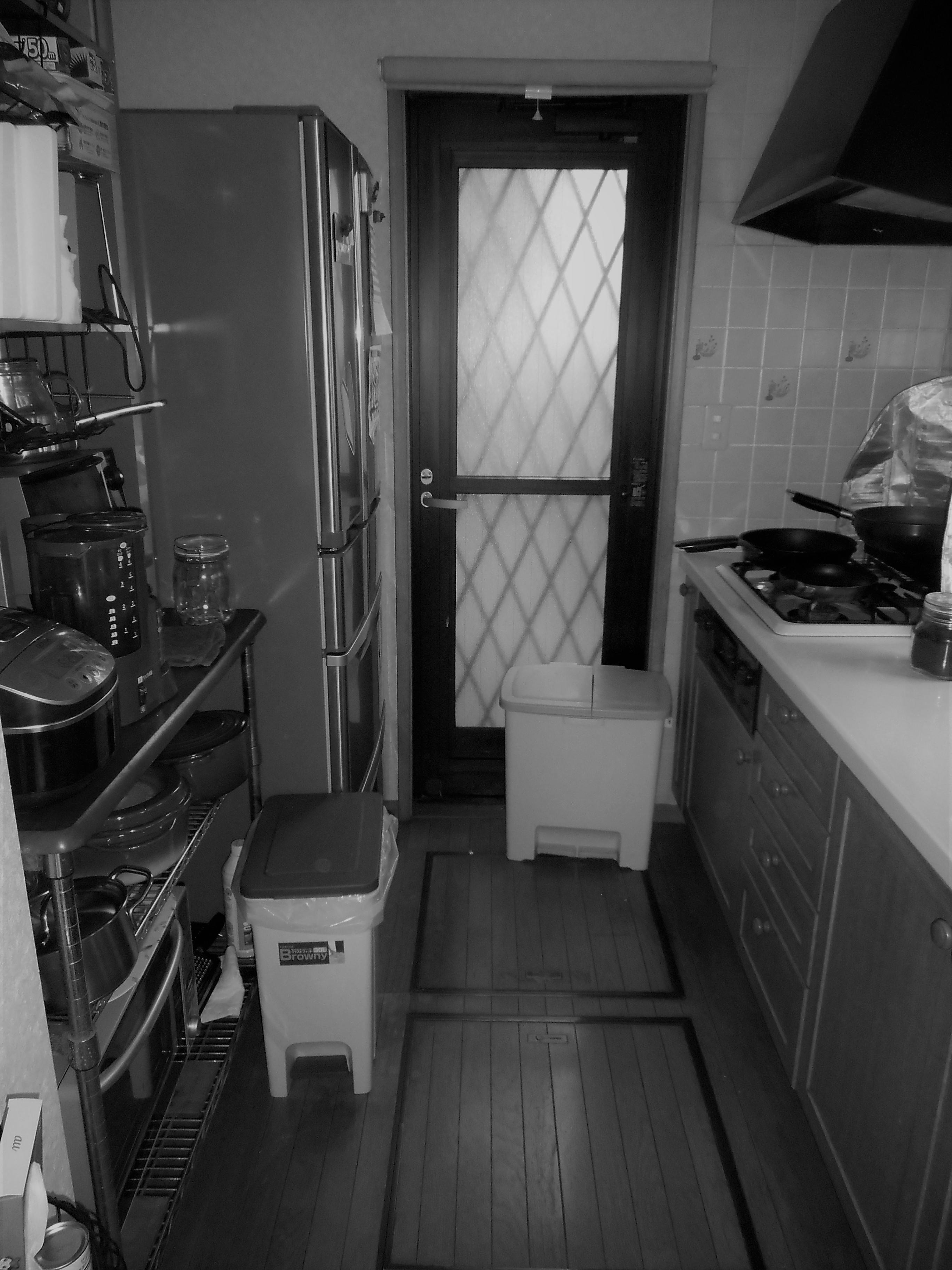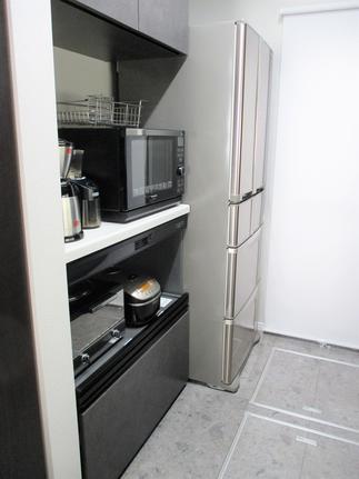 ウォールキャビネットとハイフロアキャビネット(家電収納)を設置し、必要な物以外は「見せない収納」を実現。見た目もスッキリしました。
