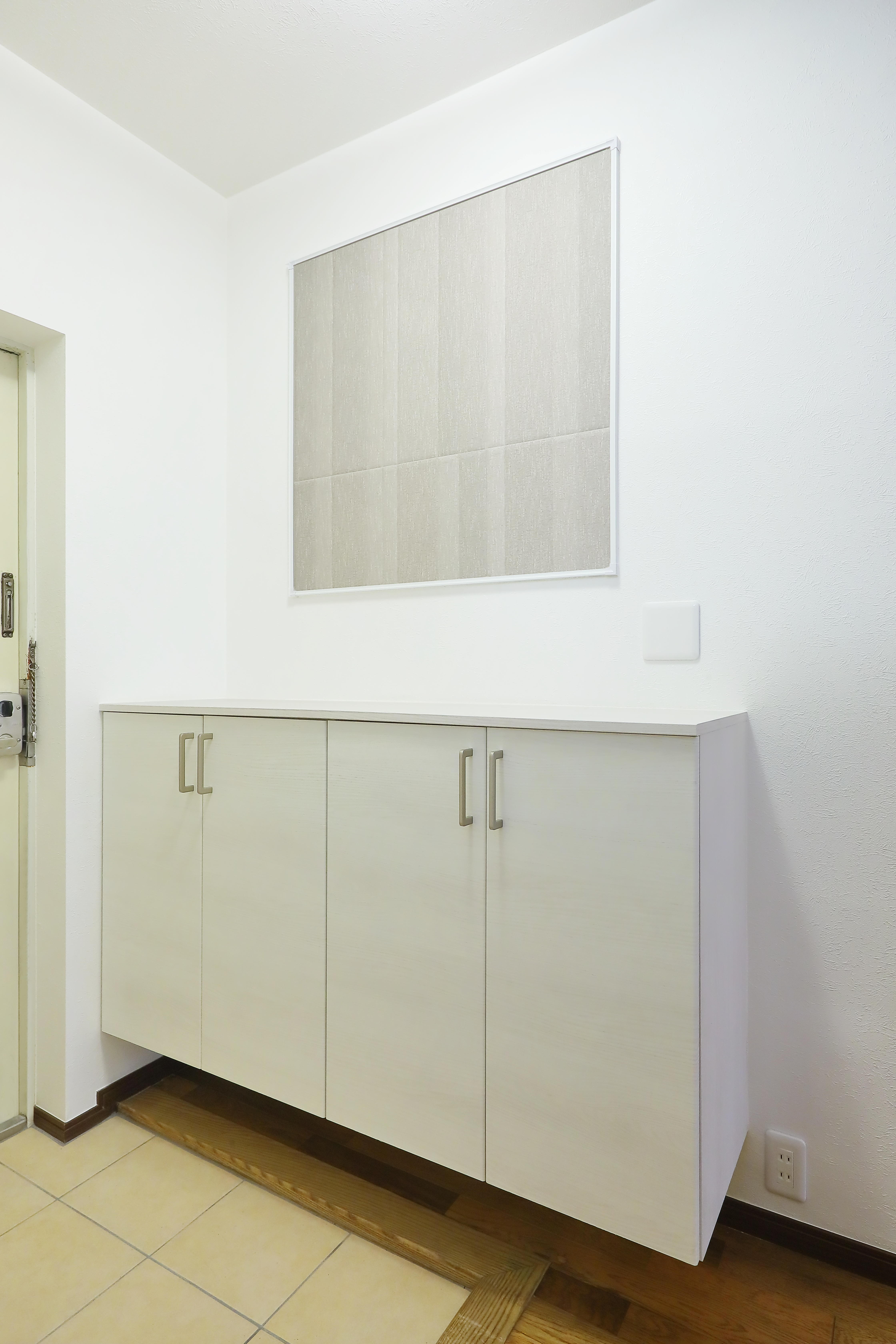 玄関収納もすっきりと。アクセントに調湿建材エコカラットを。