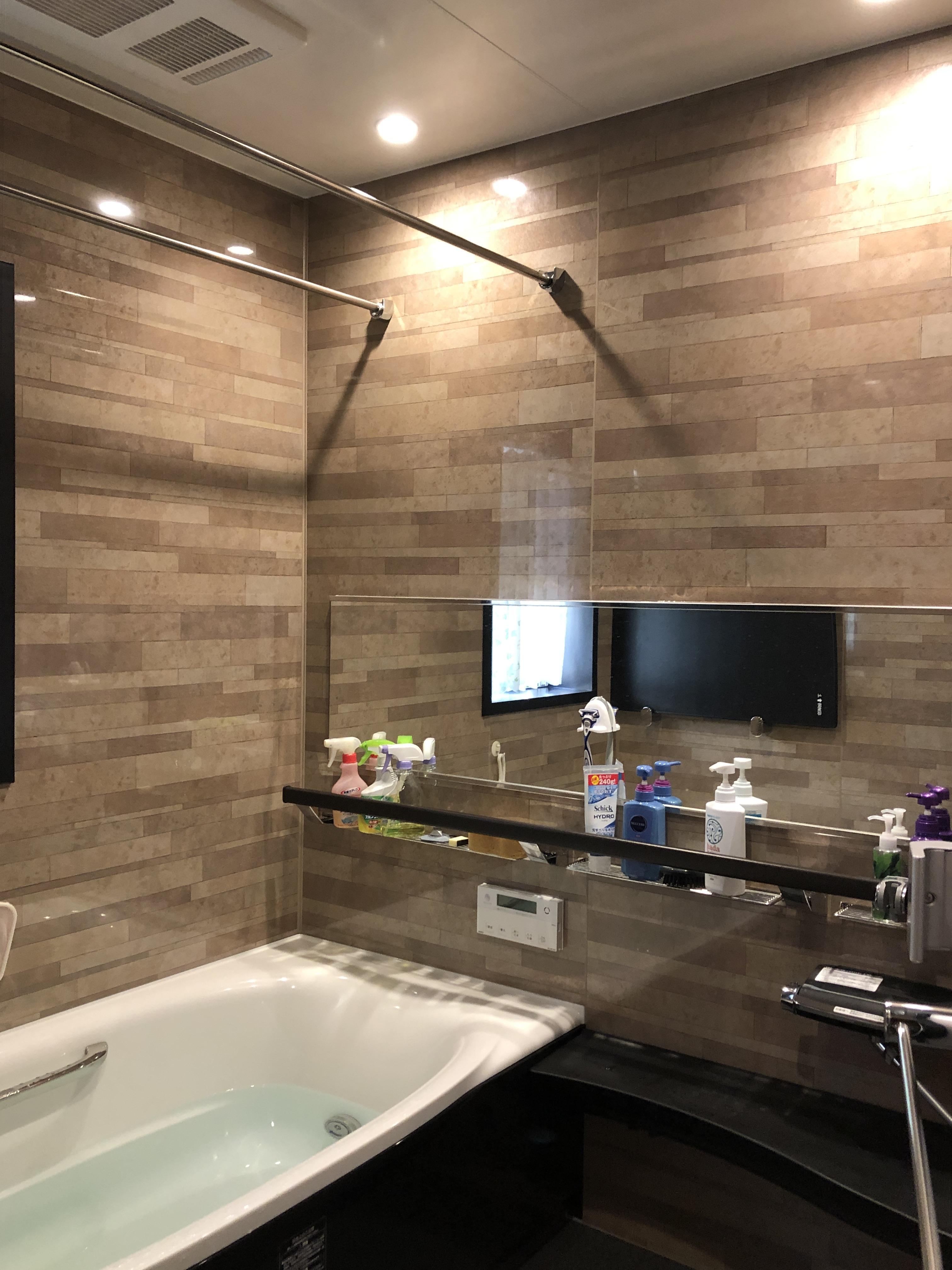 浴室は、LIXILの「アライズ」。天然石を再現した壁パネルで高級ホテルの様な落ち着いた雰囲気の空間へ変身しました。ランドリーパイプは、梅雨時期や雨の日の部屋干しに活躍します。最近では、ランドリーパイプを2本設置されるお客様が増えてきております。