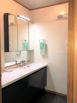 洗面化粧台は、LIXILの「ルミシス」をお選びいただきました。壁には、調湿機能が優れ、お手入れ簡単なLIXILの「エコカラットプラス」を採用し、湿気やカビ・ダニ問題を解消。黒色と白色の二色のモノトーンでまとめ、モダンなイメージに仕上がりました。