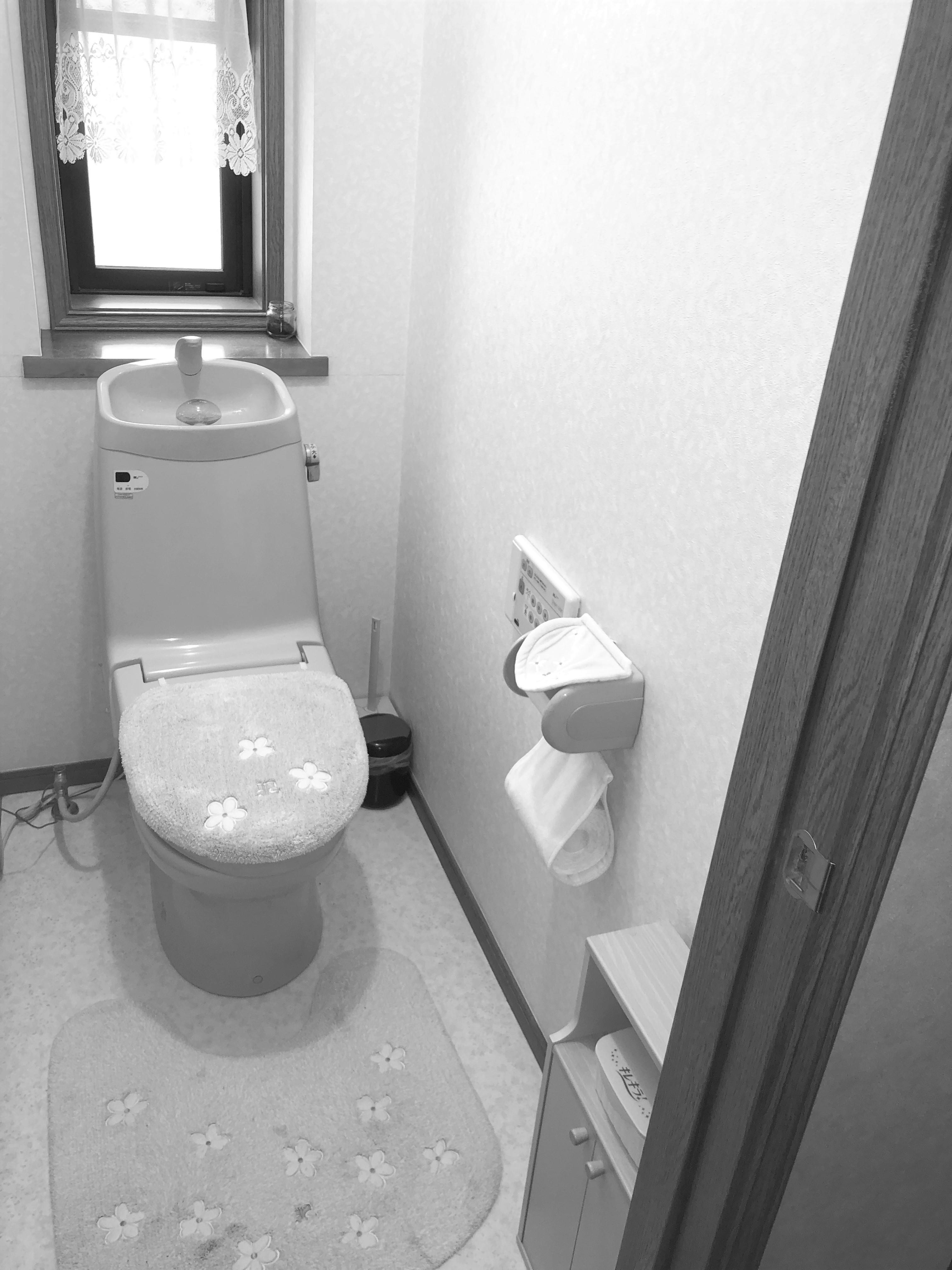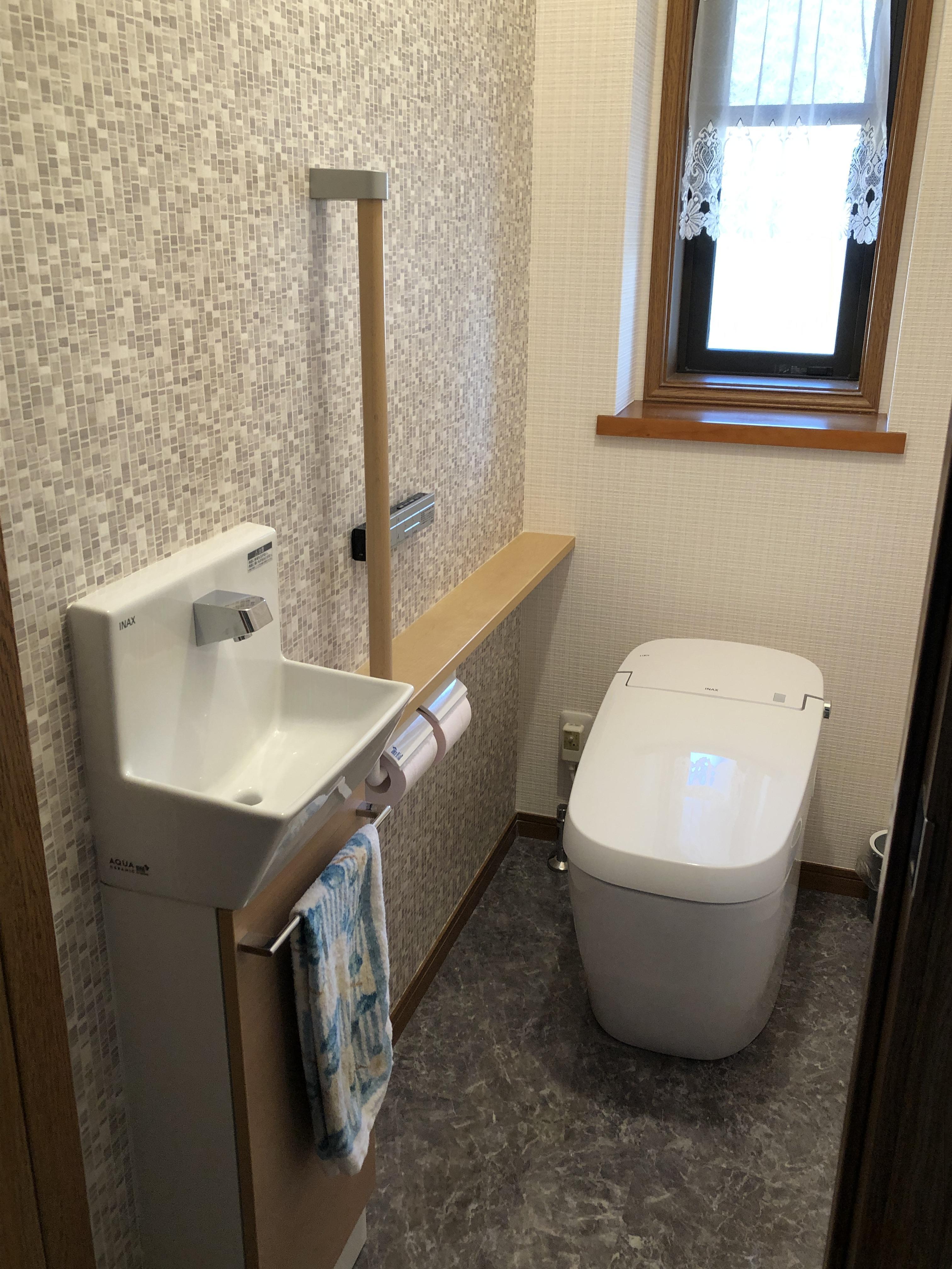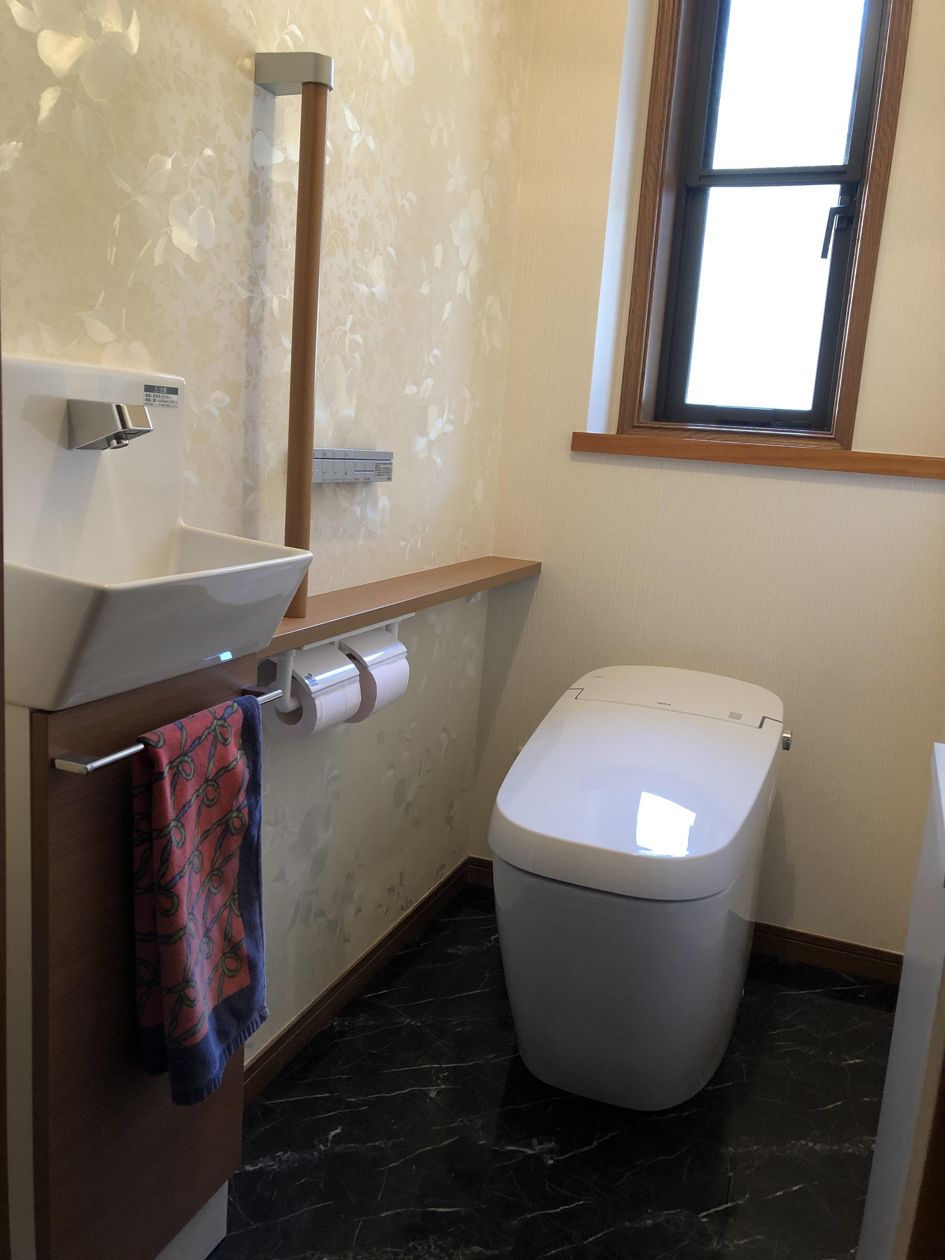 1Fと2Fのトイレは、LIXILの「サティス」。以前は、手洗付タンク式のトイレでしたが、今回、サティスのタンクレスにしたことにより、見た目がスッキリしました。1Fと2Fは、同じ商品を取り入れていますが、壁と床のデザインを変え、それぞれ違うイメージ空間が出来上がりました。
