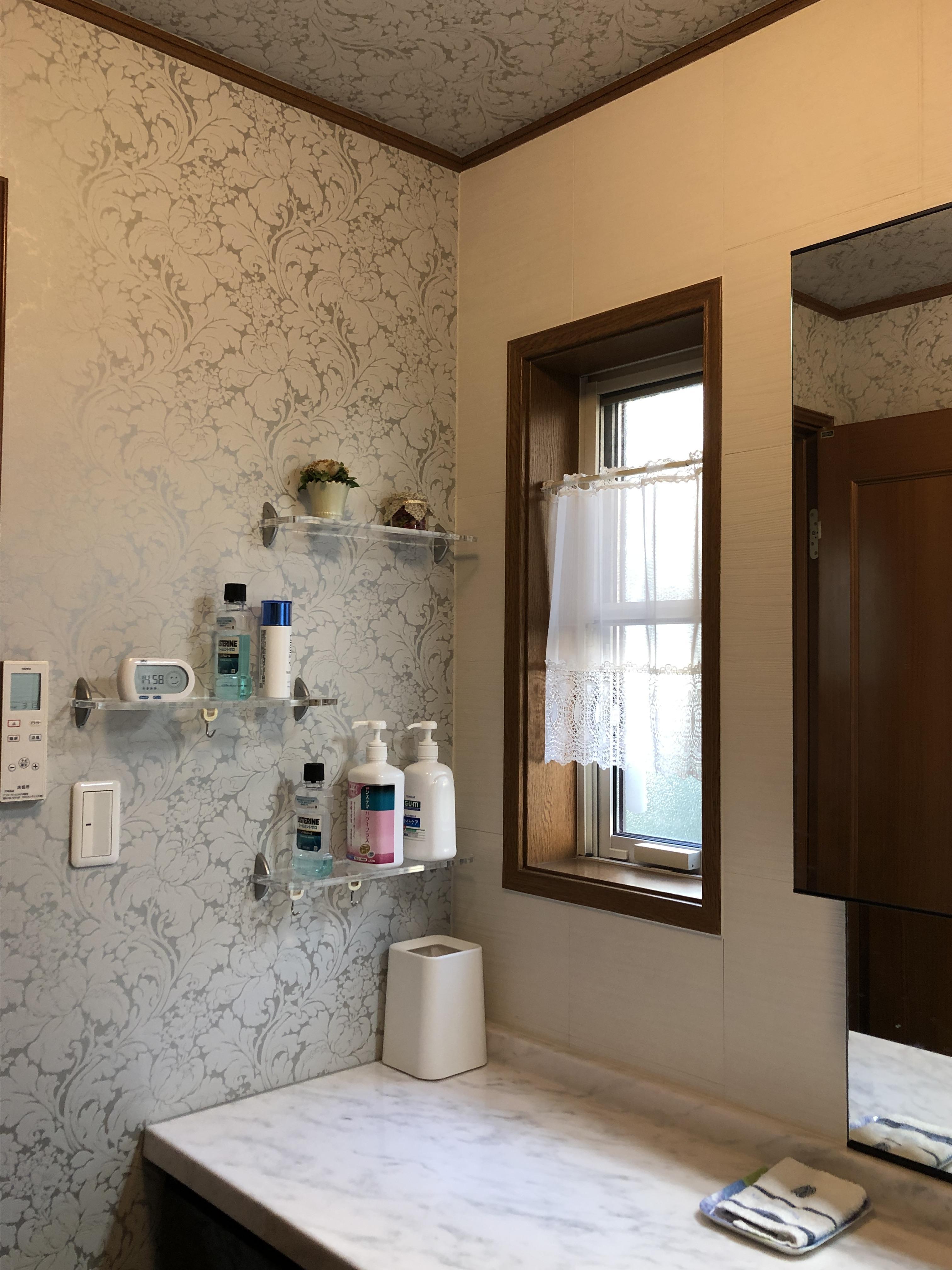 浴室側の壁と天井には、大柄模様のクロスでまとめました。シルバーと白色の花柄プリントのクロスを取り入れたことによって高級感あふれる洗面化粧室へと変わりました。
