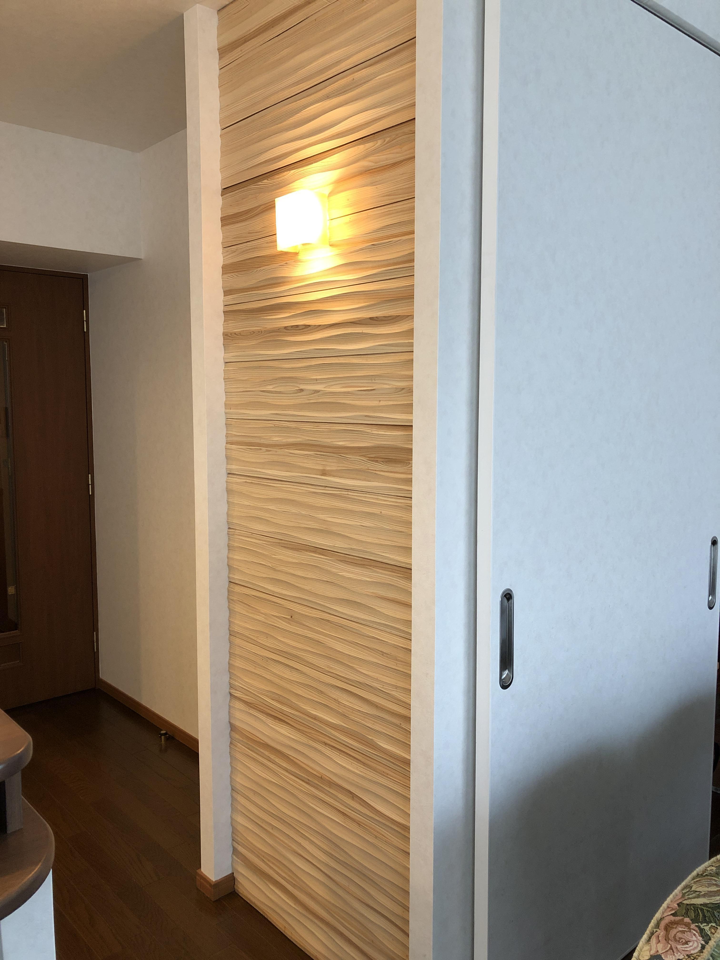 取れない壁8cm分に壁装飾朝日ウッドテックのクールジャパンを採用陰影のある壁材だから、ブラケットのほんわか明かりが、夜のお部屋空間を素敵にしてくれます。