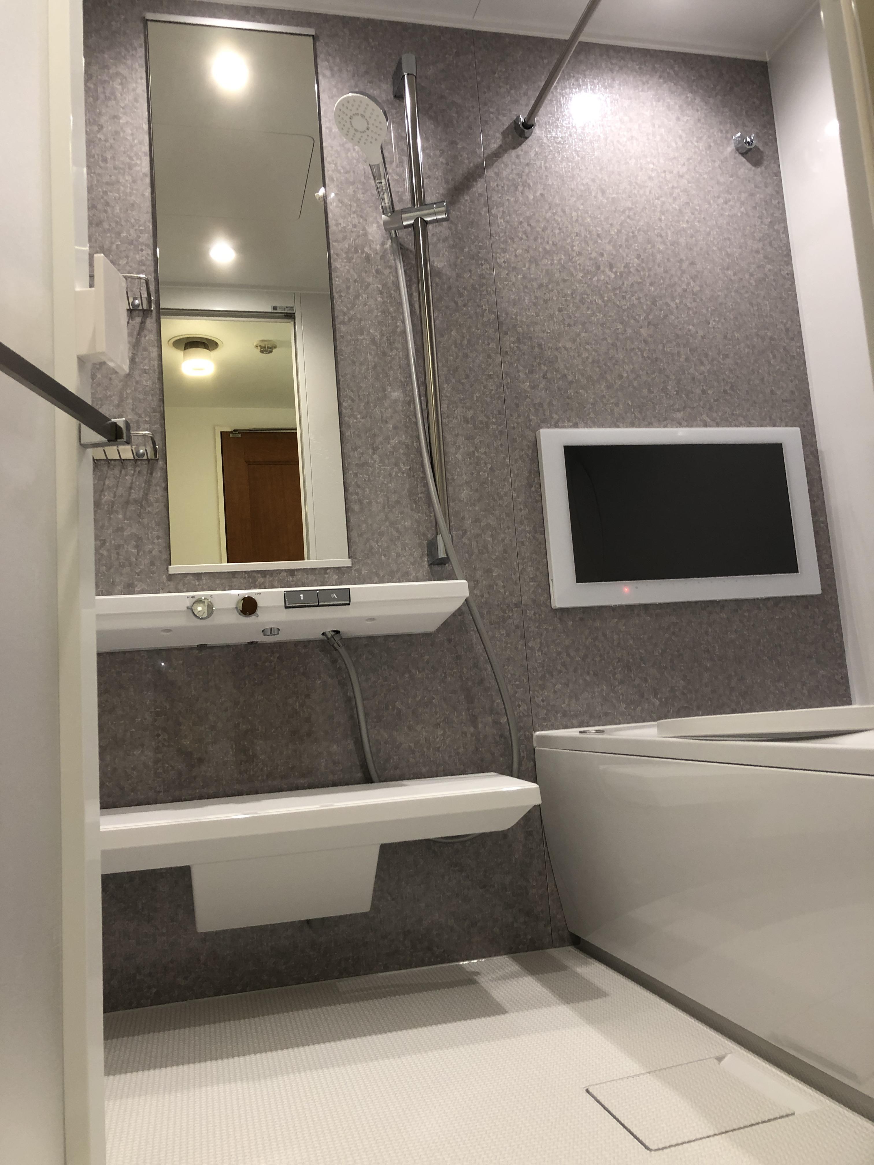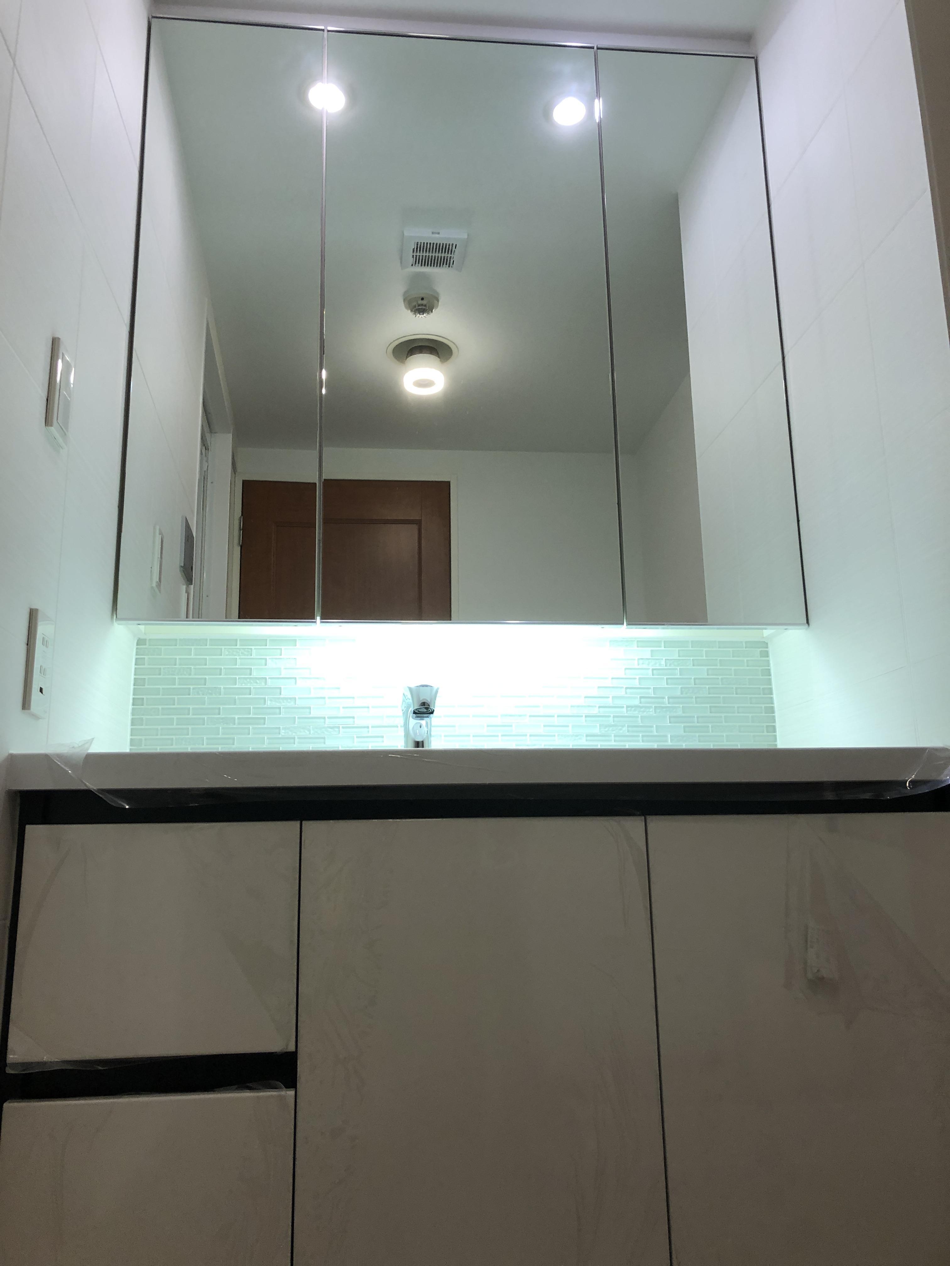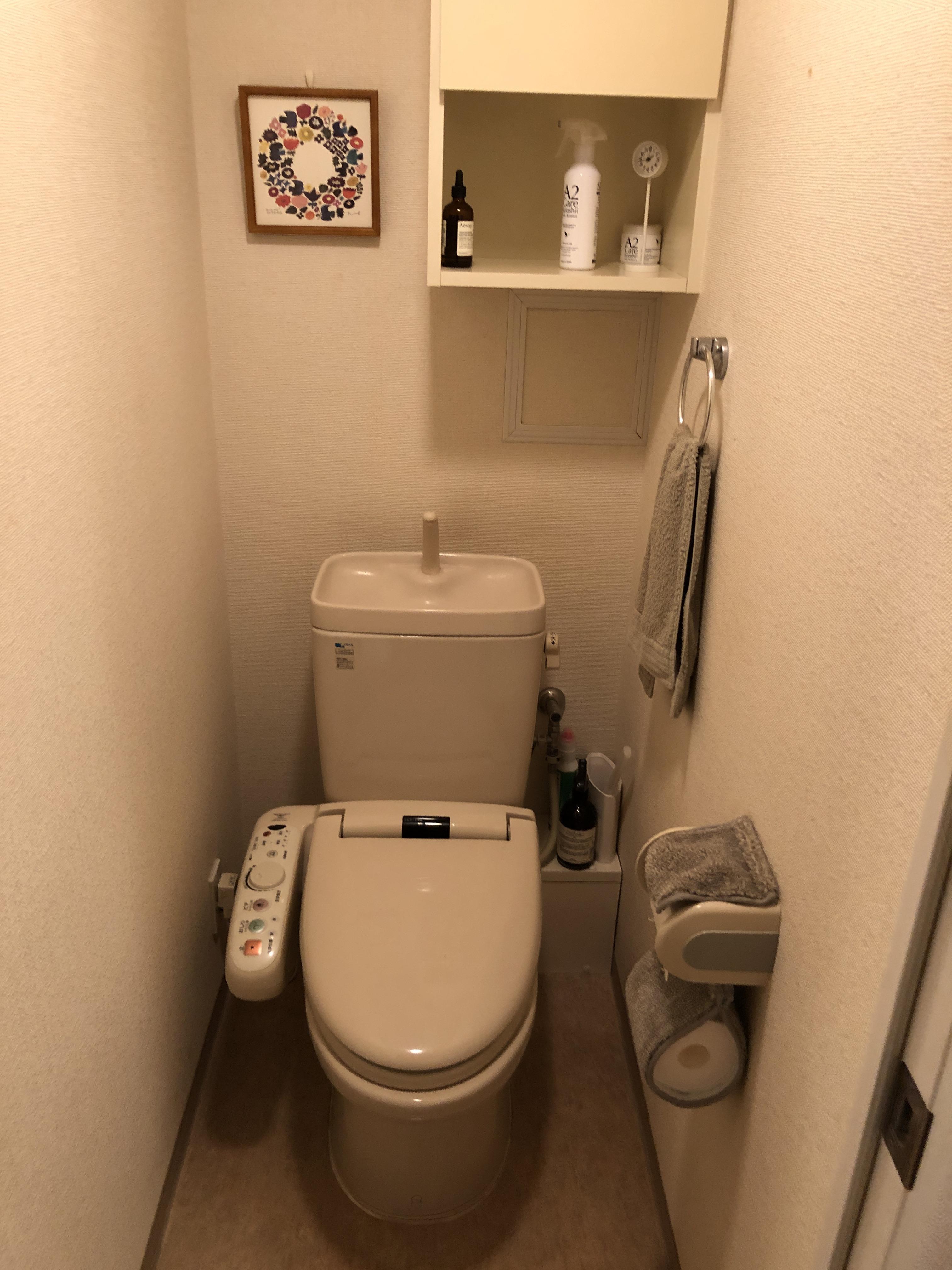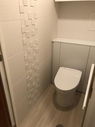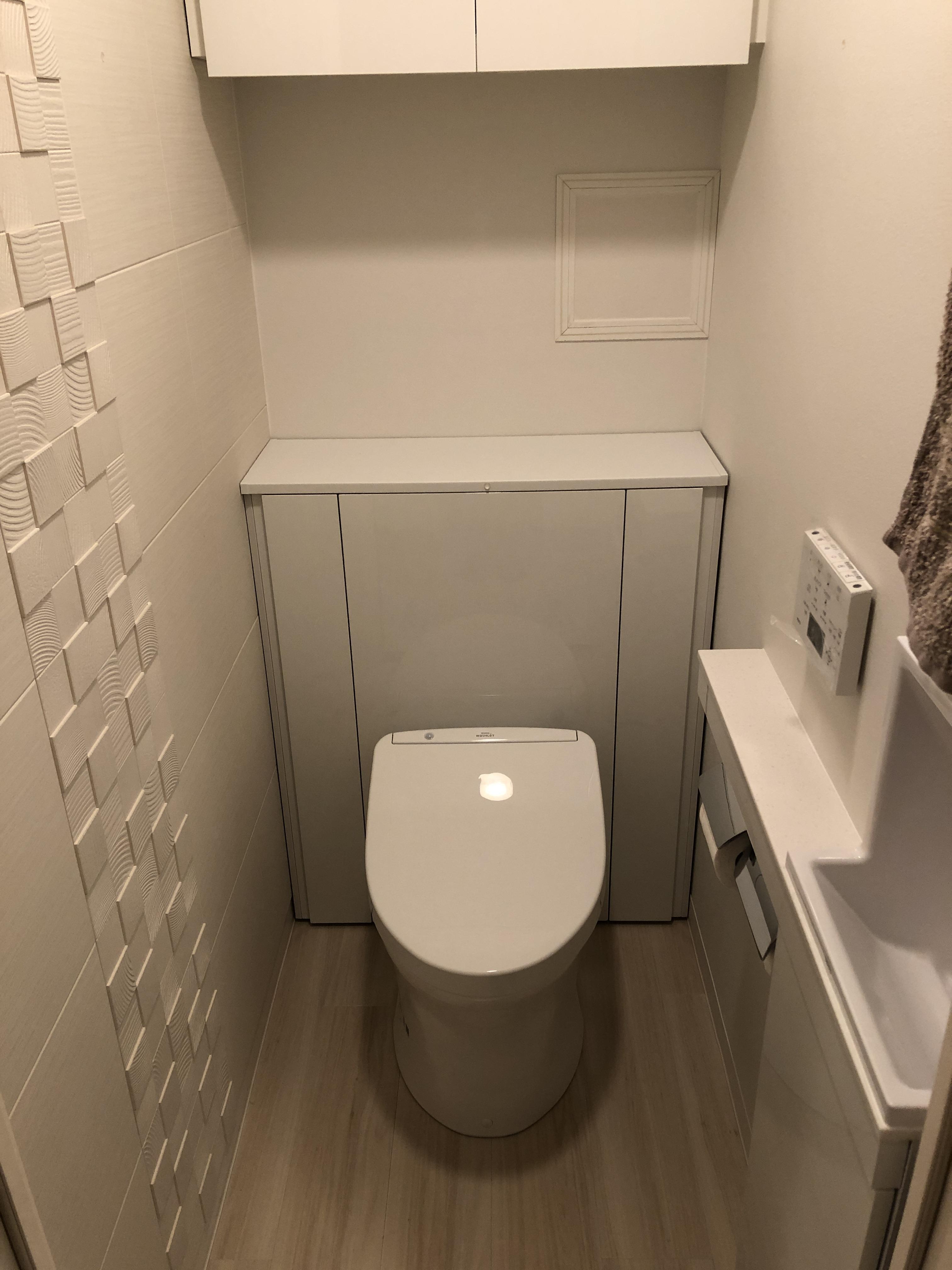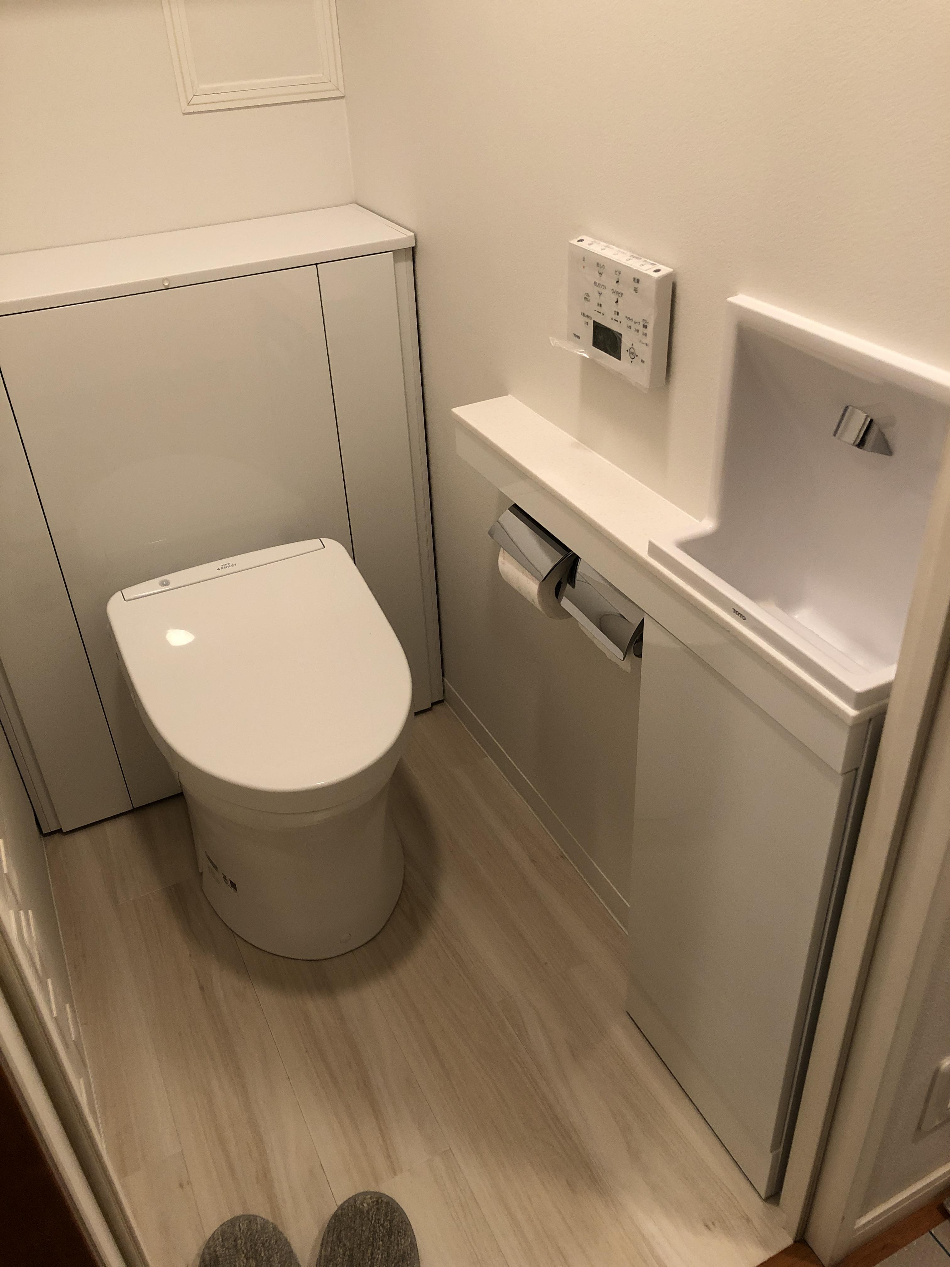 トイレの限られたスペースで手洗いを配置、細かいmm単位のお打合せをいたしました。ユニットバス交換時に排水給水電気工事をして手洗いを設置。半埋込タイプなので、壁からの出幅が少なく空間はスッキリ。収納も背面キャビネット+吊戸棚と増え、トイレットペーパーの買い置き、掃除用具収納も問題なしです。
