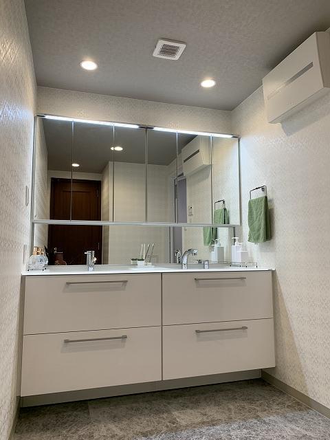 洗面の内装にはクロスの張替え、床材はフロアタイルを使用し、ダブルボウルの広い洗面台を採用しました