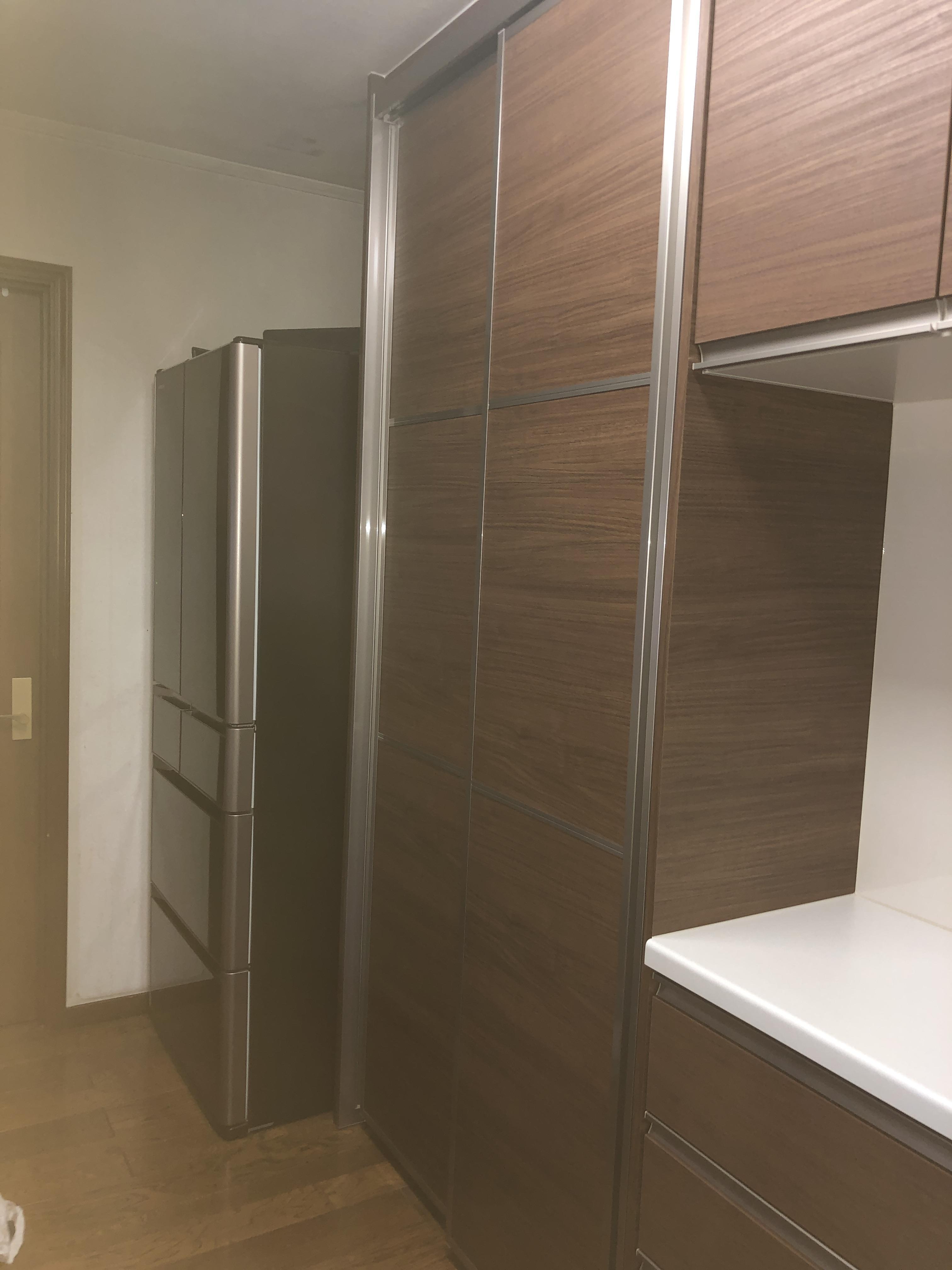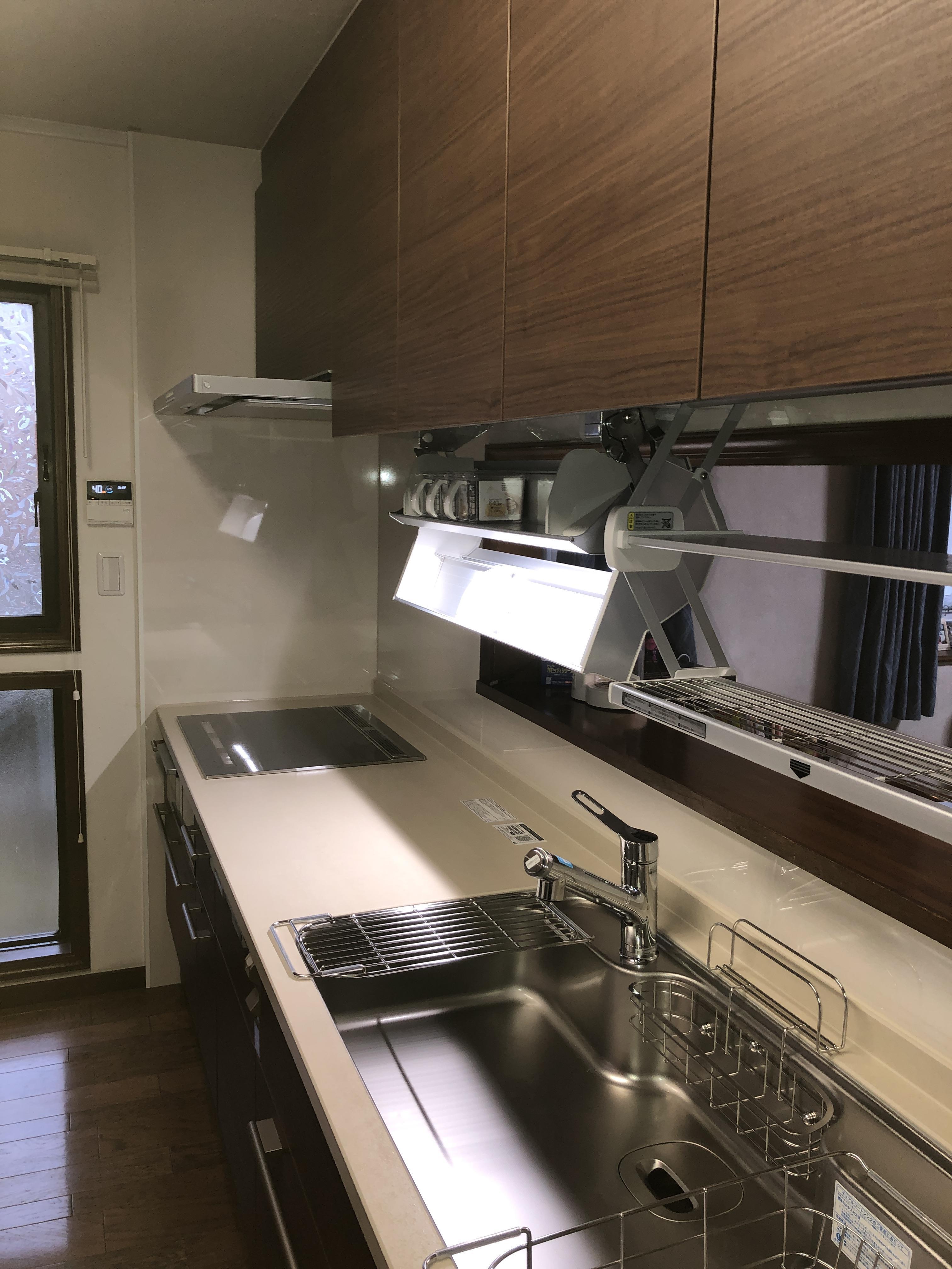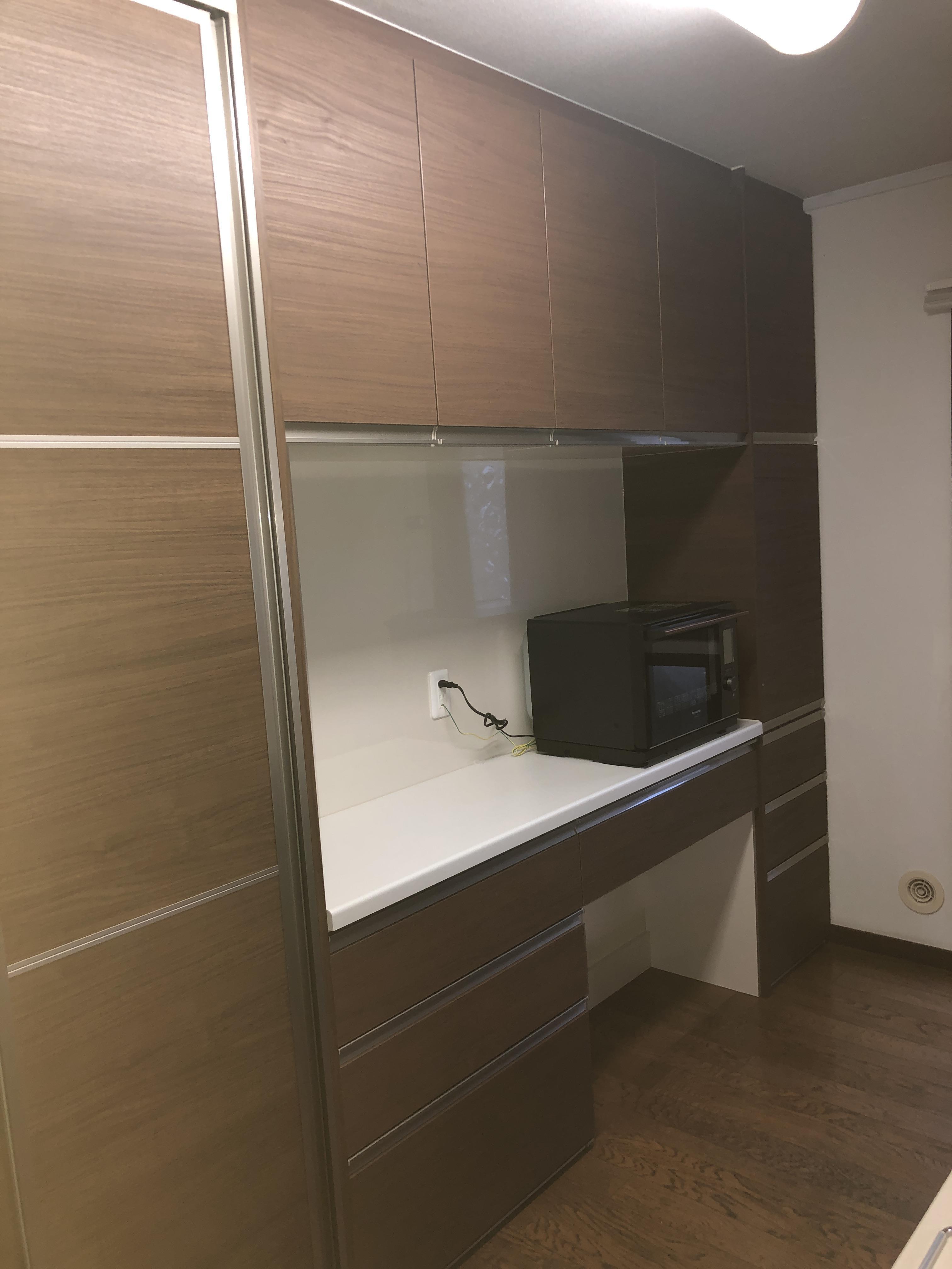 キッチンの背面に設置されている収納は今までの使い方のまま組み合わせ、キッチンと合わせたカラーで一体感のあるキッチンスペースになりました