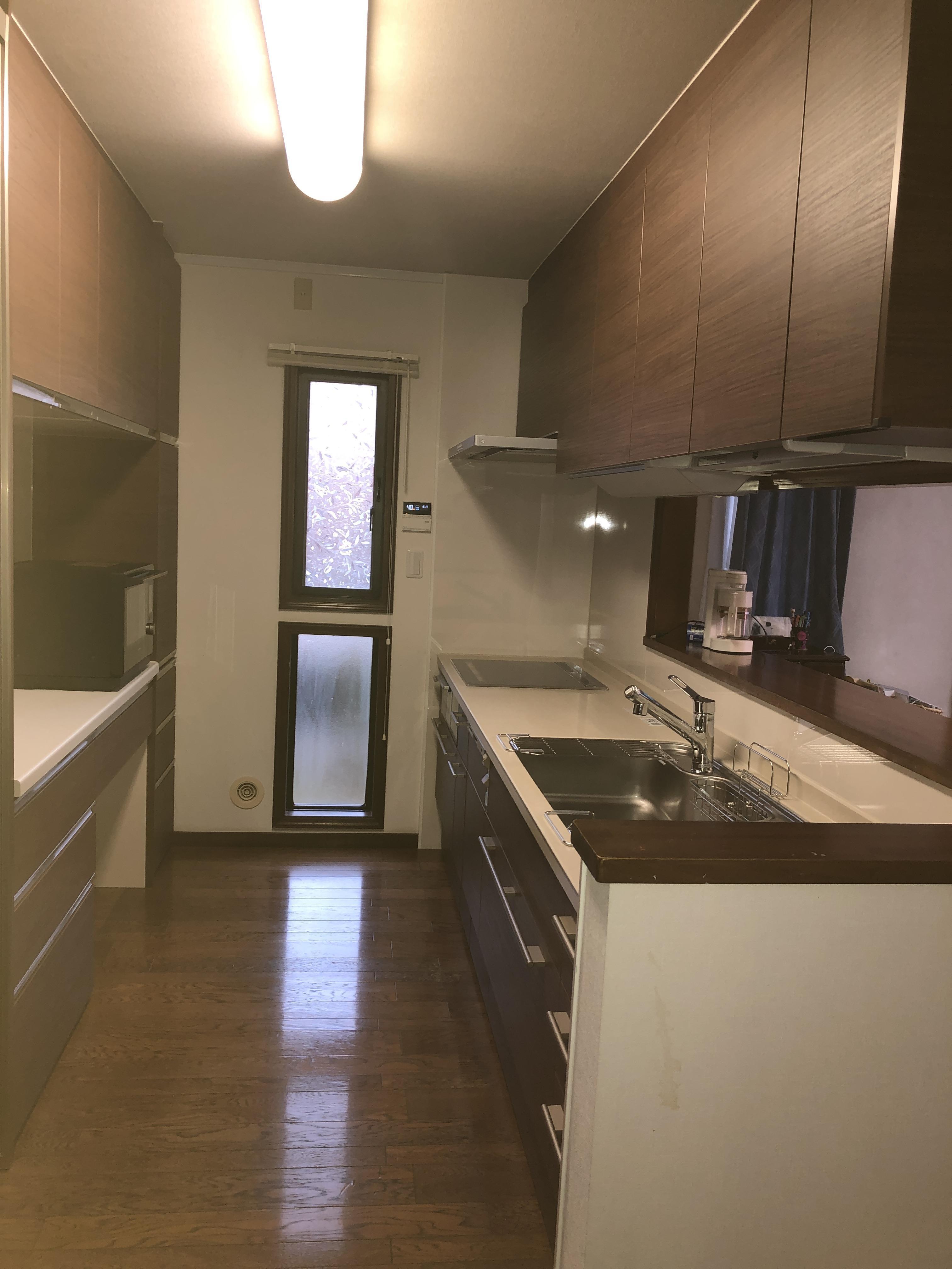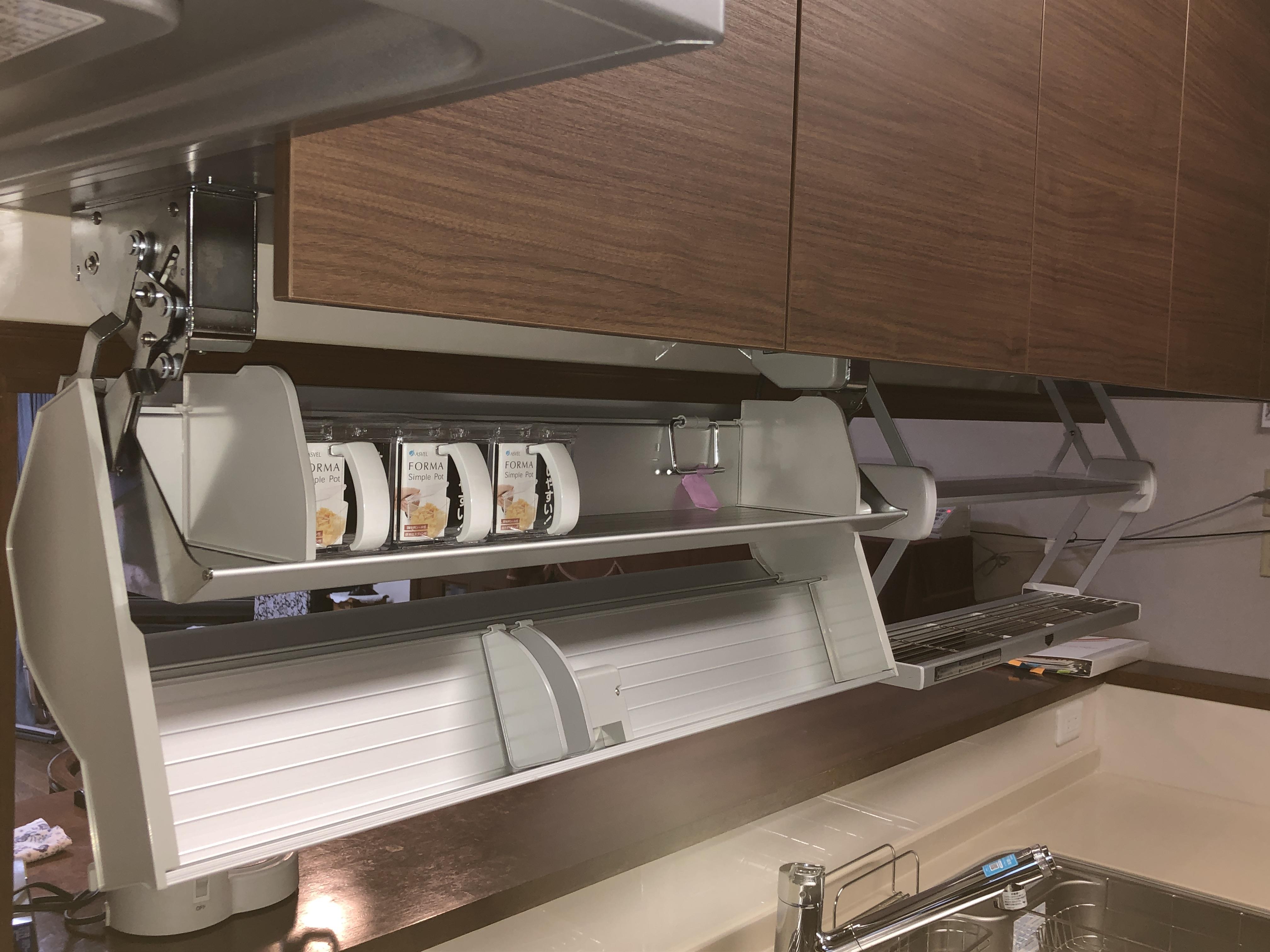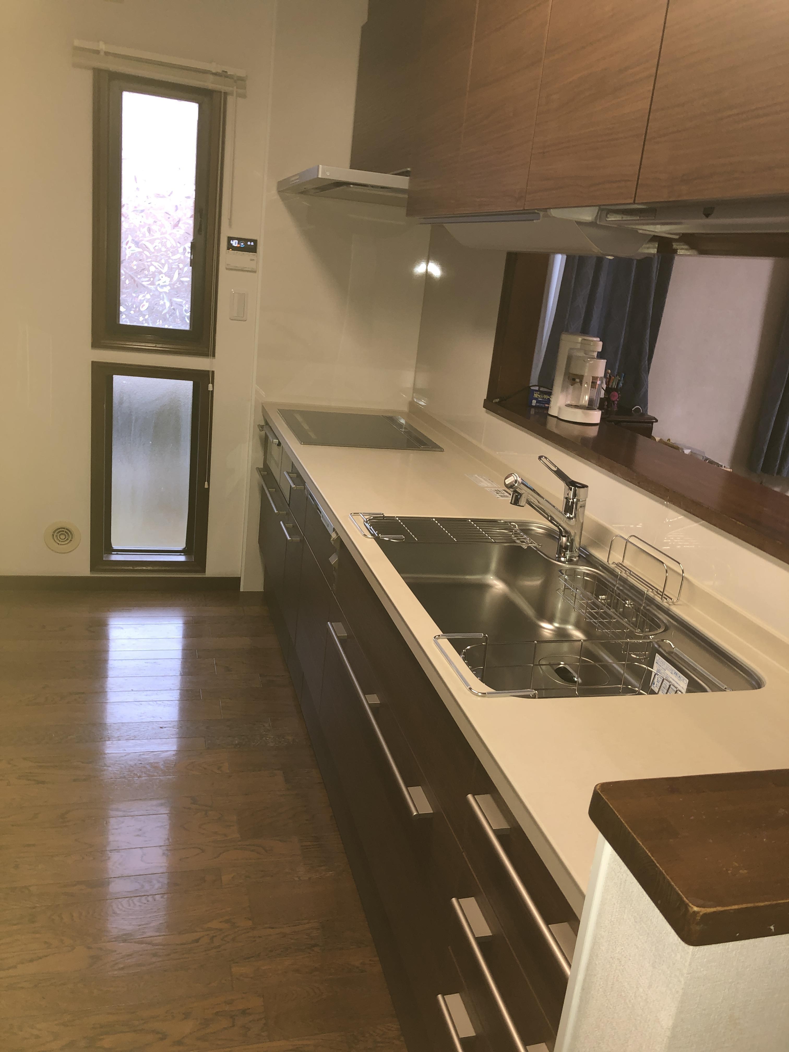 キッチンの背面に設置されている収納は今までの使い方のまま組み合わせ、キッチンと合わせたカラーで一体感のあるキッチンスペースになりました