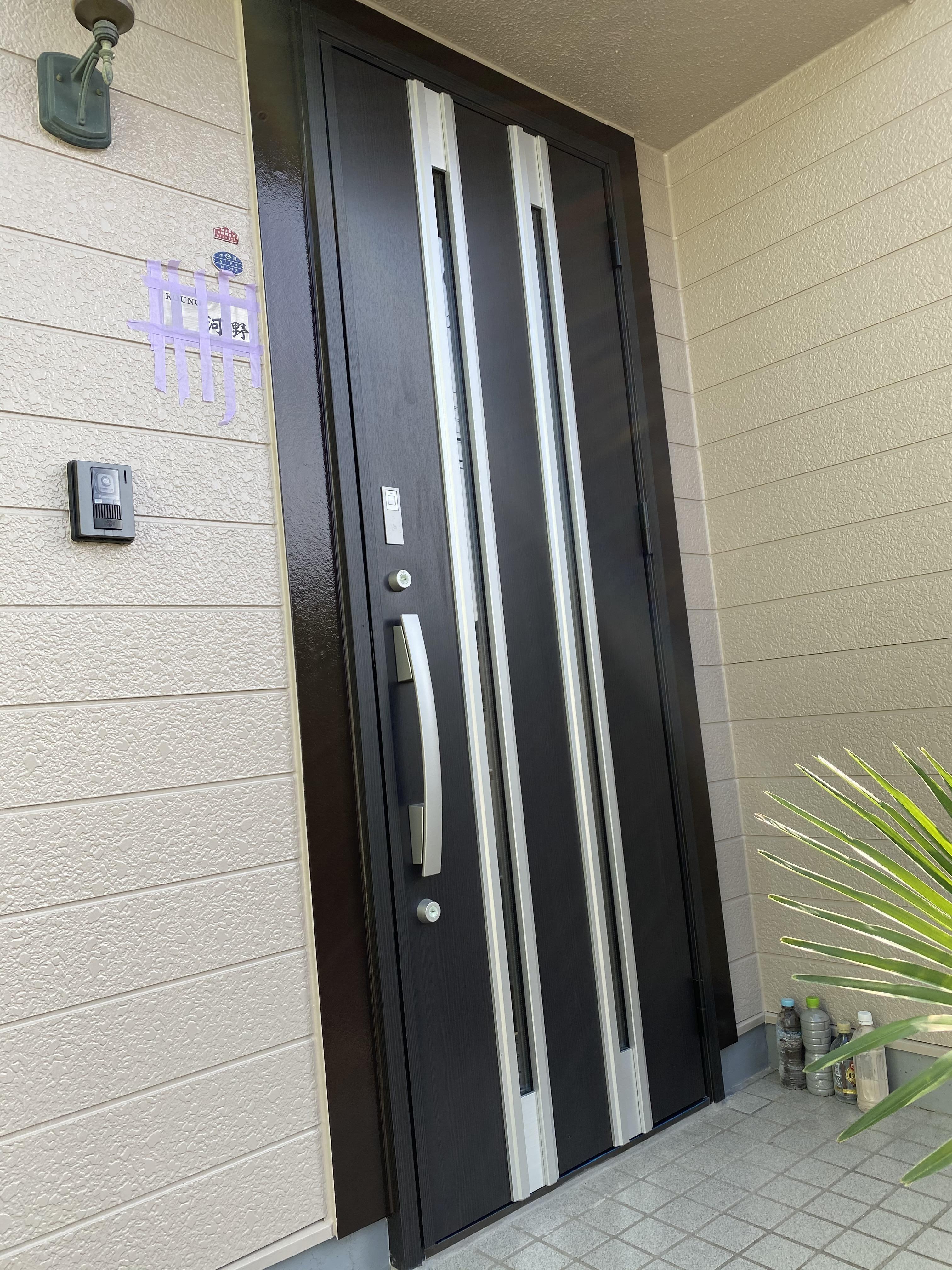 今回は玄関ドアの取替えを行いました玄関ドアのカバー工事では開口部が少し小さくなってしまうためご自宅によっては困り事が出る場合がございますその場合は壁をカットし新しい玄関ドアを取り付けることで開口を気にせず施工ができます玄関周りはモール材をしようし玄関ドア周りに額縁が付くように仕上げました玄関ドアは従来のものより断熱性能に優れ室内をより快適に、ガラス付きなので室内の明り取りもできますリモコンキーで出入りも簡単になりました