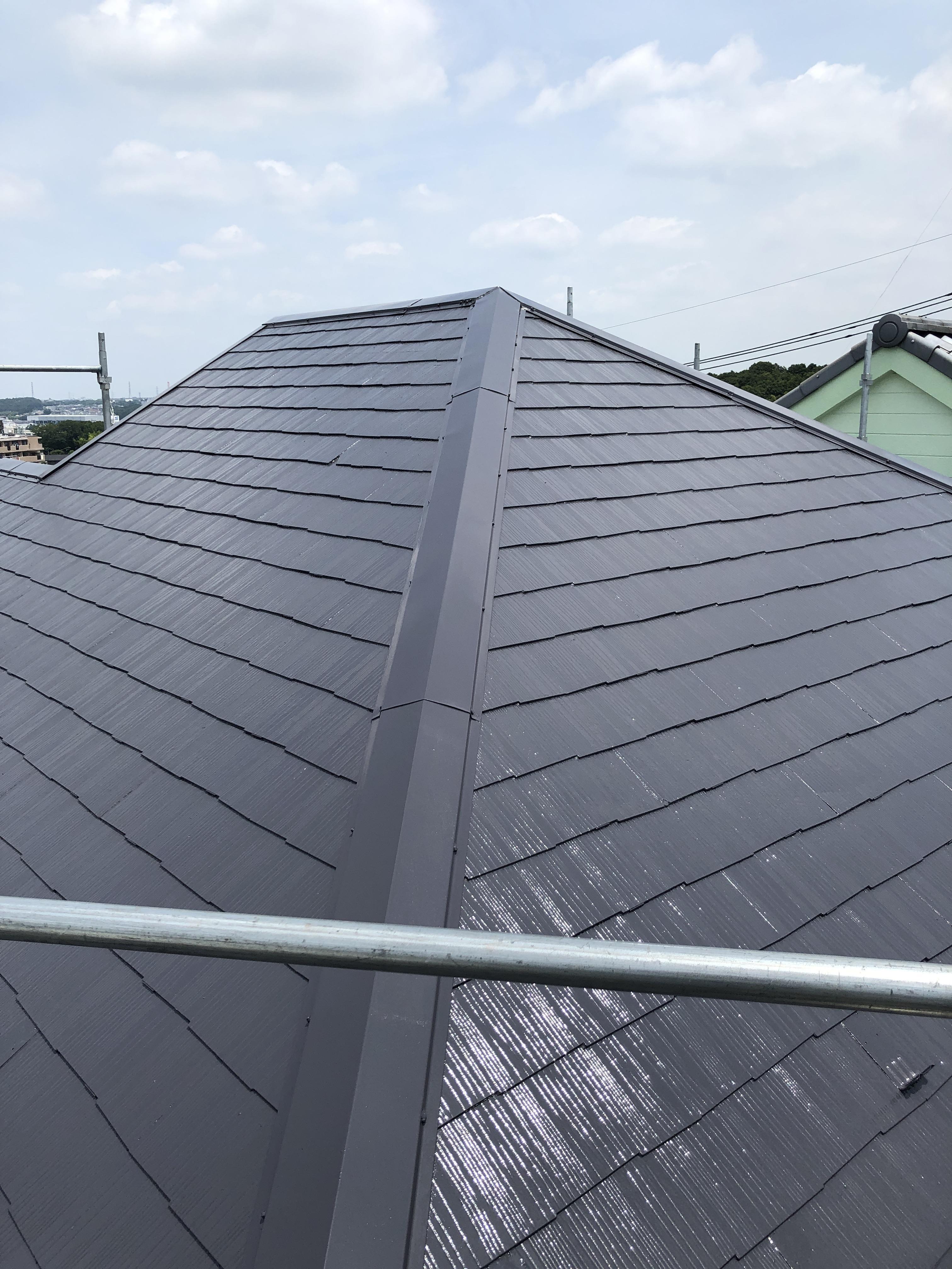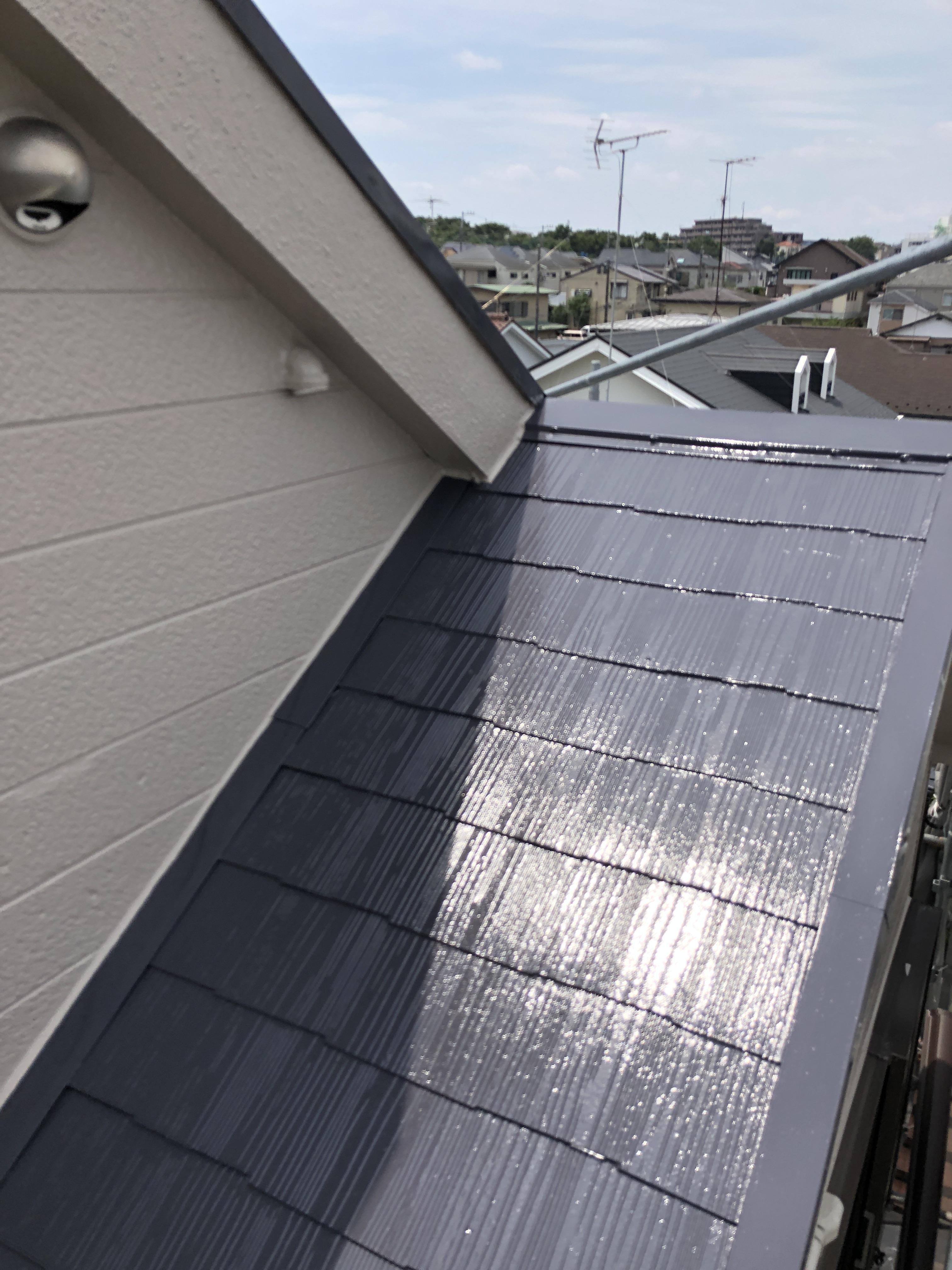 2階にある小屋裏部屋で少しでも暑さを軽減できるよう遮熱塗料を使用しましたフッ素塗料なので耐久性も問題ありませんコロニアル屋根の塗装工事の際は上塗り作業完了後に縁切りができているかしっかりと確認しましょう屋根材自体に防水効果を持たせるのはもちろん水の流れ道もしっかり作ってあげることが重要です