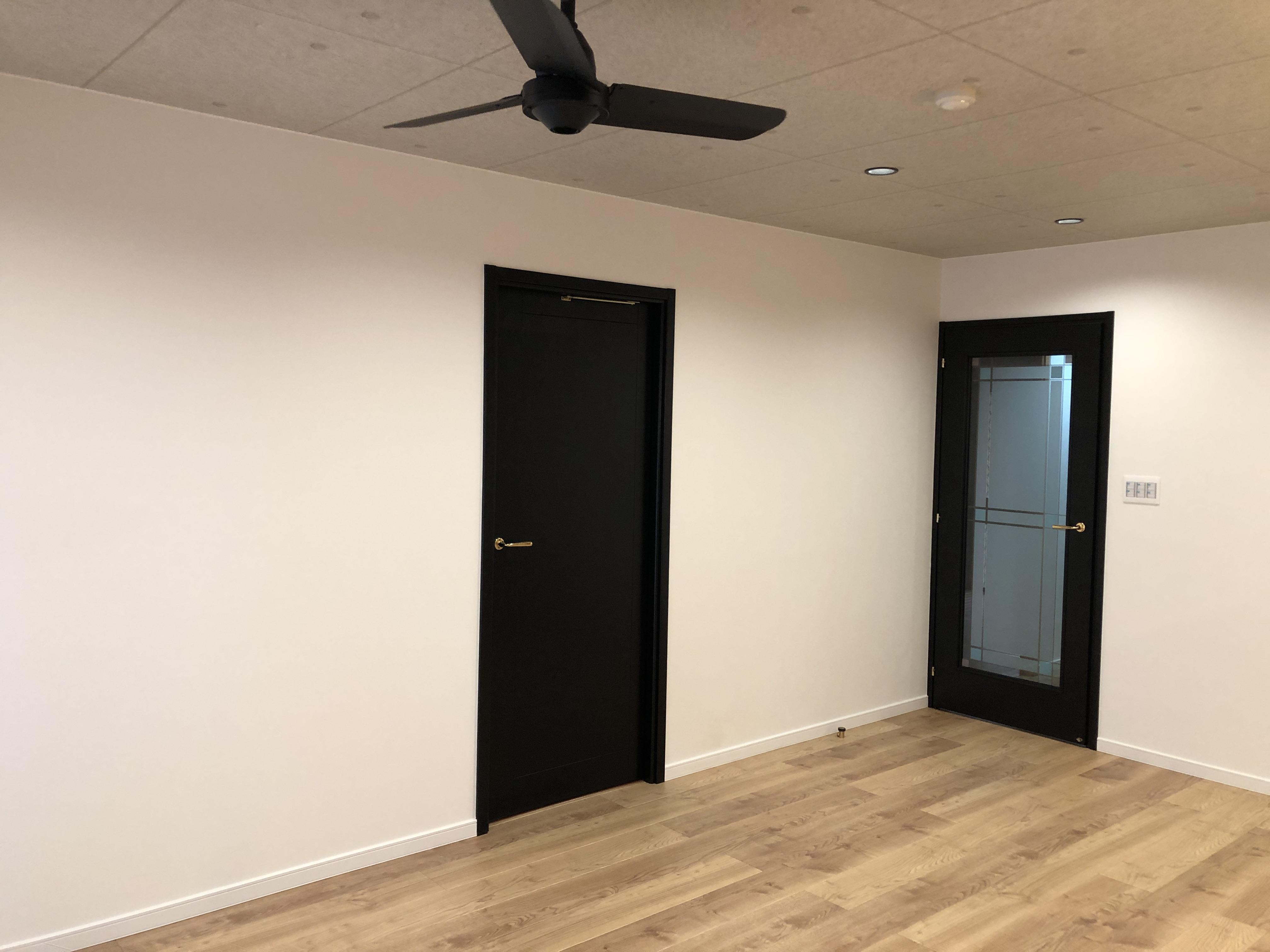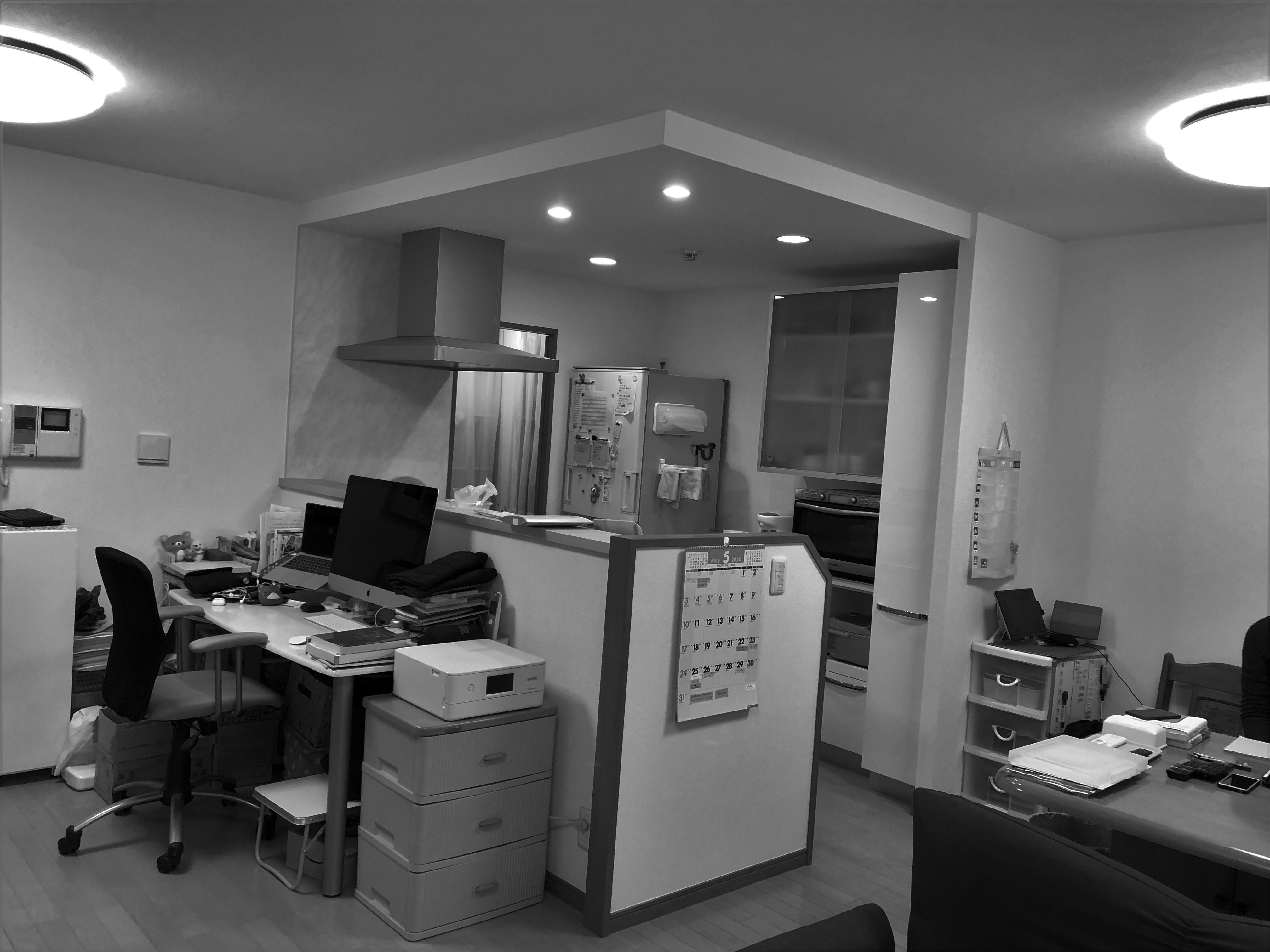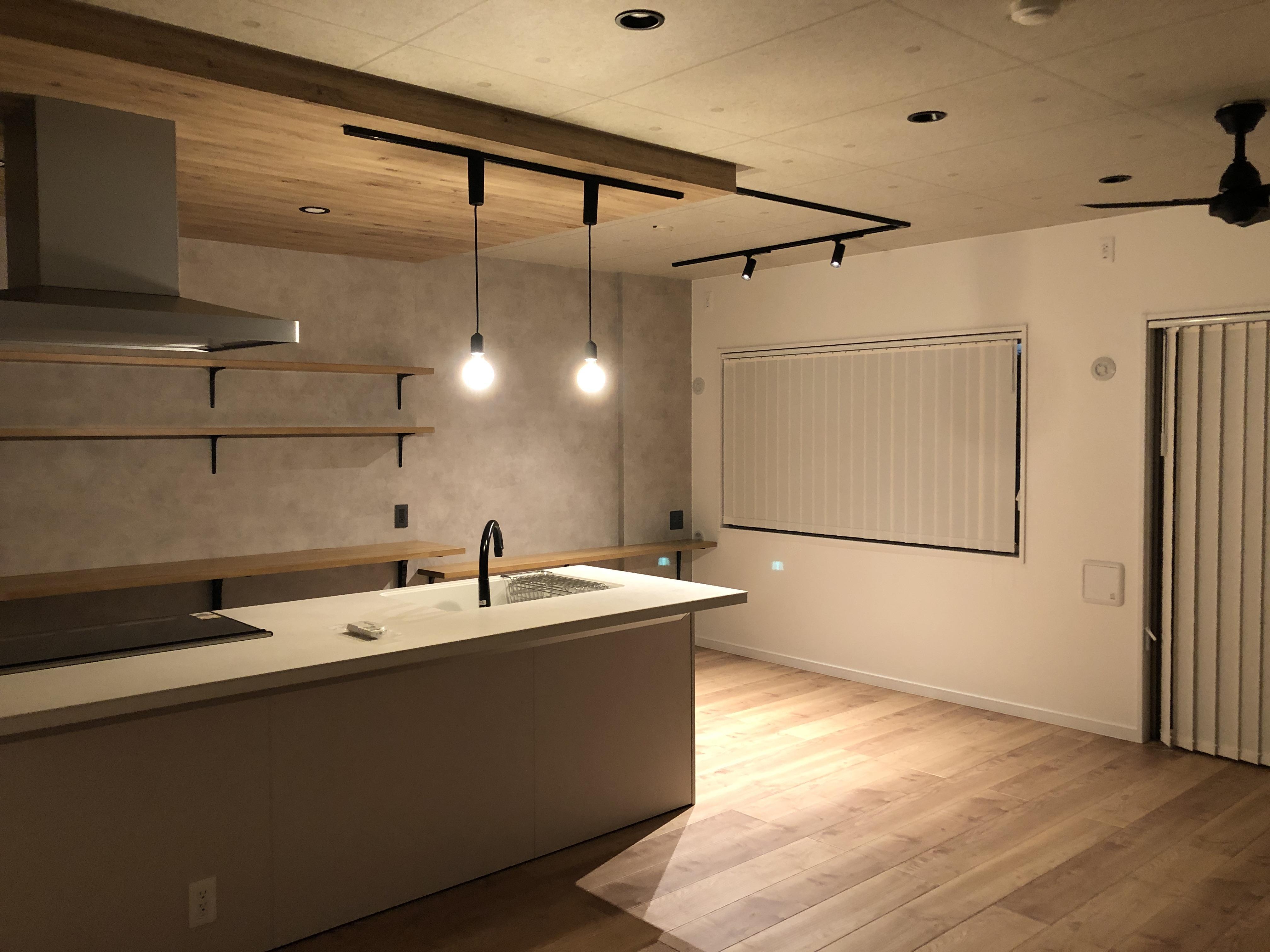 室内ドアはブラックに塗装シーリングファンもブラックに統一しましたドアに合わせてドア枠は艶消しのブラックに塗装処理を行い、マッドな仕上がりにしておりますリビングダイニングの空間に木目のフローリング材、コンクリート調の天井、黒のアクセントとどれをとっても印象的な空間で大満足なリビングダイニングになりました