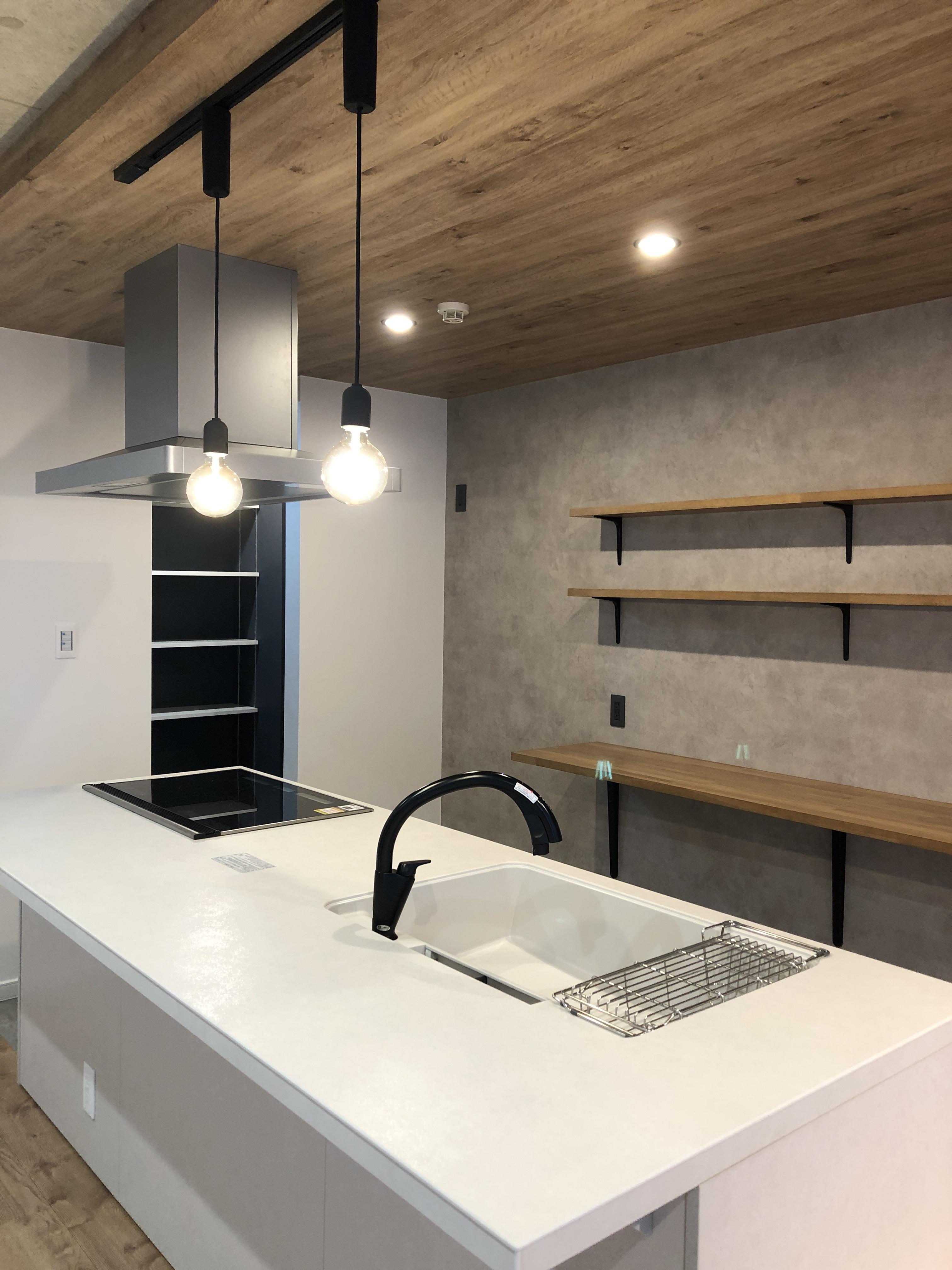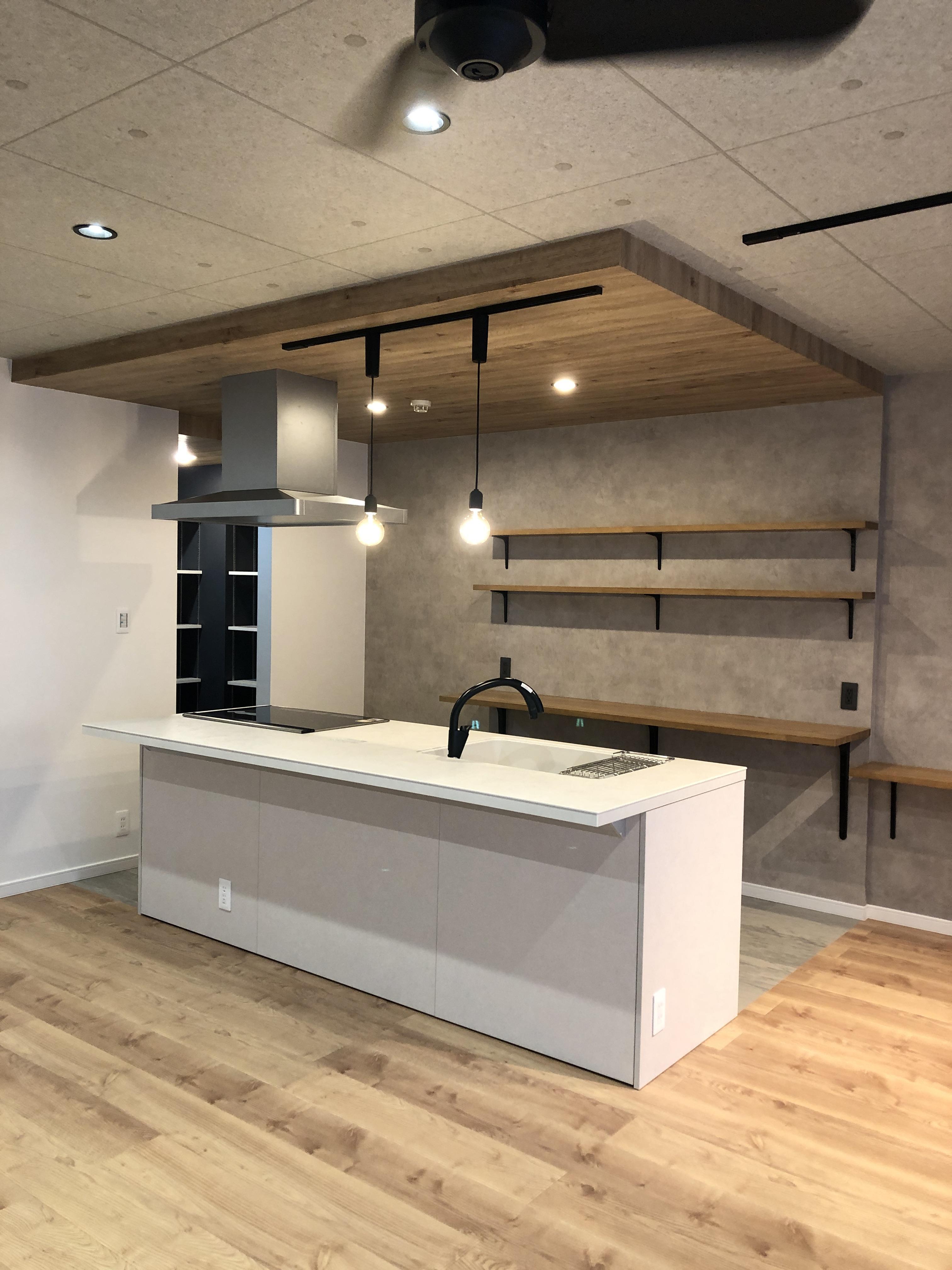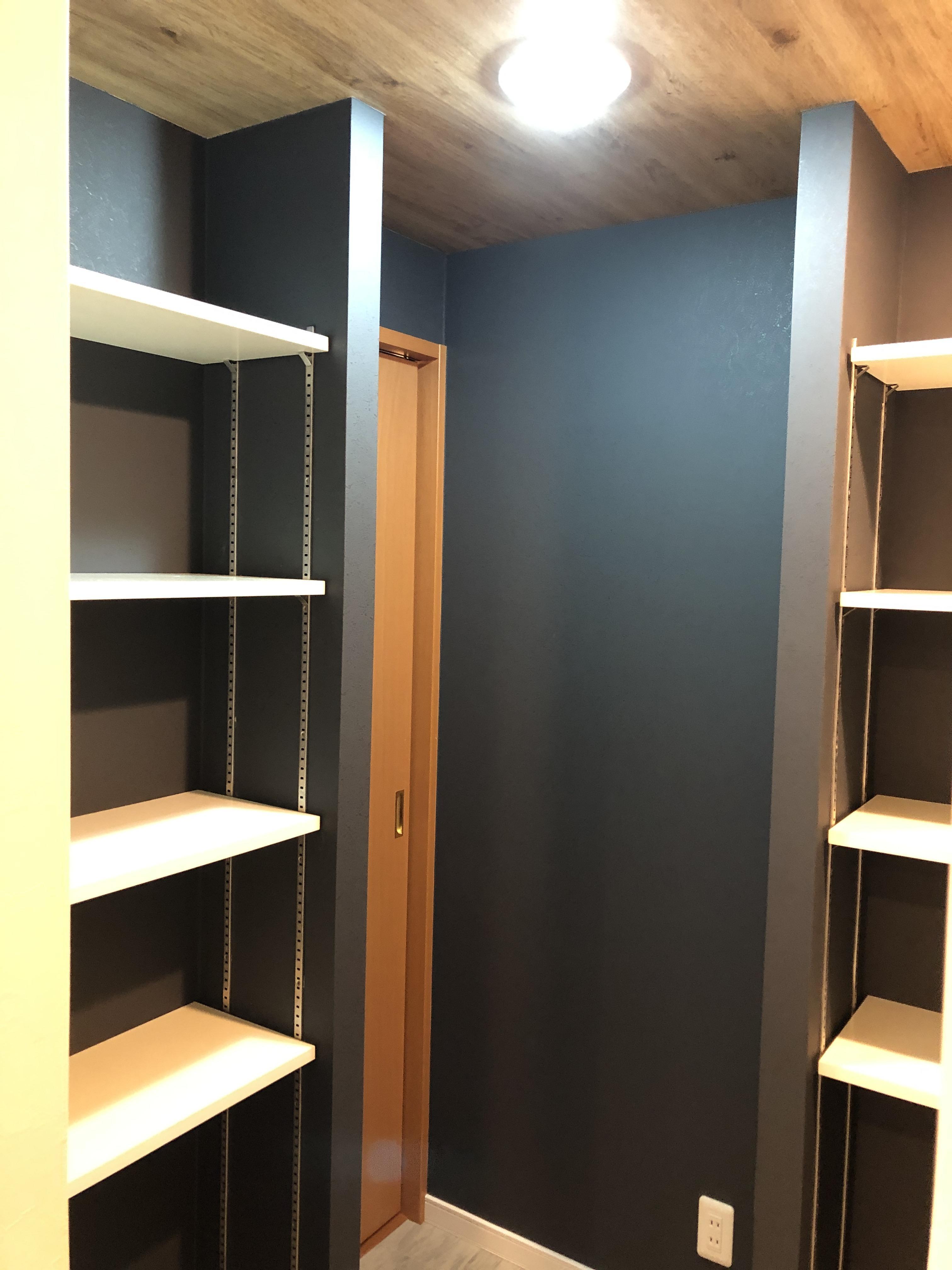 オープン対面キッチンに合わせてパントリーをご用意致しました可動棚なので季節ごとに収納スペースを変更して使用できます日々の使い方に合わせて自分好みに収納できる空間になっています天井はキッチンに合わせて、壁紙でスタイリッシュに演出しました