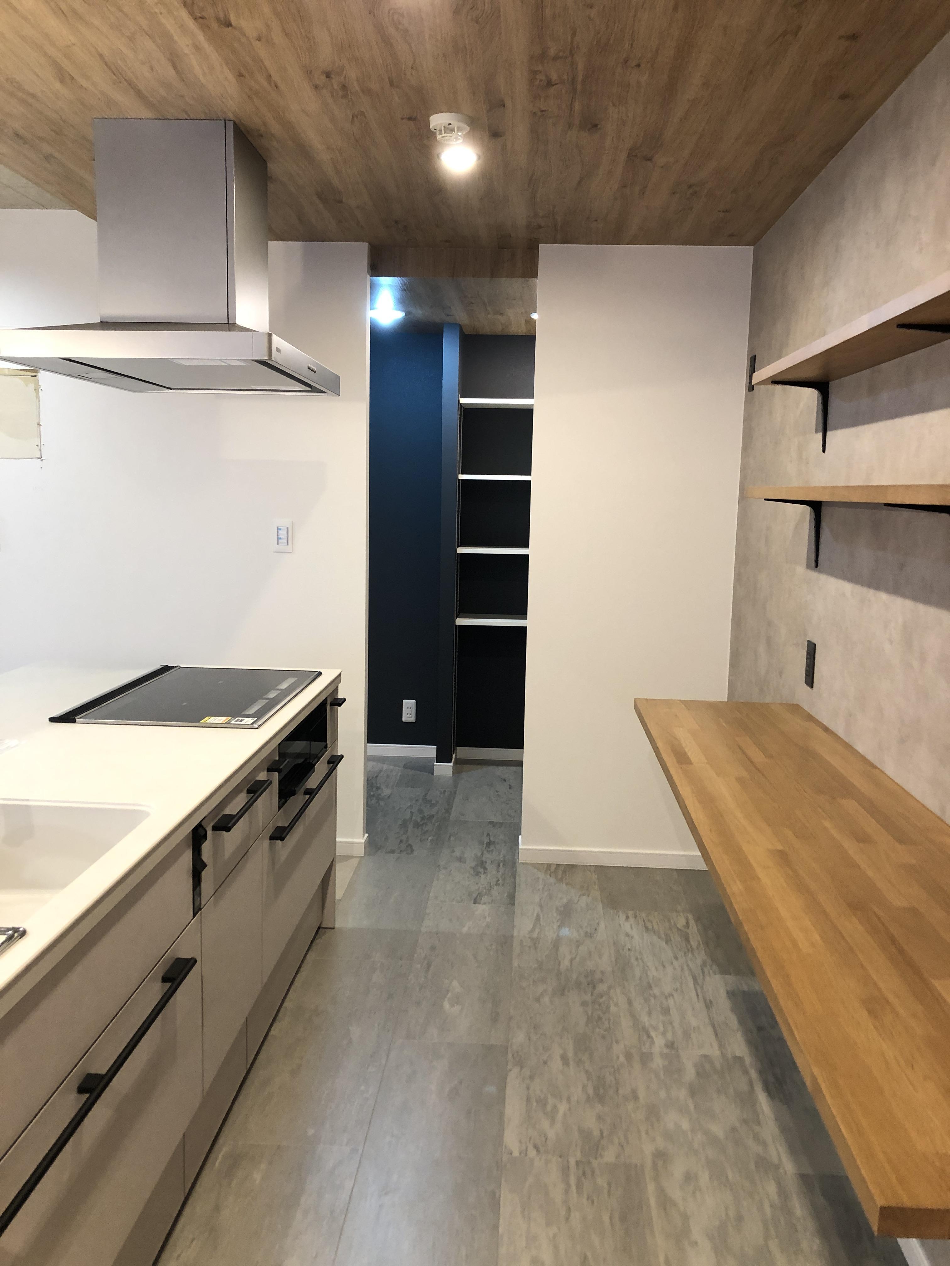 キッチンスペースからパントリースペースですキッチンスペース天井とキッチン背面の棚板の色合いを合わせ、ダイニングスペースと一体感のある木調の優しい雰囲気に床材はイメージを変え、棚板面とダイニング天井と合わせシックな空間を演出しています