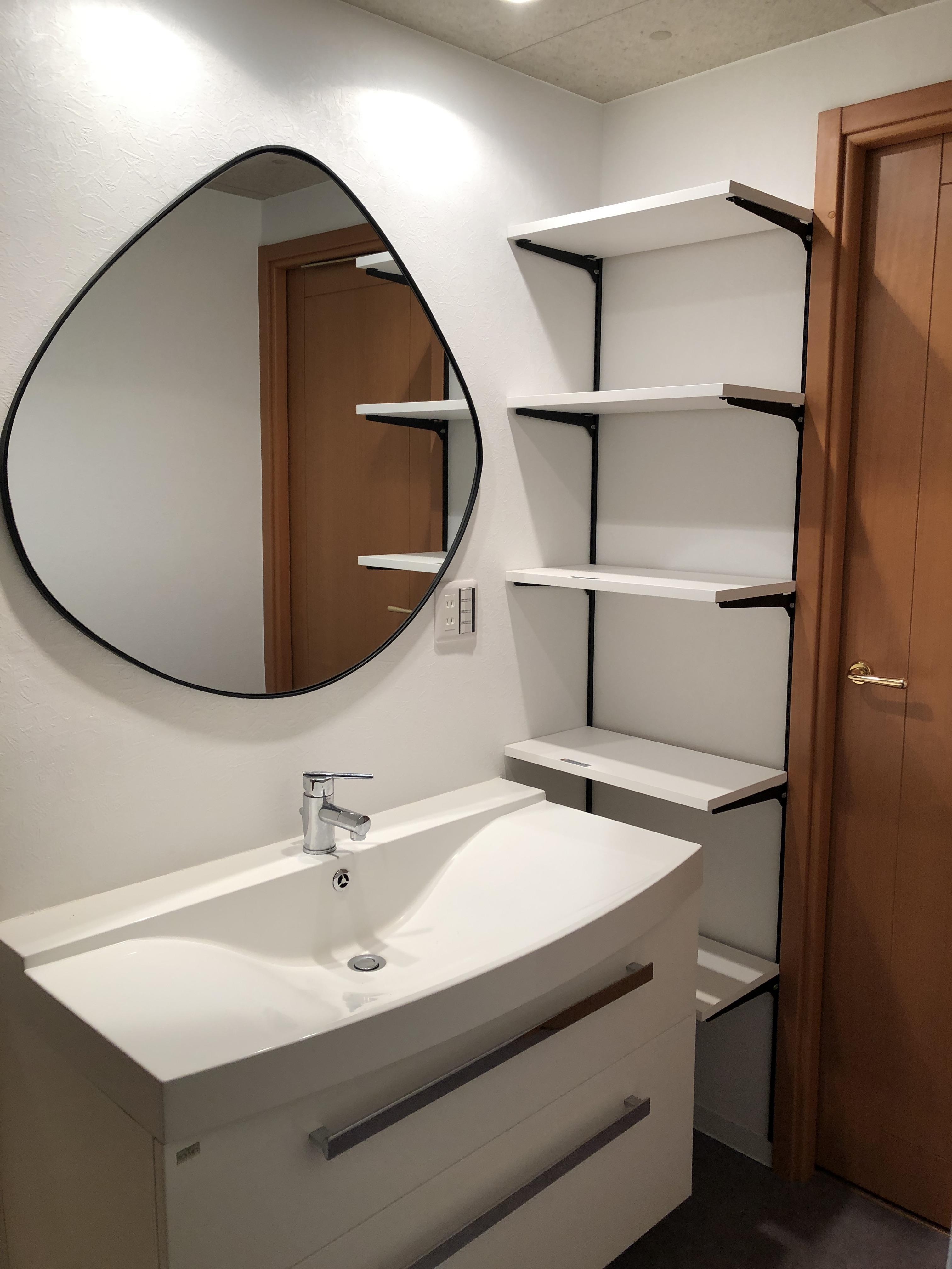 大きな不思議な形をした鏡をアクセントとして取り入れました鏡の前の証明にダウンライトを使用することでより印象的になるよう表現致しました可動棚を取り付けることで収納力もアップいろいろな商品から選び抜いたからこそできる素敵な洗面室になりました