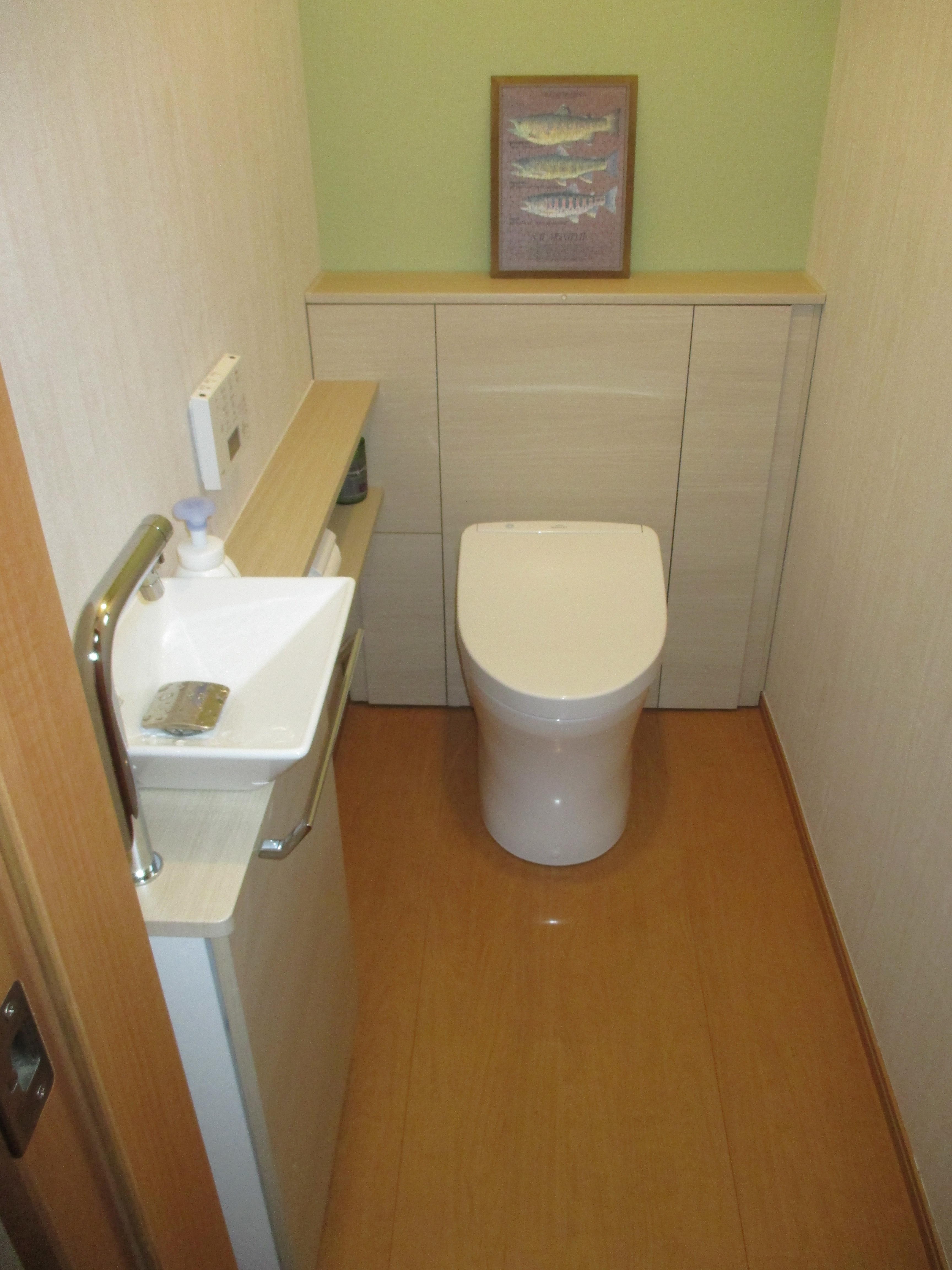 手洗いカウンター付きトイレ便器背面は収納になっており空間をスッキリアクセントクロスでデザイン性もばっちしのトイレに仕上がりました