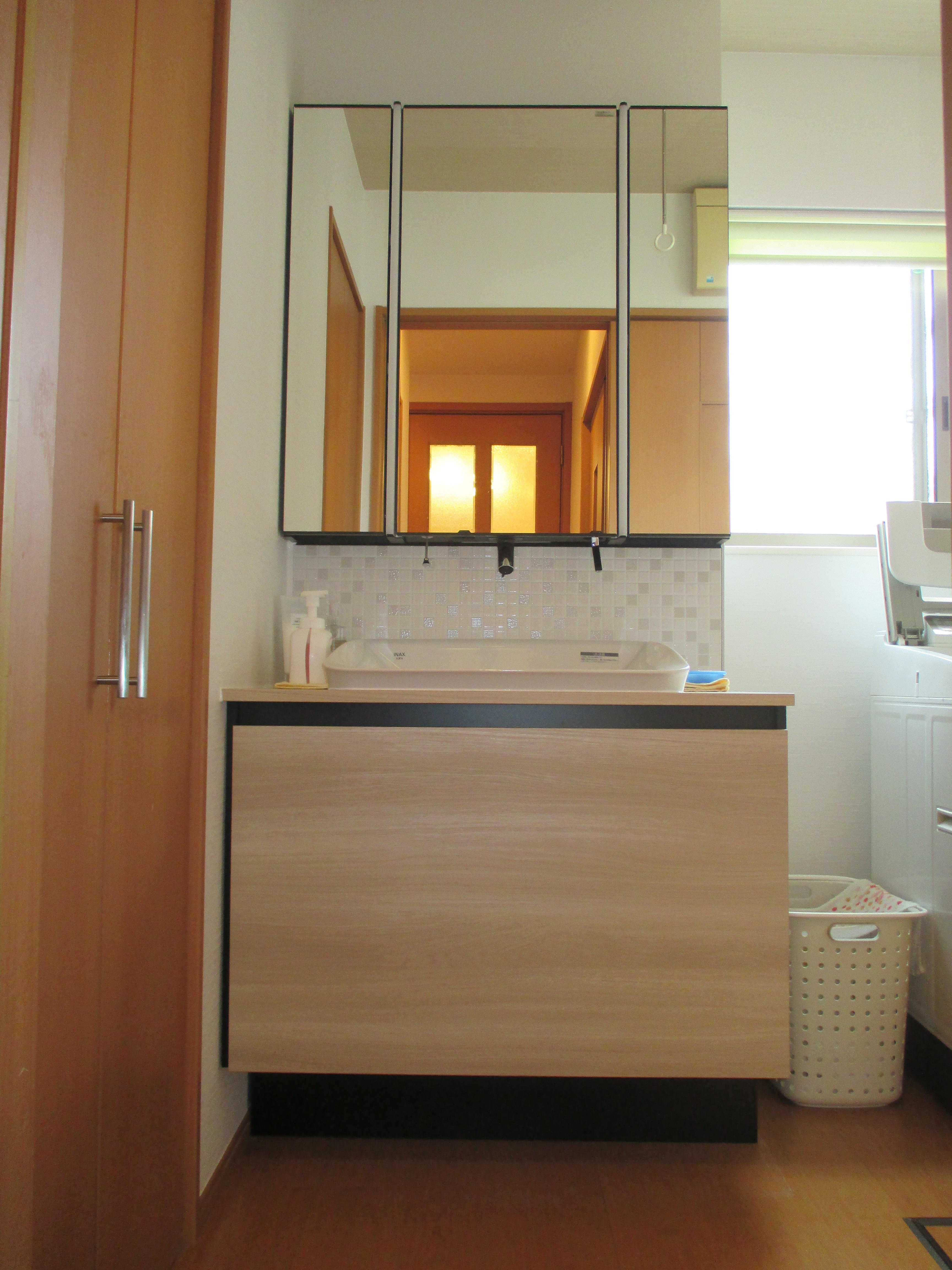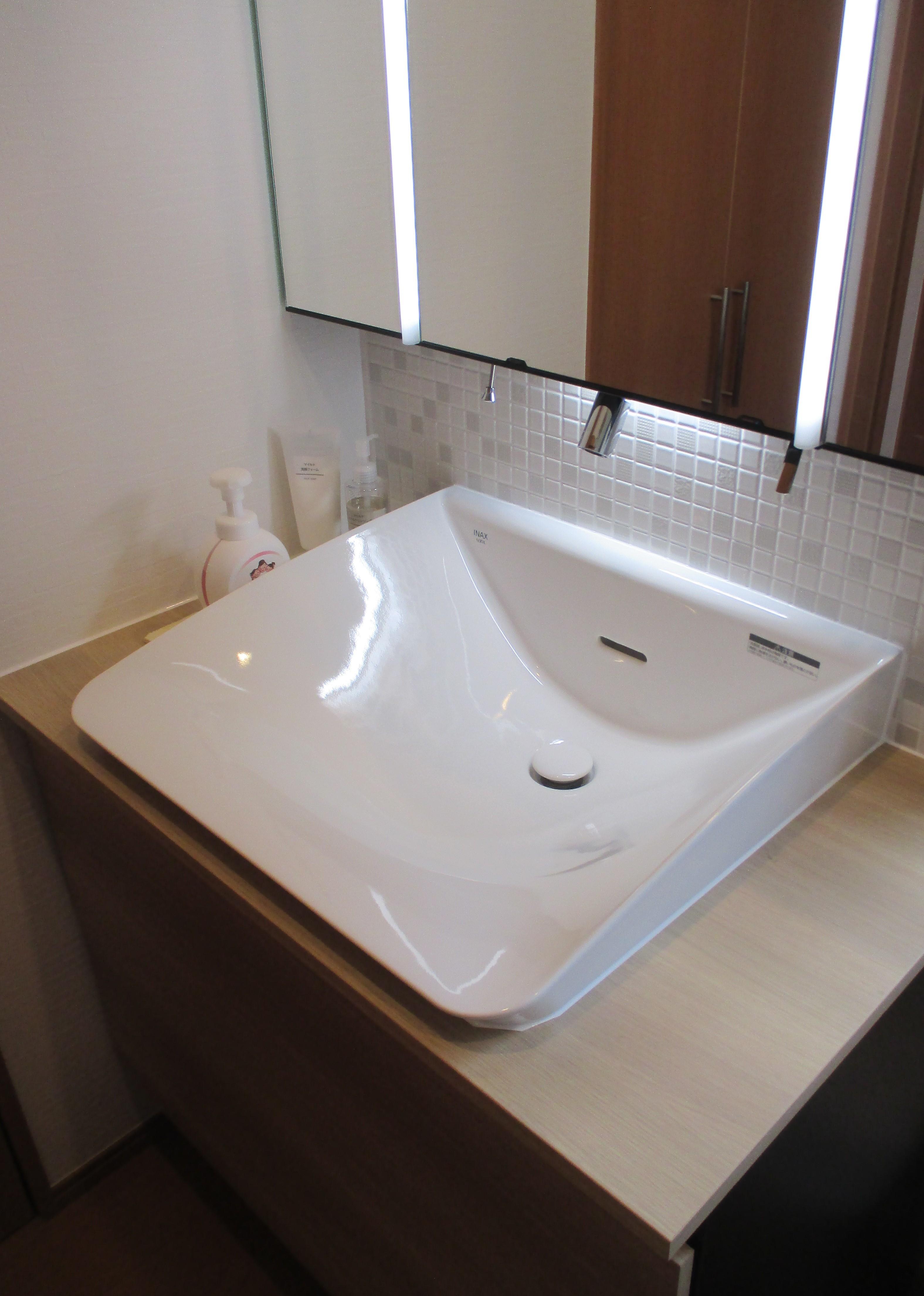 美しさと使いやすさを兼ね備えた洗面ボウルです水栓周りに水がたまらないキレイアップ水栓はお手入れがとても簡単です照明は顔全体を照らしてくれるフェイスフルライトで高級感のある洗面室に仕上がりました