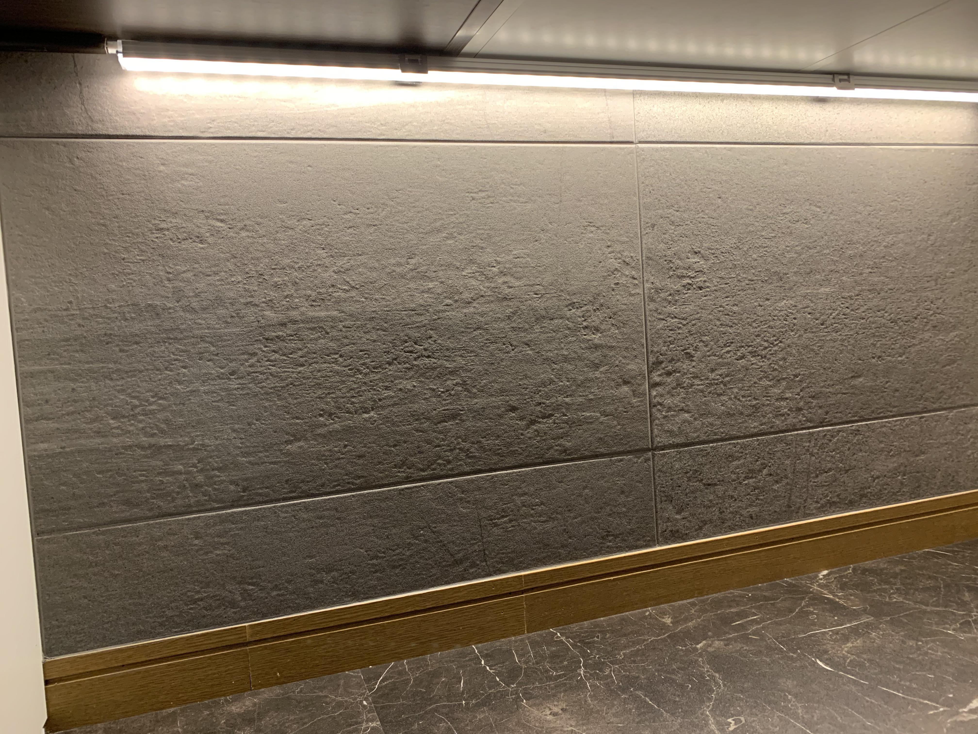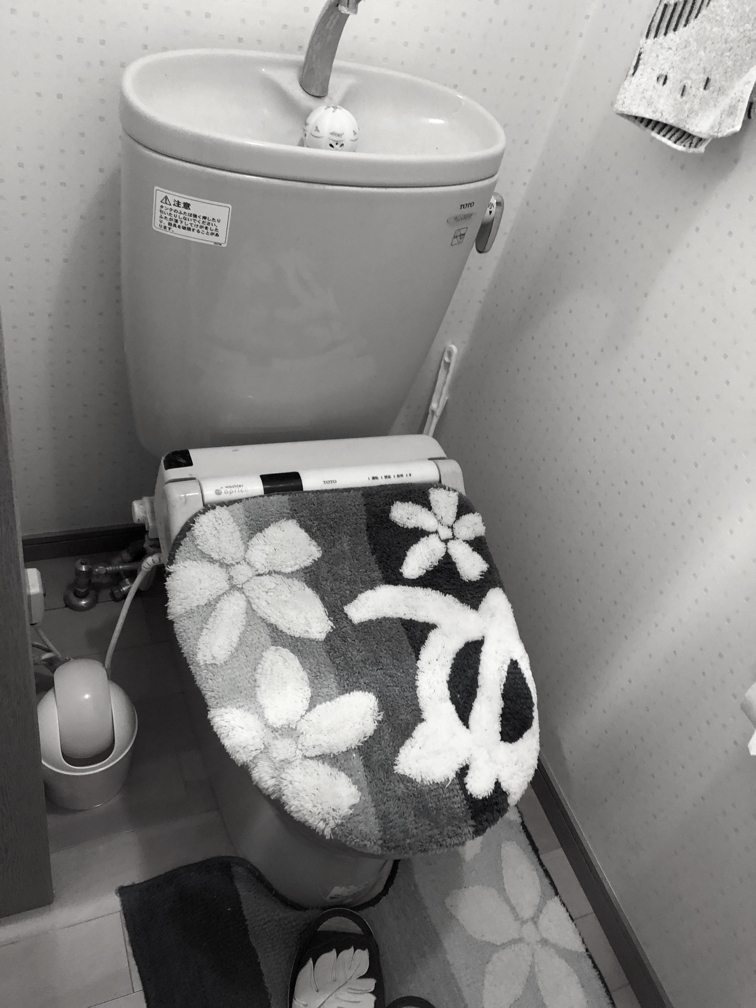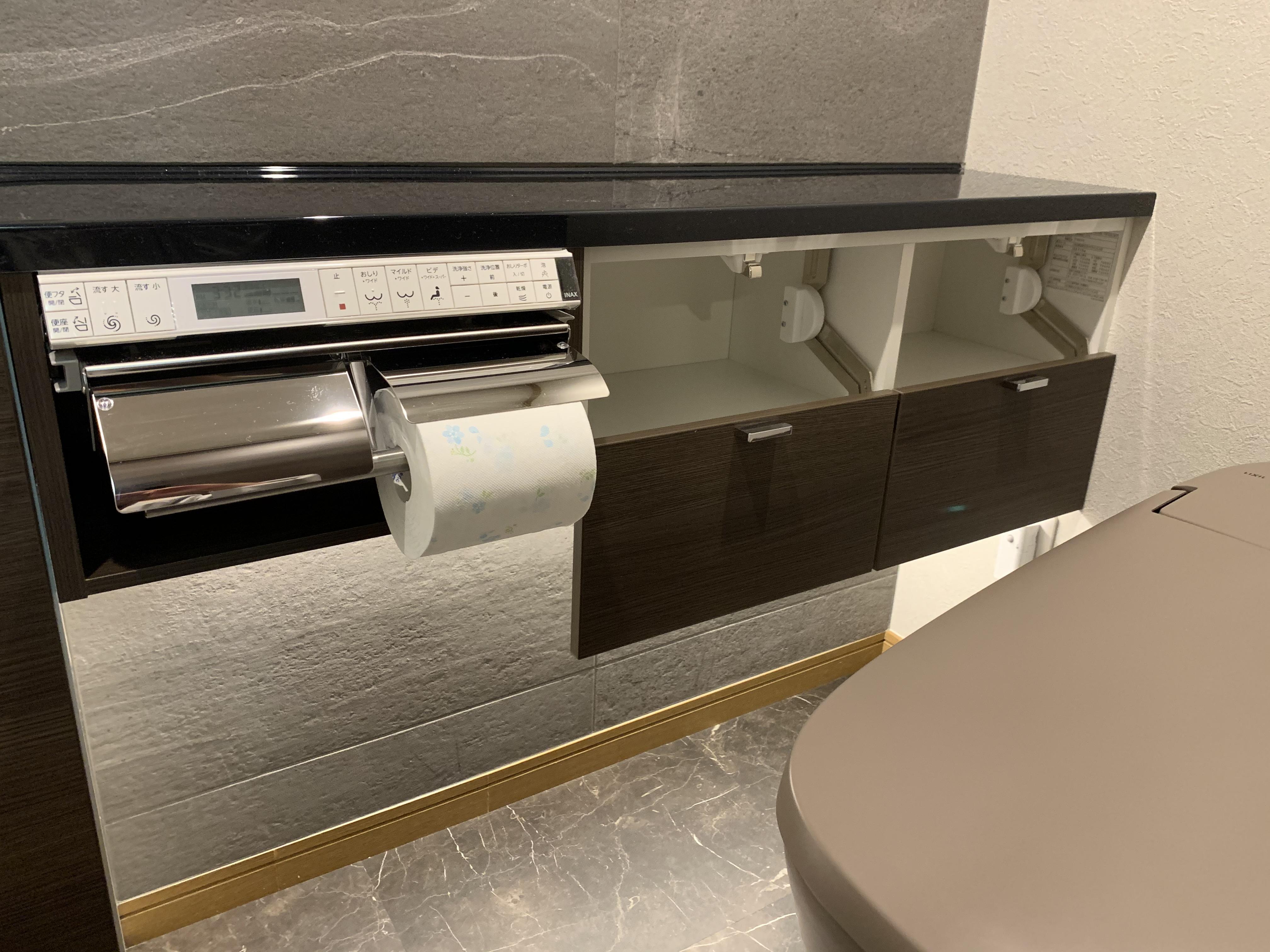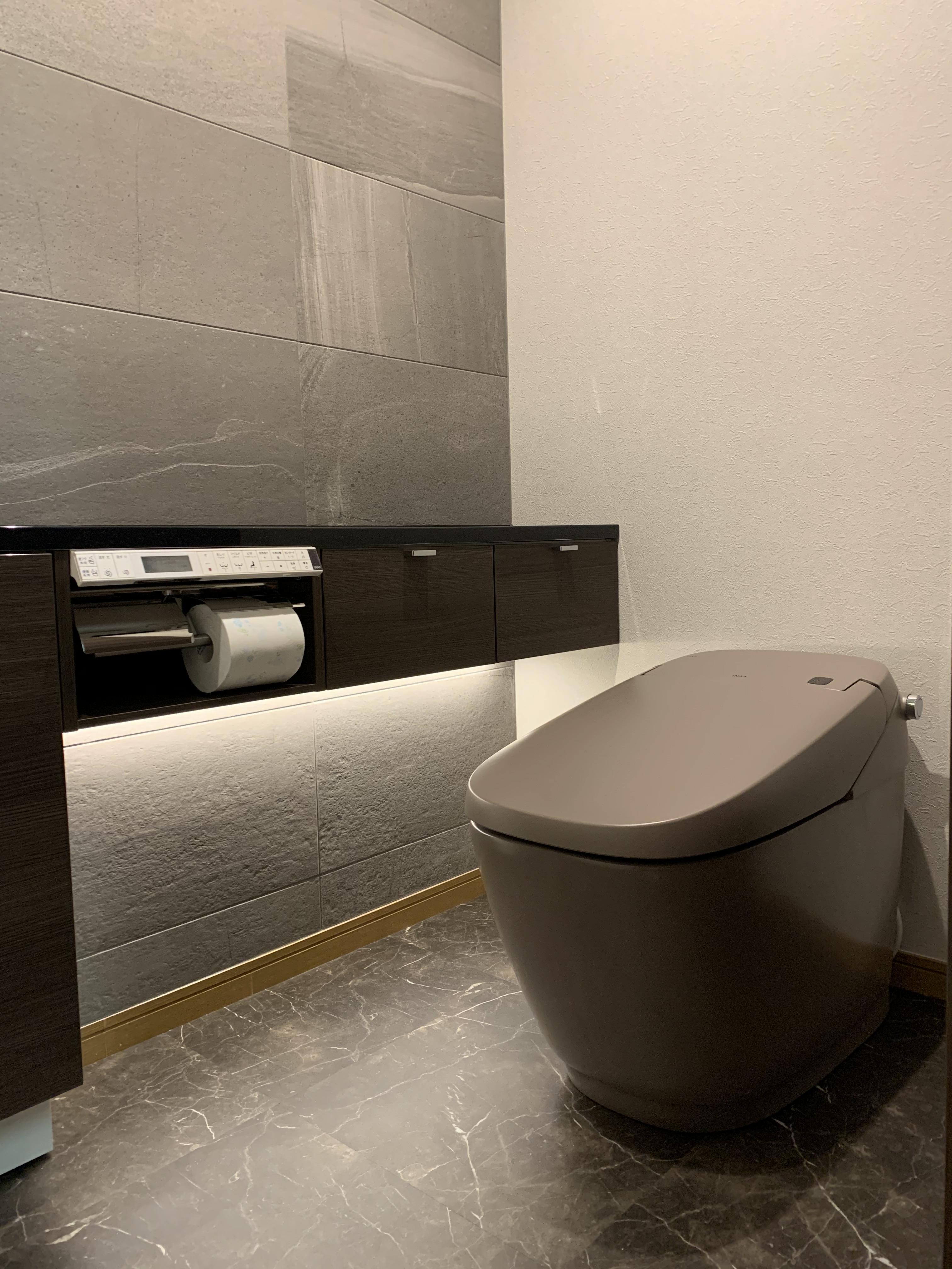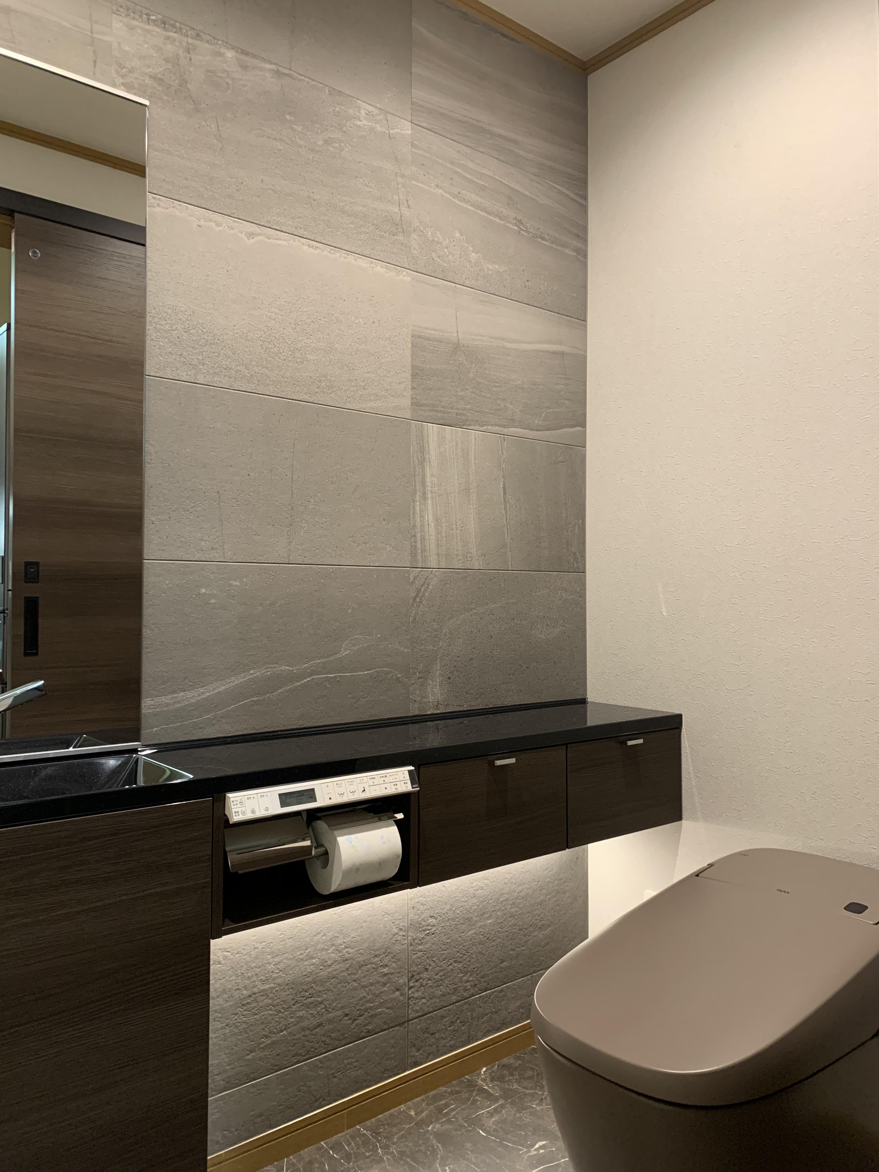 ★大人なモダンなトイレがコンセプト トイレと洗面室がそれぞれ個室になっていましたが、壁を撤去し広々とした手洗カウンター付きのトイレとなりました グレーやブラックをメインに石調に仕上げています 便器をブラックではなくあえてノーブルトープ色にすることがハードになりすぎないポイントです