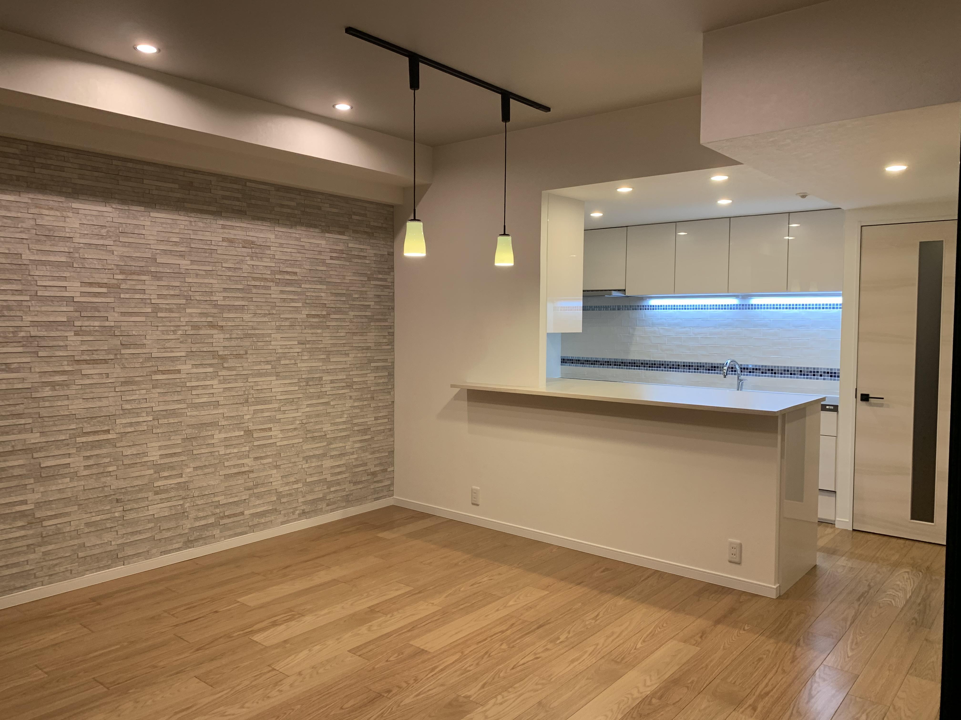 独立キッチンから全体が見渡せるセミオープンキッチンへリビングダイニングにはエコカラットをアクセントとして施工シンプルな空間にアクセントを取り入れることでお好みのデザインに仕上げることが可能ですダウンライトとスポットライトで明るさを取りつつ、エコカラットと照明の組み合わせで力強く見せることでシックな空間を演出致しましたフローリングとの色合いもGOODな大満足の空間になりました