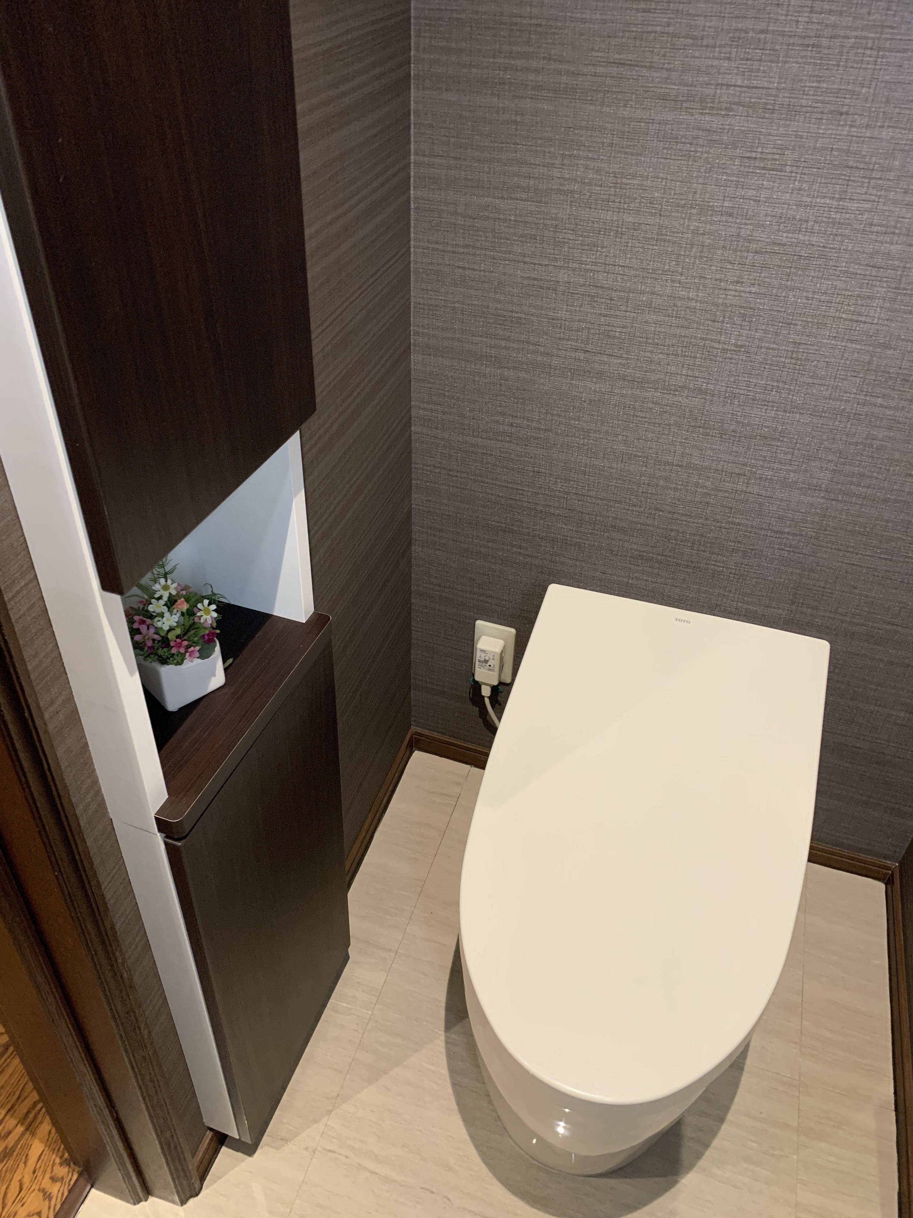 周りを暗めで落ち着いた雰囲気にすることで、床やアクセントが際立った素敵な空間になりました手洗いももちろん設置、LIXILの埋め込み収納を取り付けることで収納力もある空間に仕上がりました