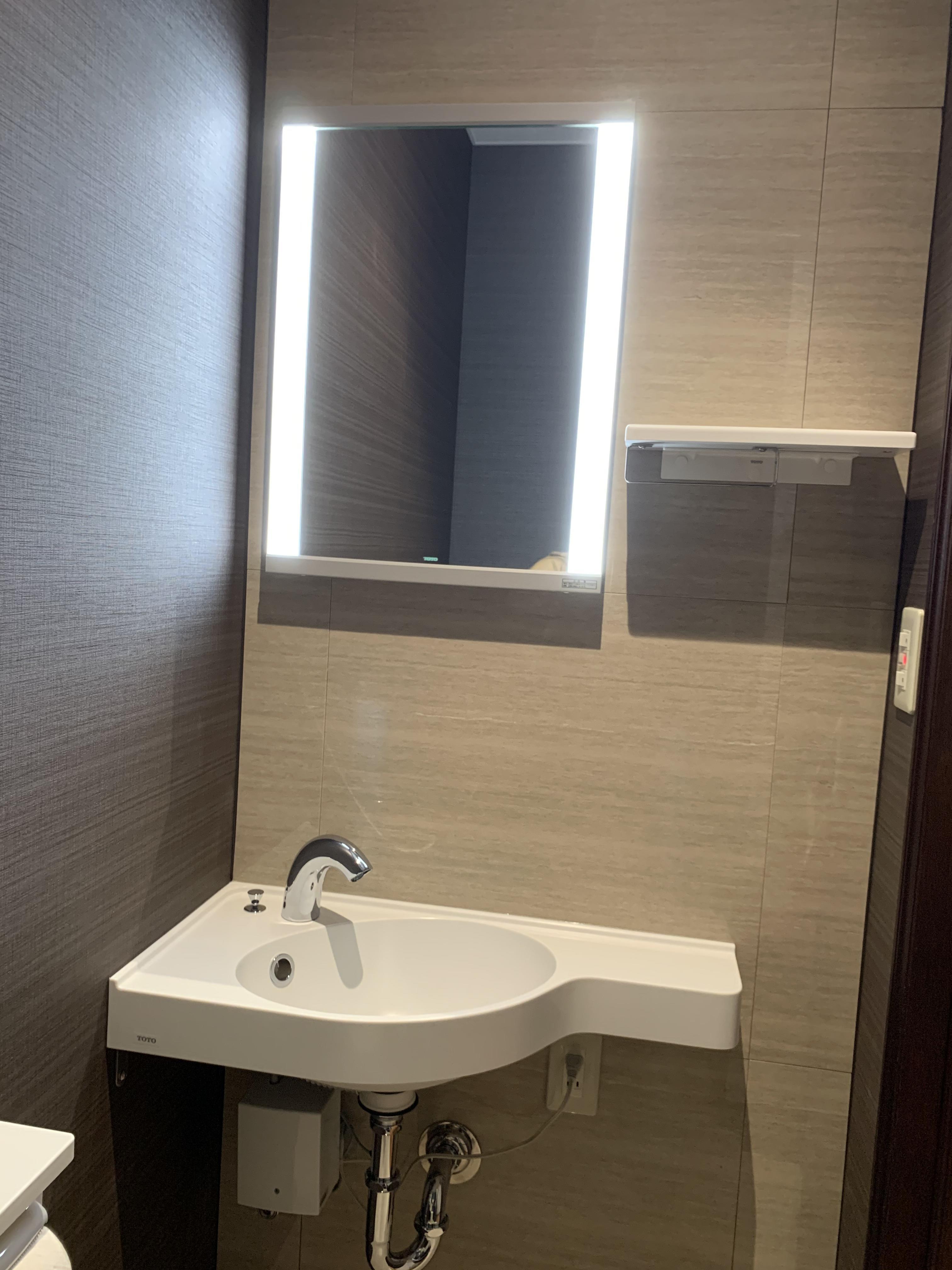 床材の雰囲気に合わせ、一面にアクセントとしてタイルを施工致しましたLIXILのジェントフロアを壁一面に、鏡面仕上げのタイル材なのでモダンな雰囲気の中でアクセントのきいた空間に生まれ変わります手洗いにはTOTOの壁付け手洗いに自動水栓を組み合わせました照明付きの一面鏡がより高級感を演出してくれます
