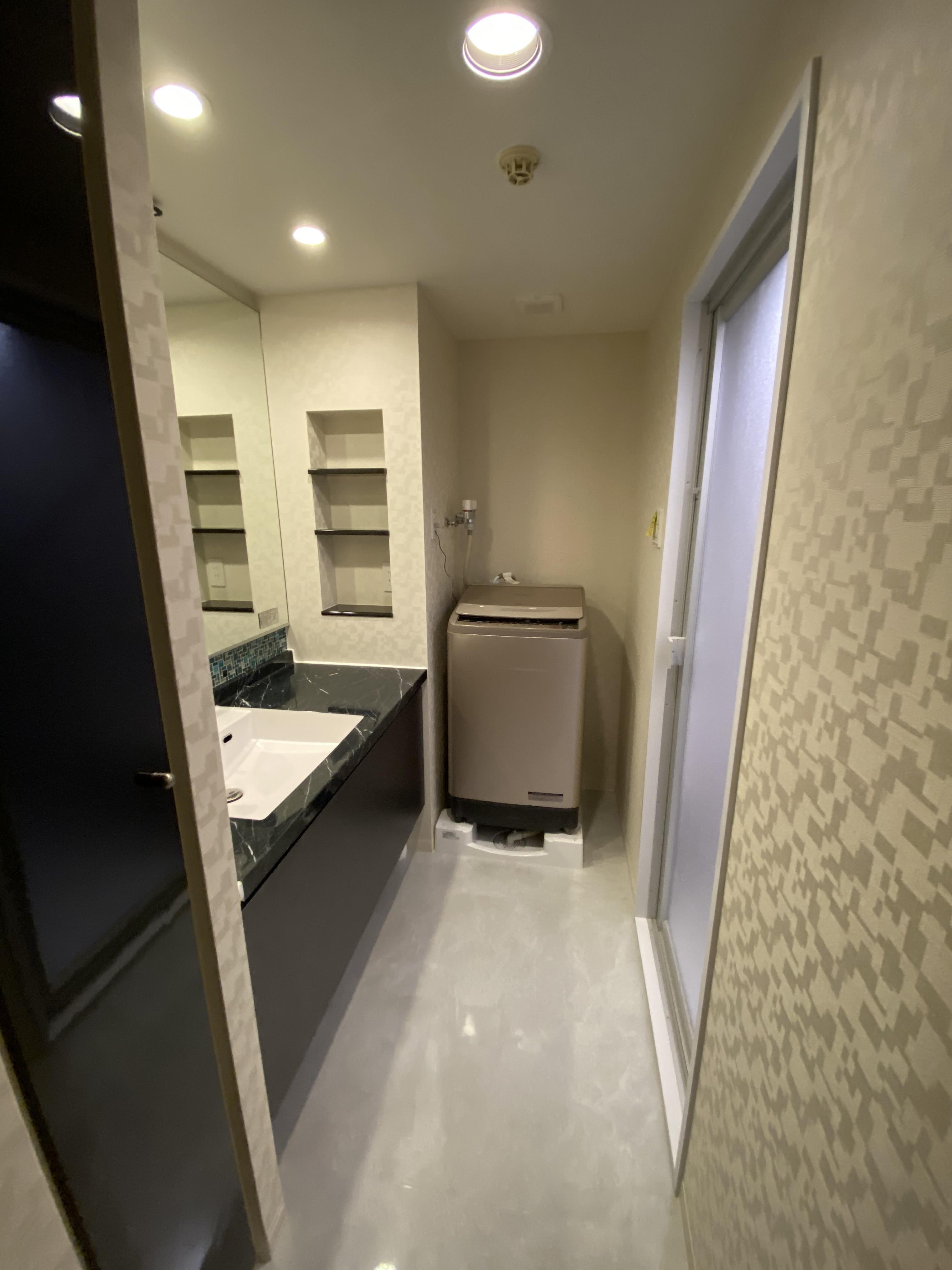 洗面化粧台に合わせて洗濯機側の壁を造作洗面化粧台横の埋め込み収納は撤去し、ニッチタイプのカウンター収納を造作しましたニッチ収納内にコンセントも用意、髭剃りなどもすっきり収納可能です床材はサンゲツ フロアタイル IS-908 鏡面仕上げで高級感UP洗濯パンは高圧洗浄ができるよう嵩上げタイプに交換しました洗面化粧台にあわせて造作した収納扉とカウンターで一体感のある洗面室に仕上がりました