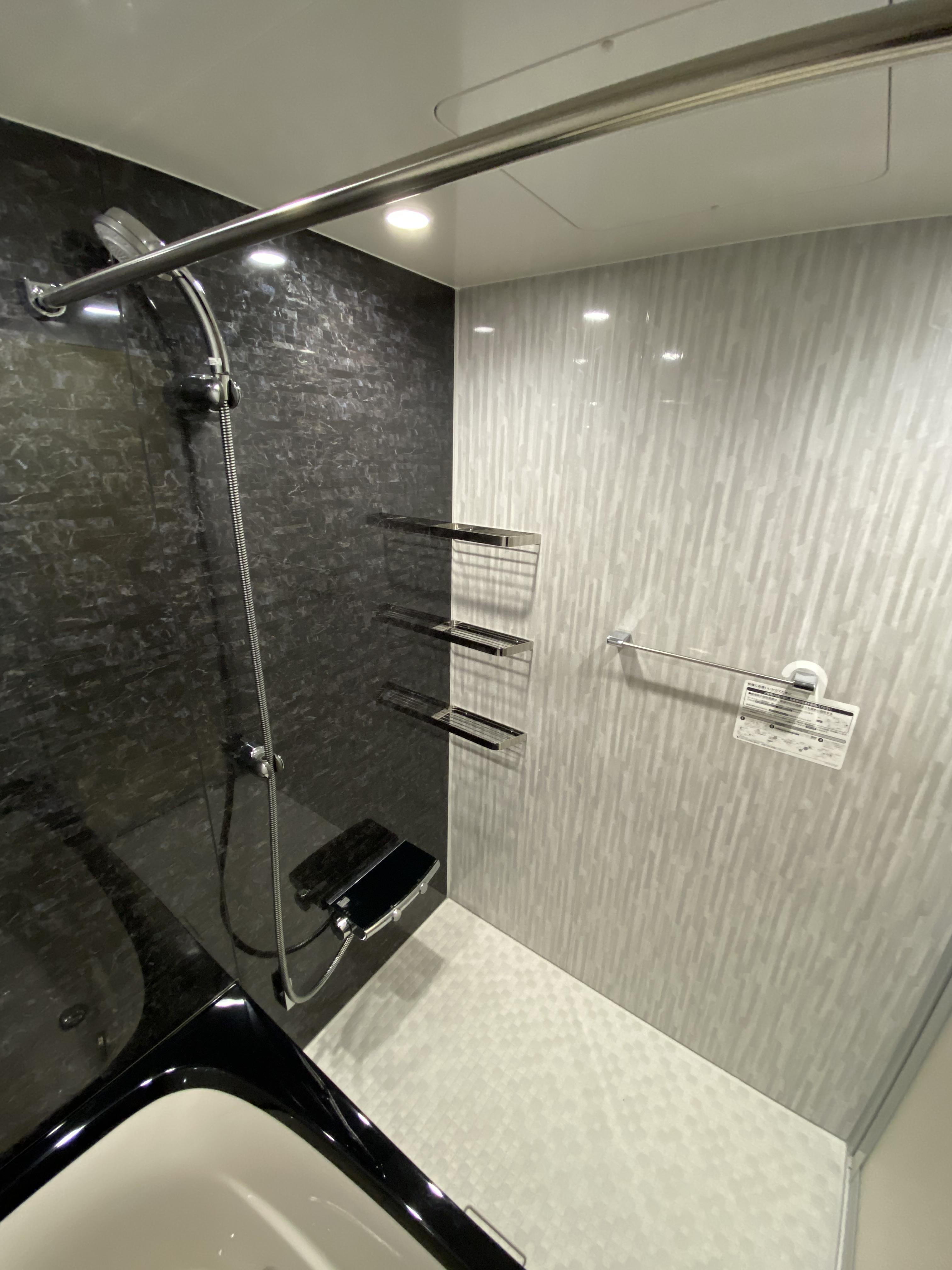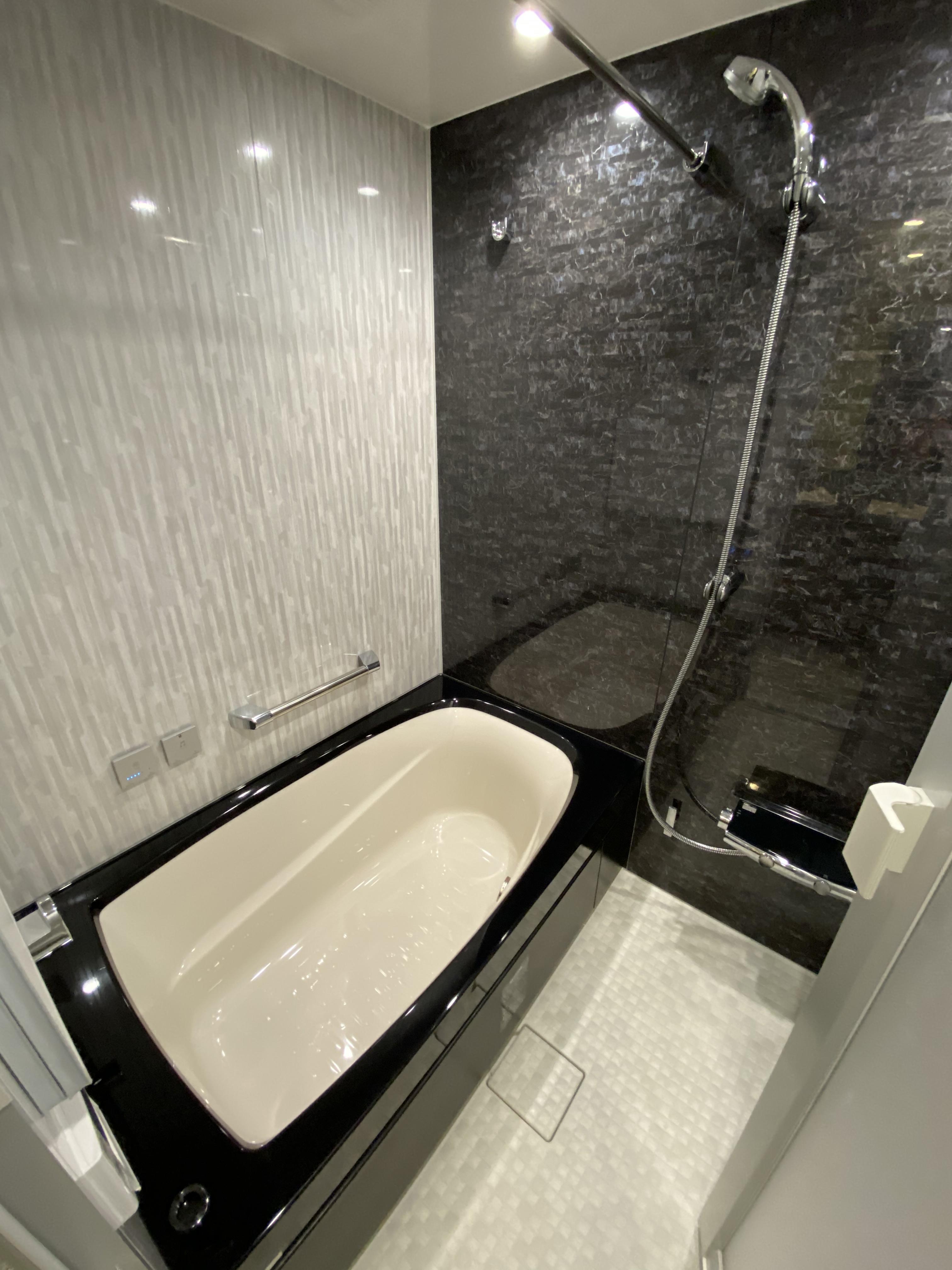 鏡をなしにすると思ったよりもスッキリとしたスタイリッシュな空間になります鏡はどうしても経年劣化による汚れが目立ってしまう為、ご自身で市販の取り外し可能なものを後からご用意して使っていただくことが増えてきました永くキレイに使っていただく浴室なのでお施主様に合わせたご提案を心掛けています今回はアクセント面(器具面)がオプトライン、ベースパネルがストーンモザイクダークの標準仕様から特別仕様に変更した浴室となりますアクセントをストーンモザイクダーク、ベースパネルをオプトラインに変更しましたお施主様のイメージ通り、大満足の浴室リフォームになりました
