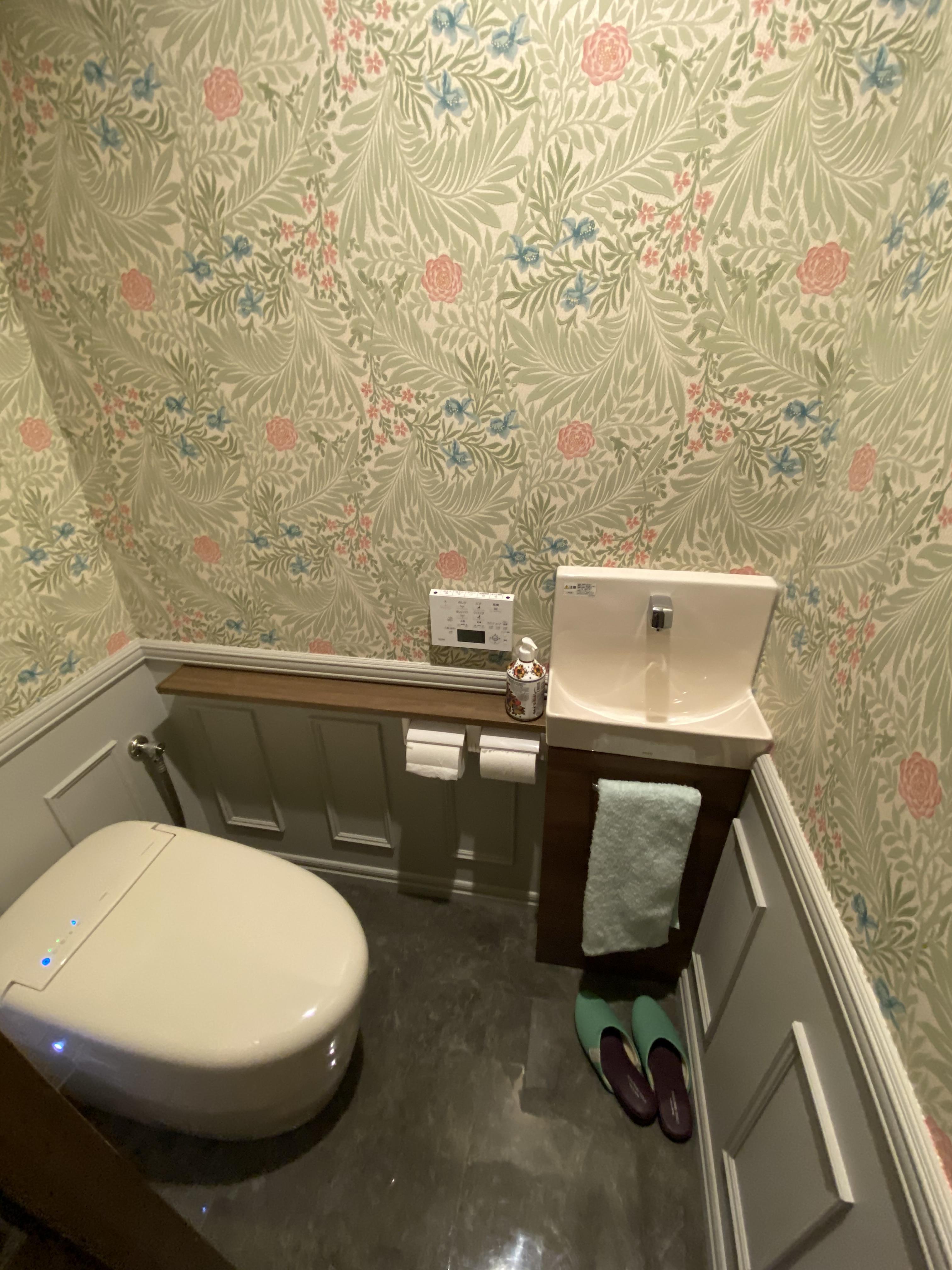 TOTOネオレストRHシリーズとカウンター付き手洗いを取付しました手洗い用の配管は浴室の工事中に新規で工事を行い、リフォーム用のカウンターよりもスッキリとした空間になりましたコーナーキャビネットで収納力もかばーしていますみはしのモールデング材、巾木材、見切り材を加工して、腰壁も造作し海外製の塗料を使用し塗装を行いました造作した壁から上には、輸入壁紙 ウィリアムモリスをご選定いただきました日本のビニルクロスにはないデザインや質感、高級感を演出できる壁紙です