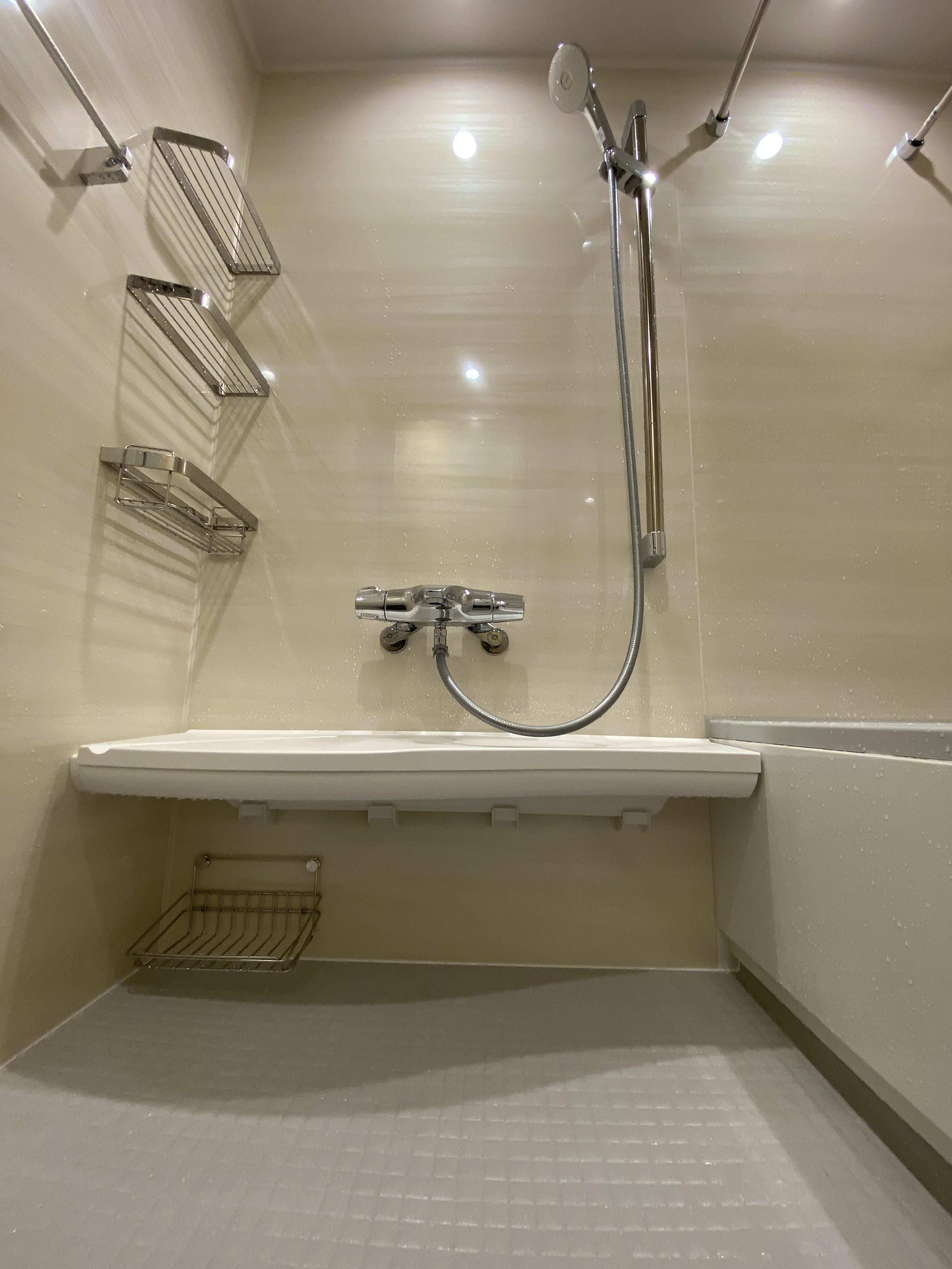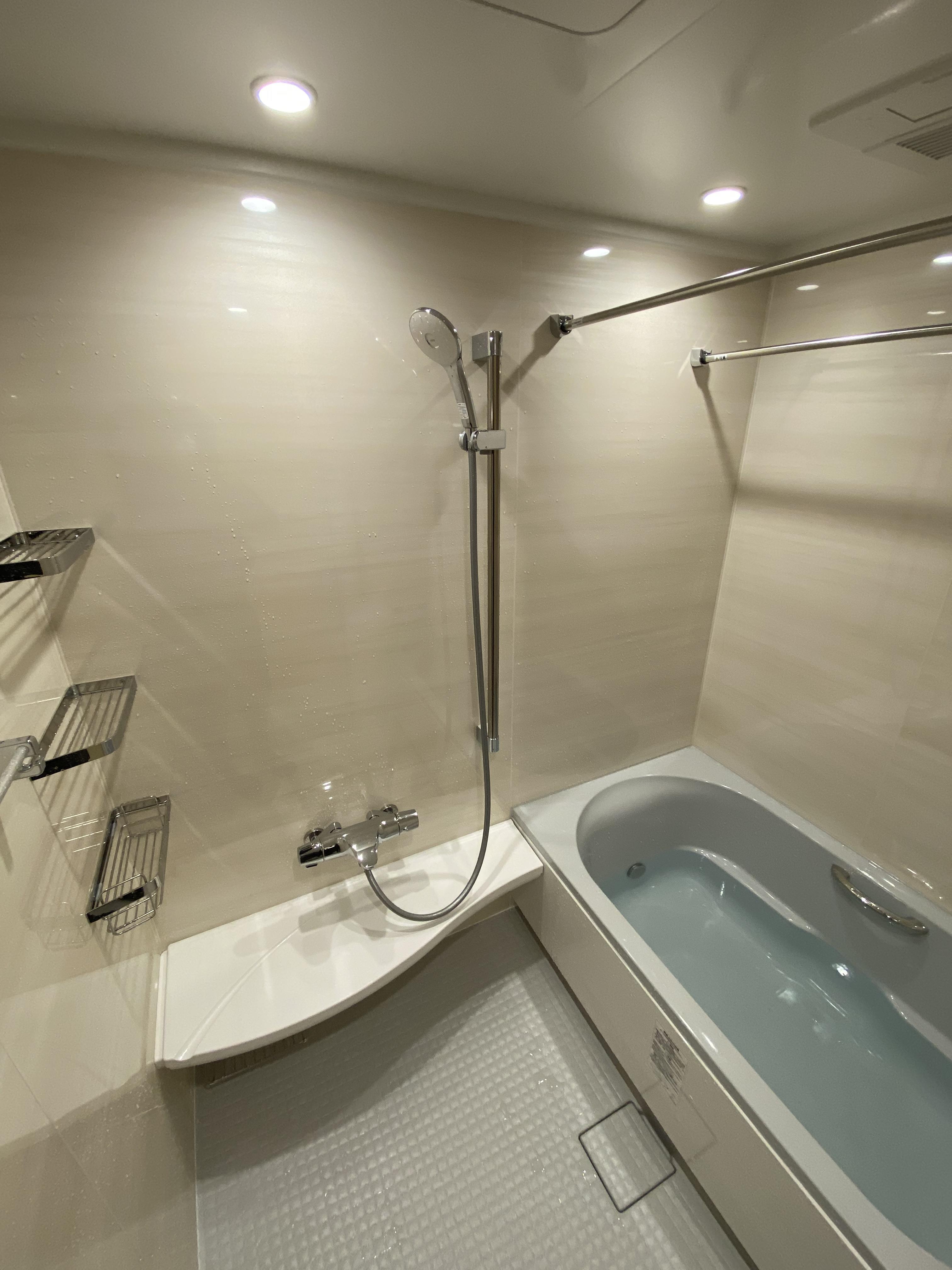 ダウンライトの明るさとメタル器具の高級感がアクセントの浴室です壁パネルと床や浴槽の色合いをじっくりと打ち合わせし、お施主様のイメージ通りの仕上がりとなりましたミラーを外すことで浴室内がよりスッキリと見えます手間がかかる掃除を最低限に抑えることで永くキレイな浴室で入浴していただけるのではないでしょうか一つ一つがこだわりの仕上がりに大満足いただきました