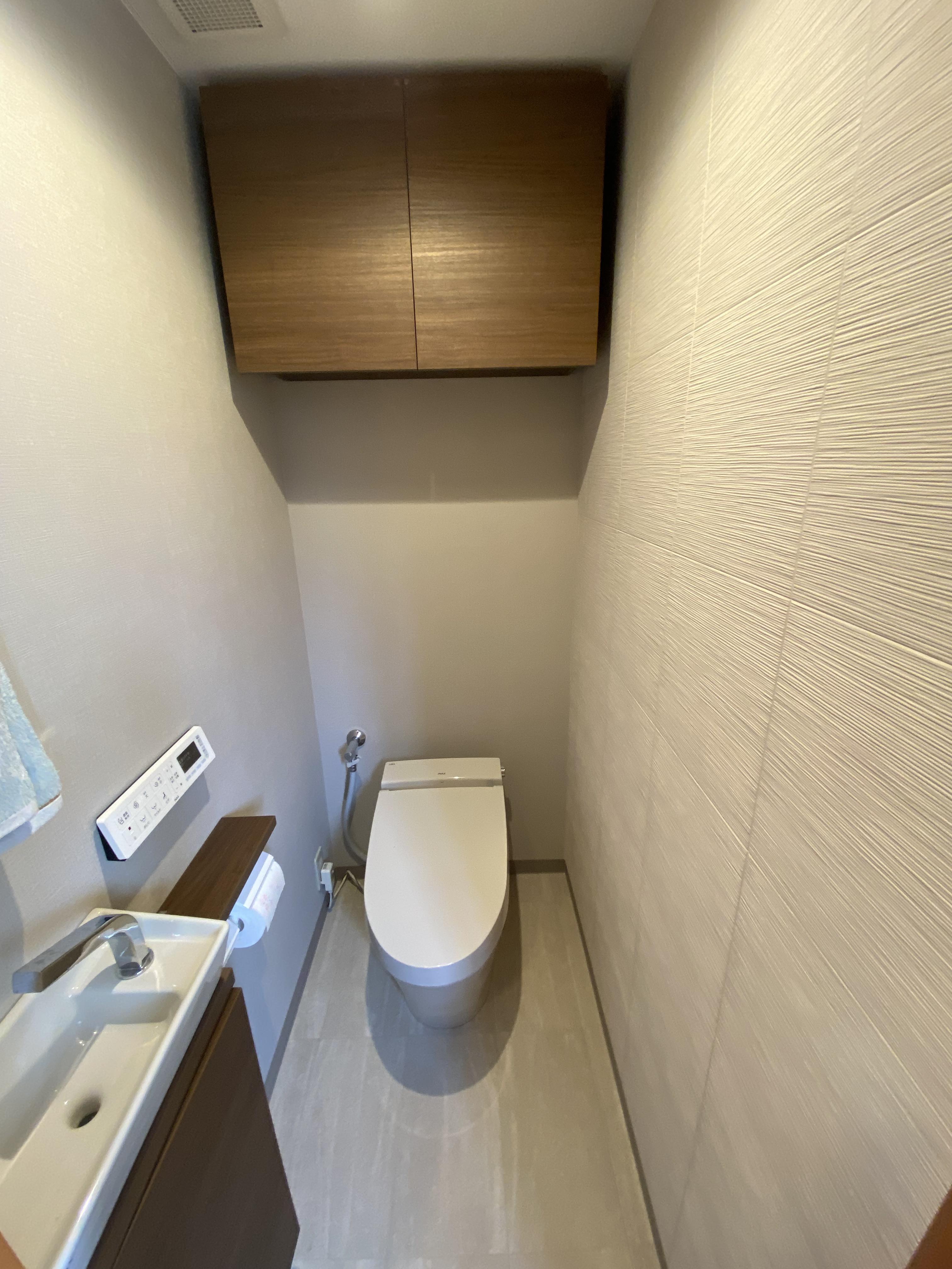 『 LIXIL サティスS 』と『 LIXIL キャパシア手洗い 』と組み合わせました空間をスッキリ見せるためにカウンターなし手洗いに棚板付き紙巻き器をご提案しました陶器部分のオフホワイト色に合わせて壁紙と床材をご選定落ち着いた空間に仕上がりました手洗いは自動水栓なので水栓周りも汚れにくく、使い勝手も大満足のリフォームになりました