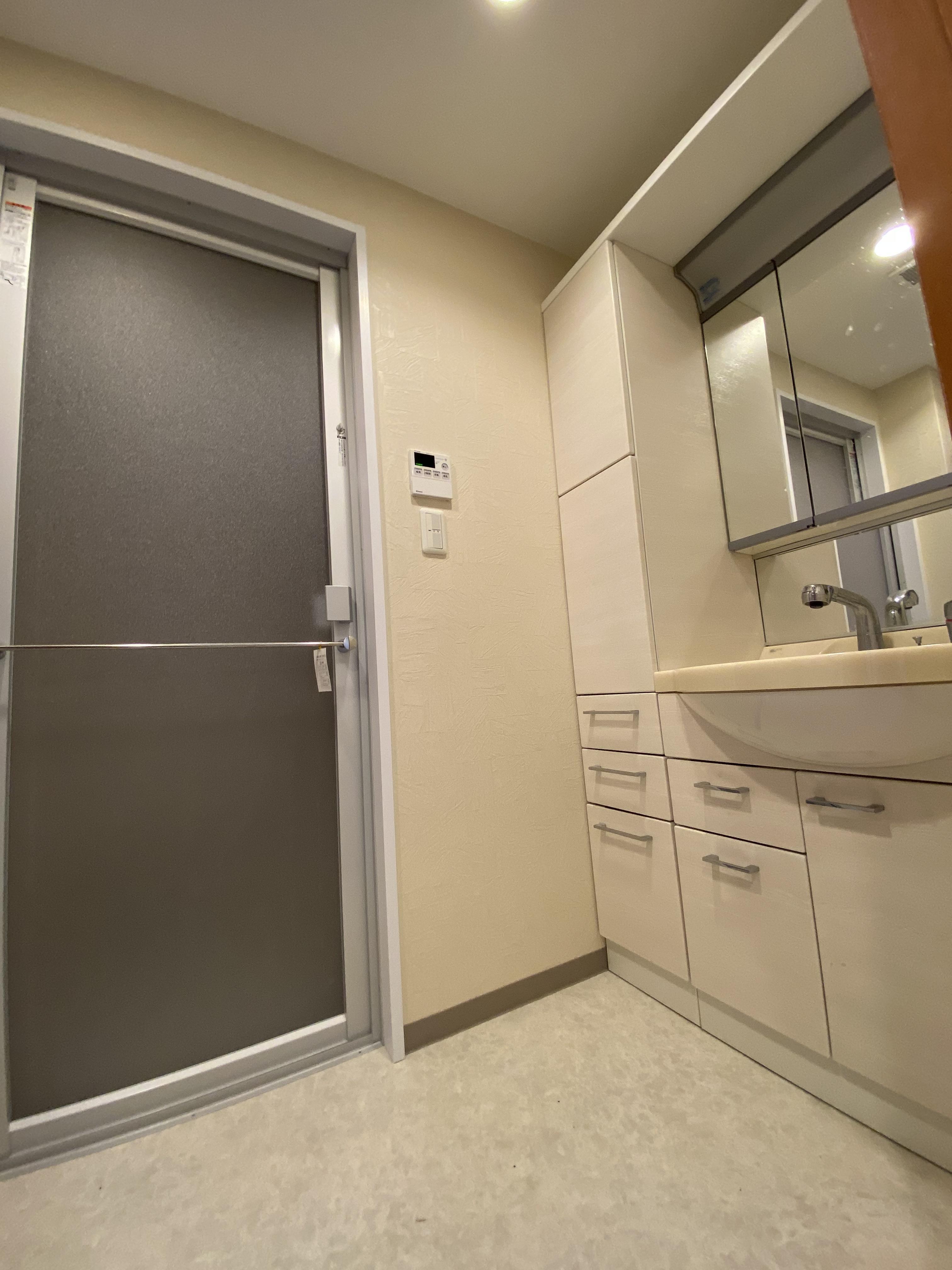 浴室の雰囲気にあわせて内装材の貼替を行いました洗面化粧台は以前、取替工事させていただいたものになるので一度取り外し、内装工事完了後に再度取付しました浴室に合わせたベージュ系の石目柄クロスは清潔感のあるホテルのような素敵な洗面化粧室になりました