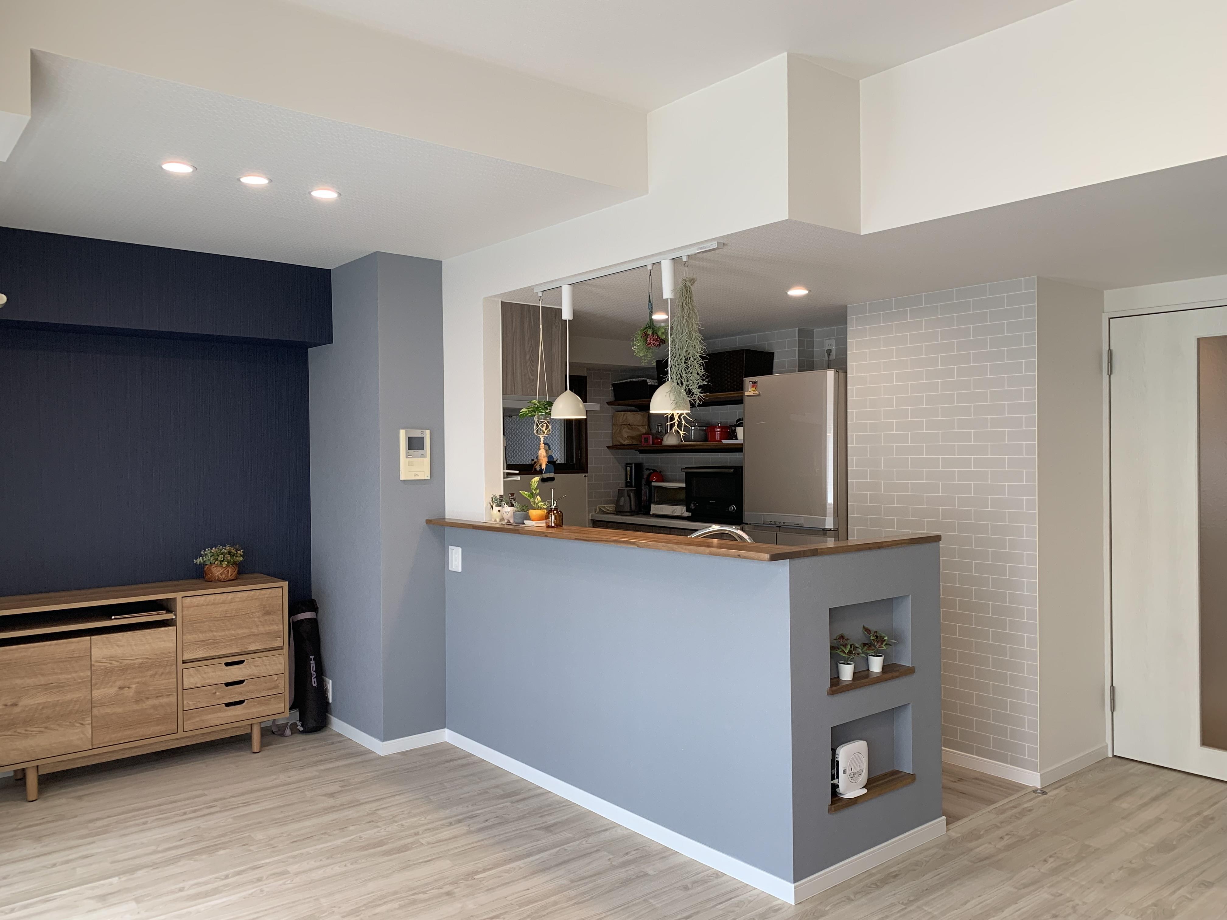 これからのご夫婦の生活のためのリフォーム ご主人様と奥様のお好みのインテリアの融合で北欧風となりました キッチンのお色みやペンダントライトや見せる収納のカウンター材など丁寧にひとつずつ決められました 特にダイニングリビングの壁紙は、悩まれ迷われ時間をかけて選定されました そのため多色使いですが、まとまったシックな北欧風となっています