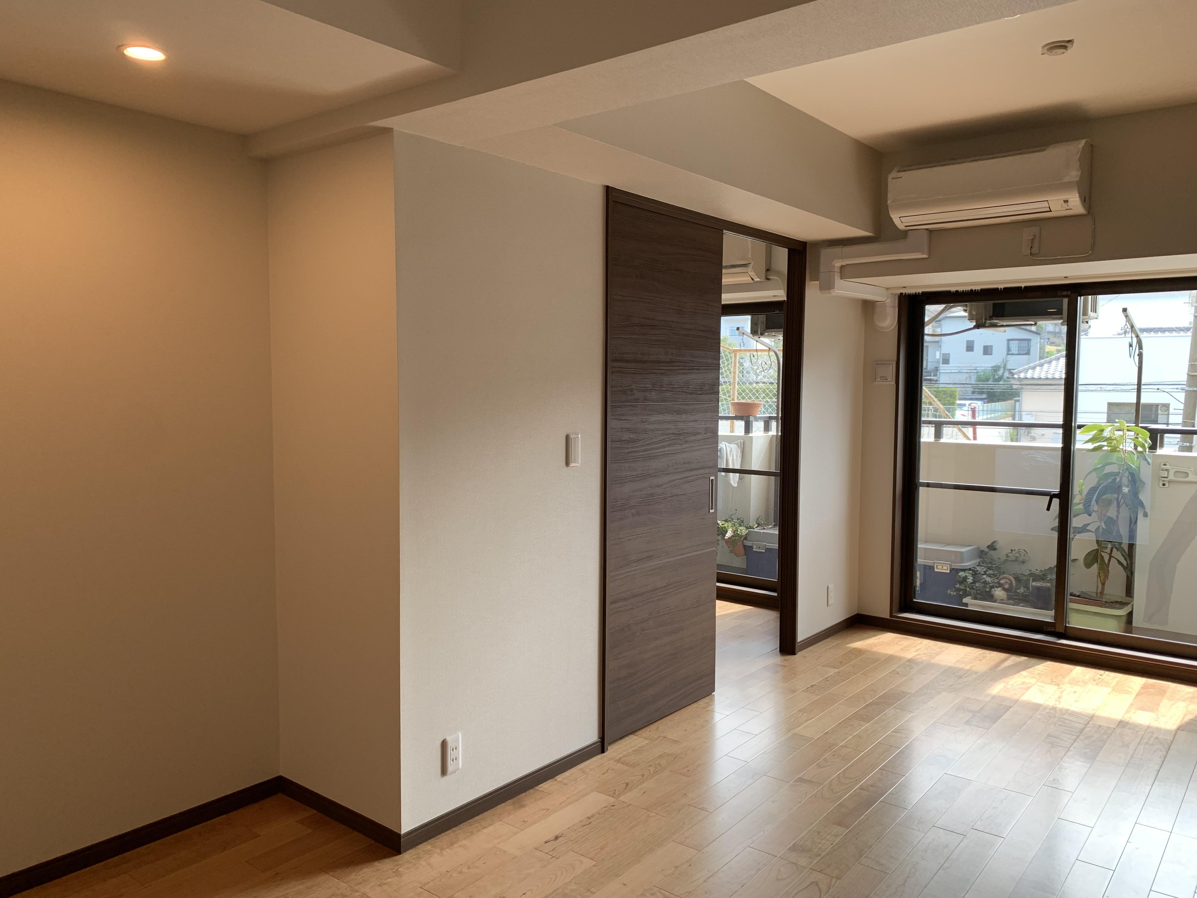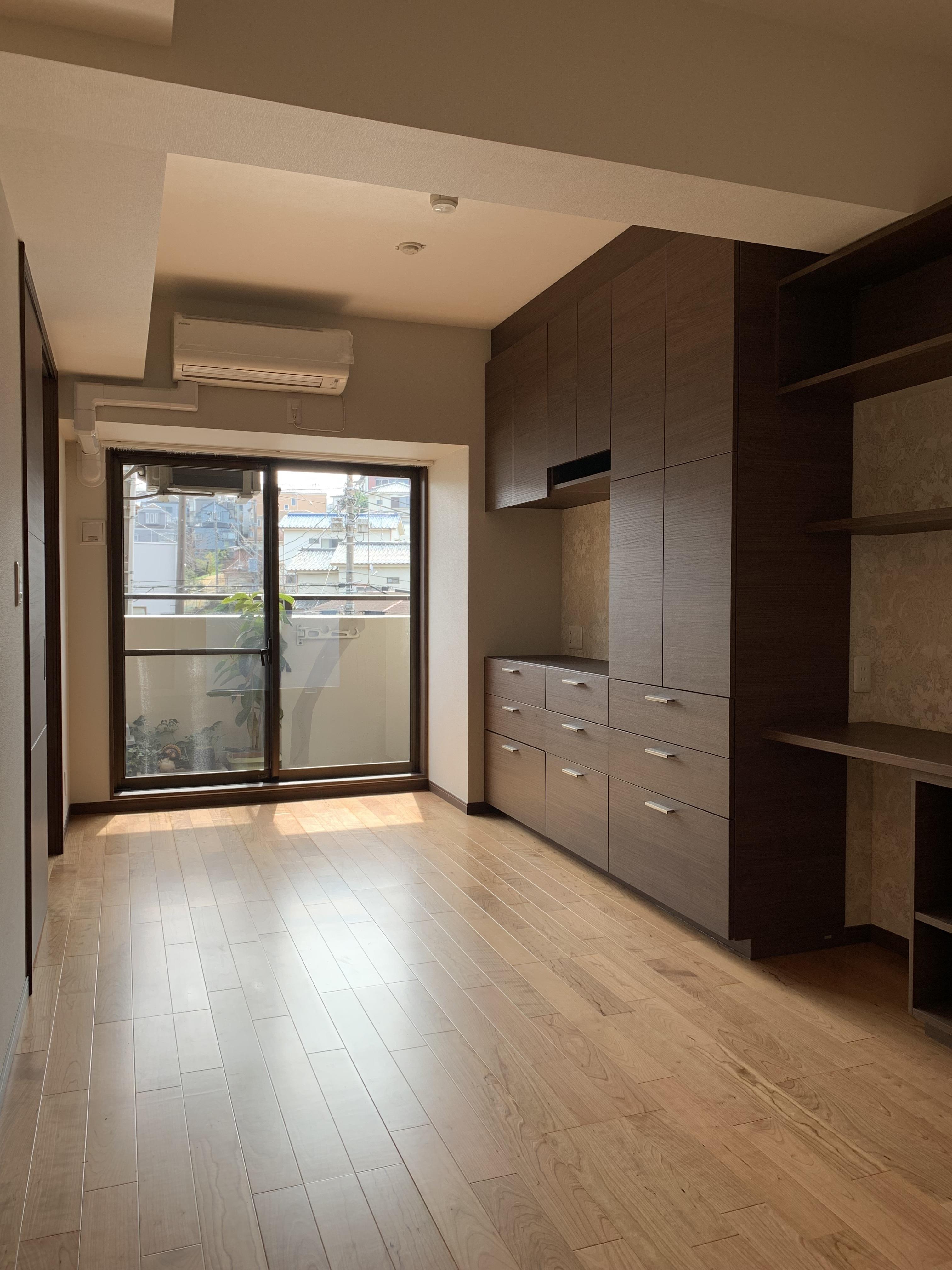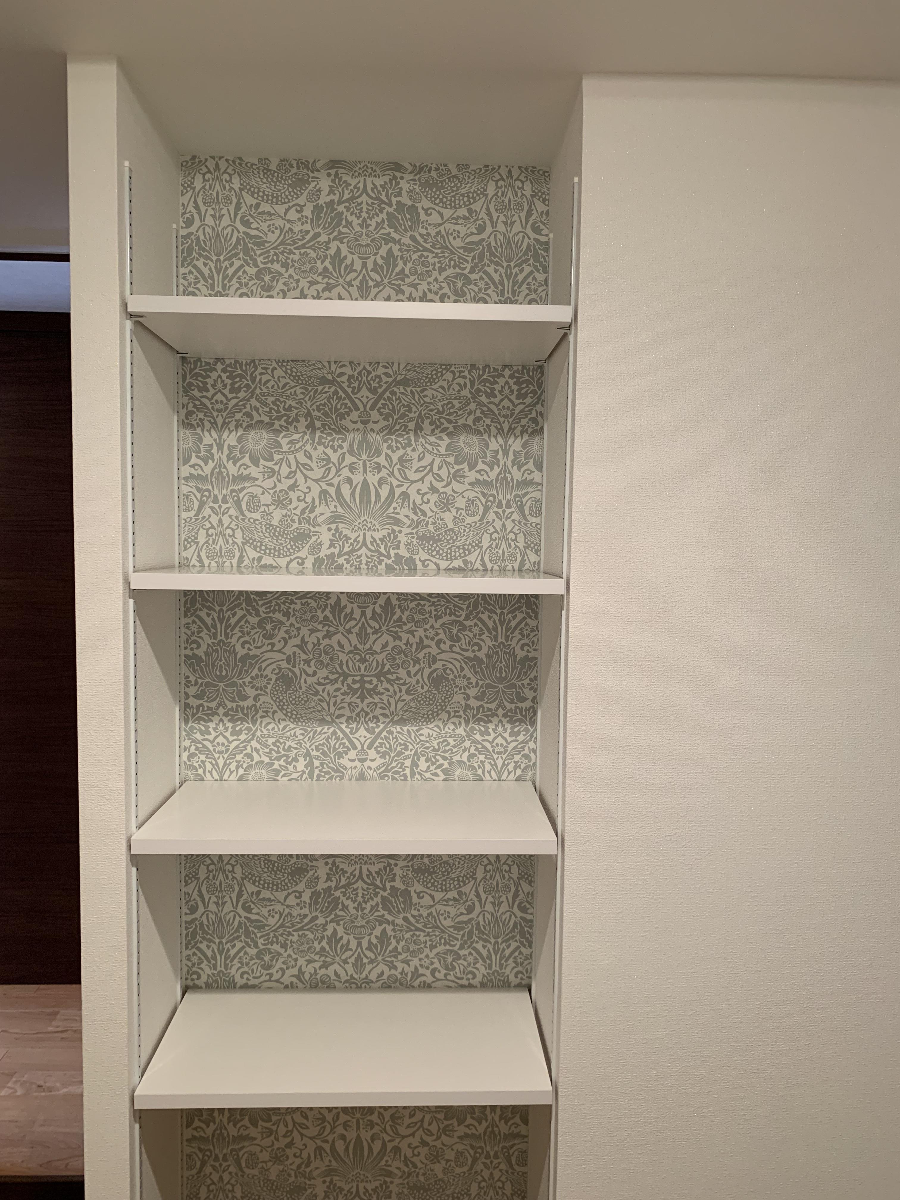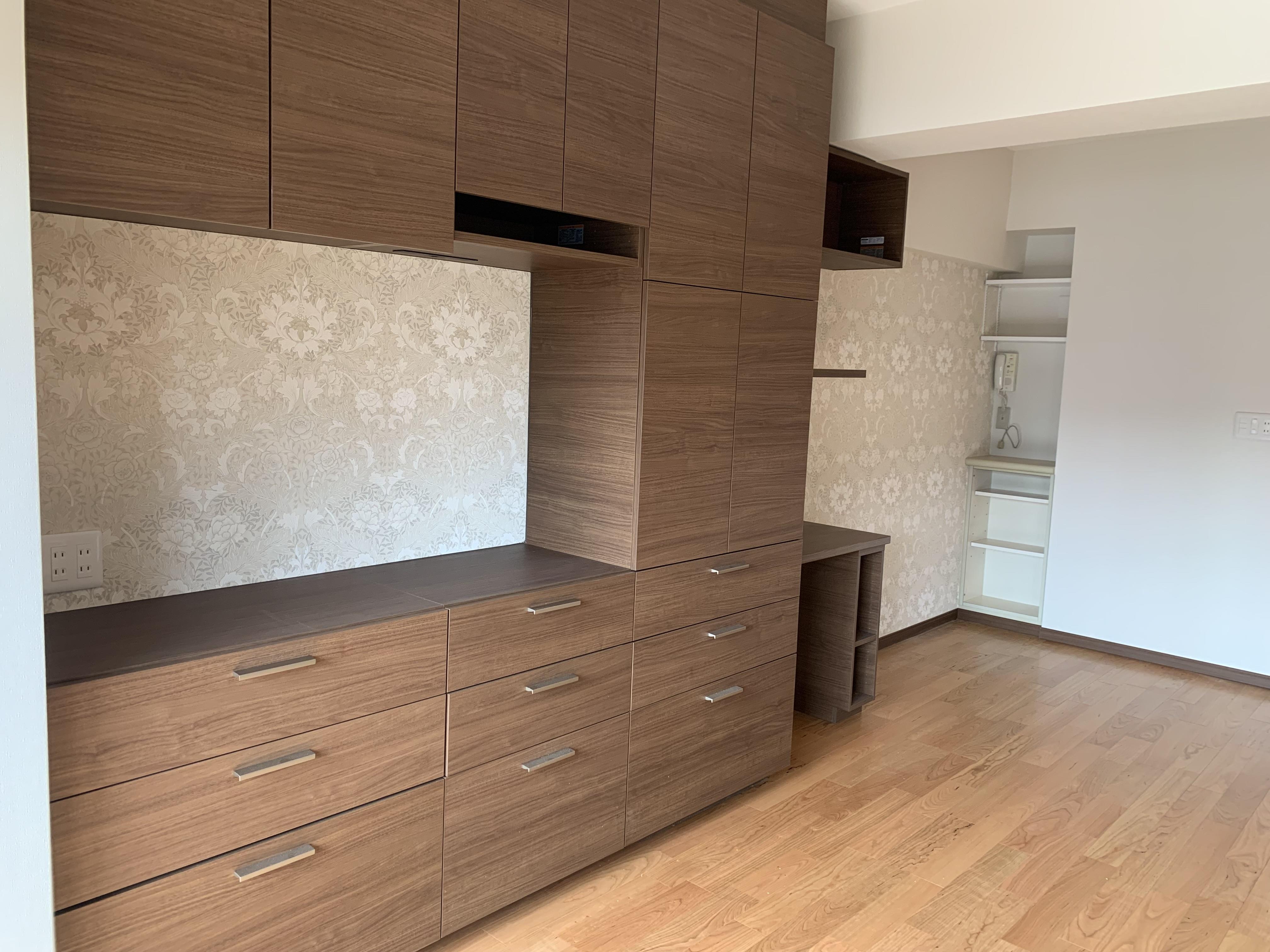 築31年のマンションで設備機器が古くなった事、収納に困っている事がリフォームのきっかけとお聞きしています 段差や梁が多く物が置きずらい様でした 引戸や壁面収納、ニッチを活用しすっきりと仕上がっています 壁紙は150年以上前に生み出されたデザインのウィリアムモリスをアクセントに使っています