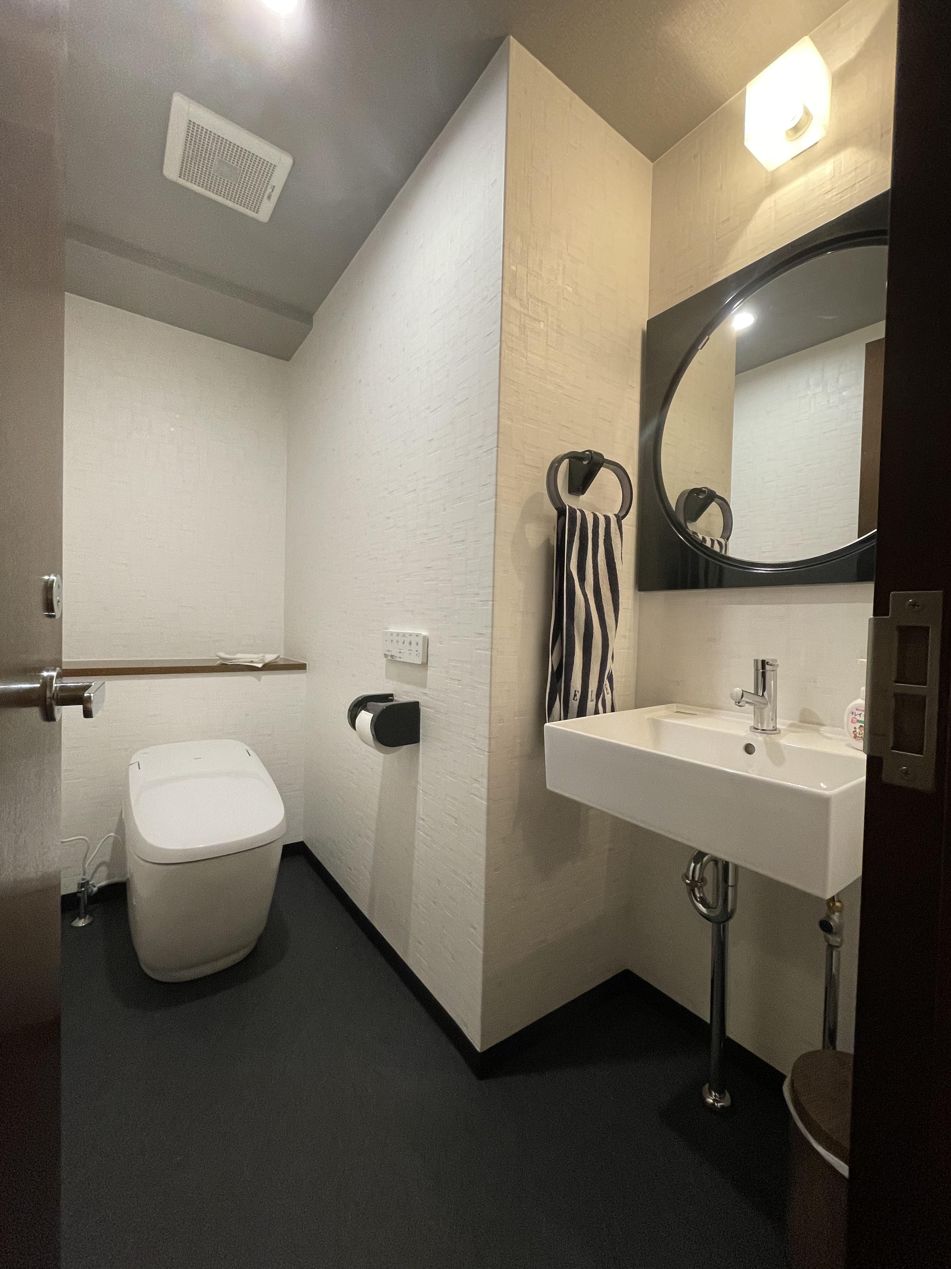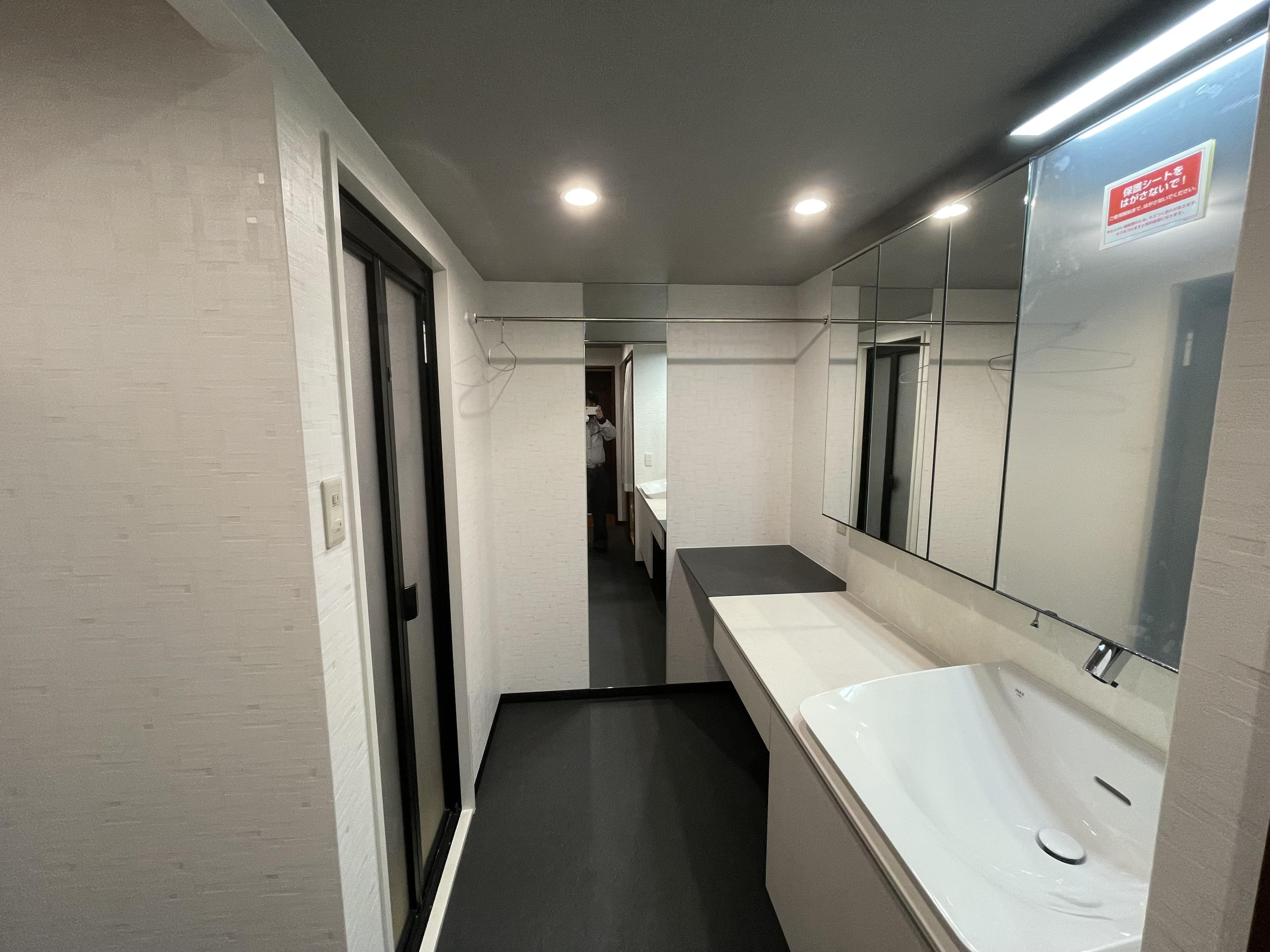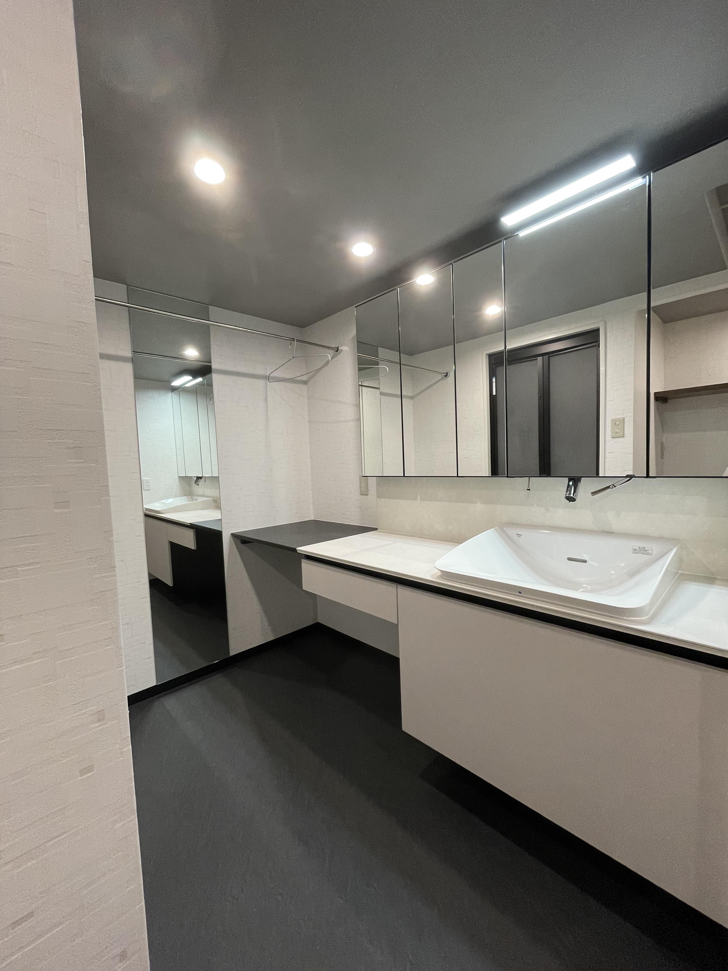 洗面室が広く、もともとの洗面台も大きかったため、 いろいろなプランができるので、洗面台のプランを決めるために Sさまと念入りにお打合せさせて頂きました 内装もまた、モノトーンのご希望でしたが、 どこに何色を配色するかもサンプルを準備しながらお打合せしました 出来上がりにとても喜んで頂いていて私も嬉しく思っています