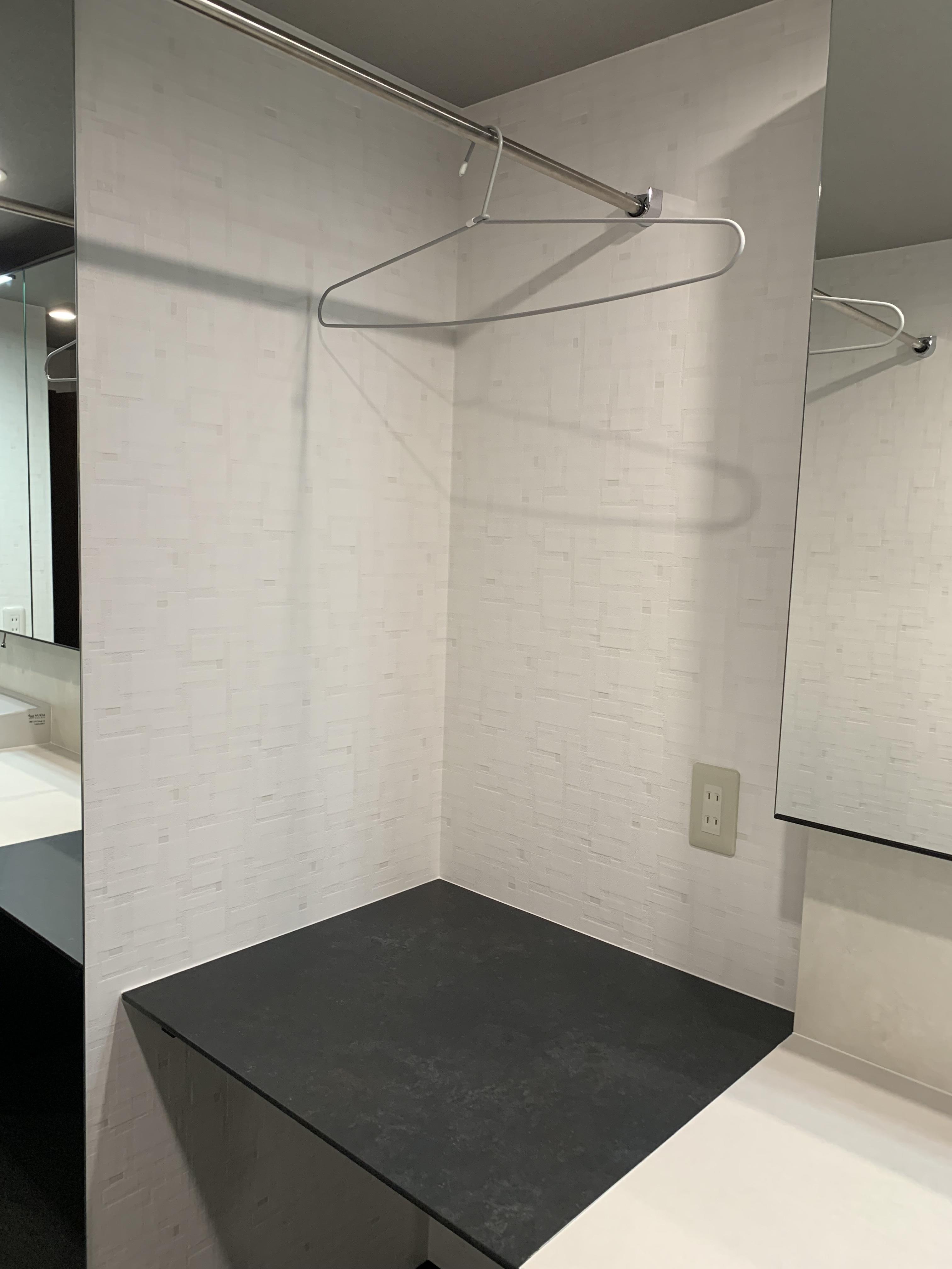 L型だった洗面台はI型にし、奥には造作のカウンターを付けているため用途に合わせた使い方ができるようになりました