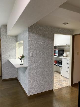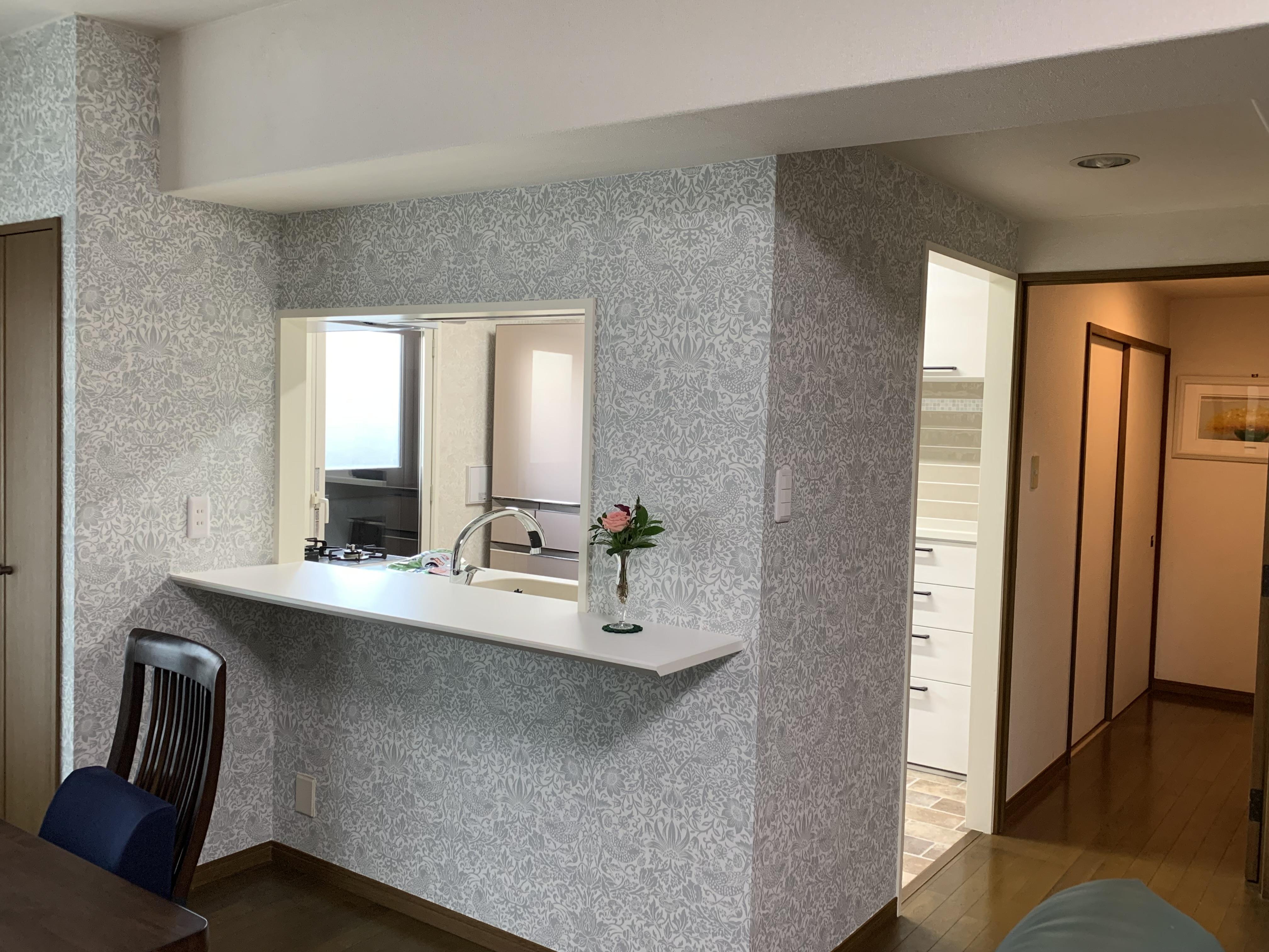 壁紙はウィリアムモリスのいちご泥棒をキッチン側とダイニング側で色違いにしています