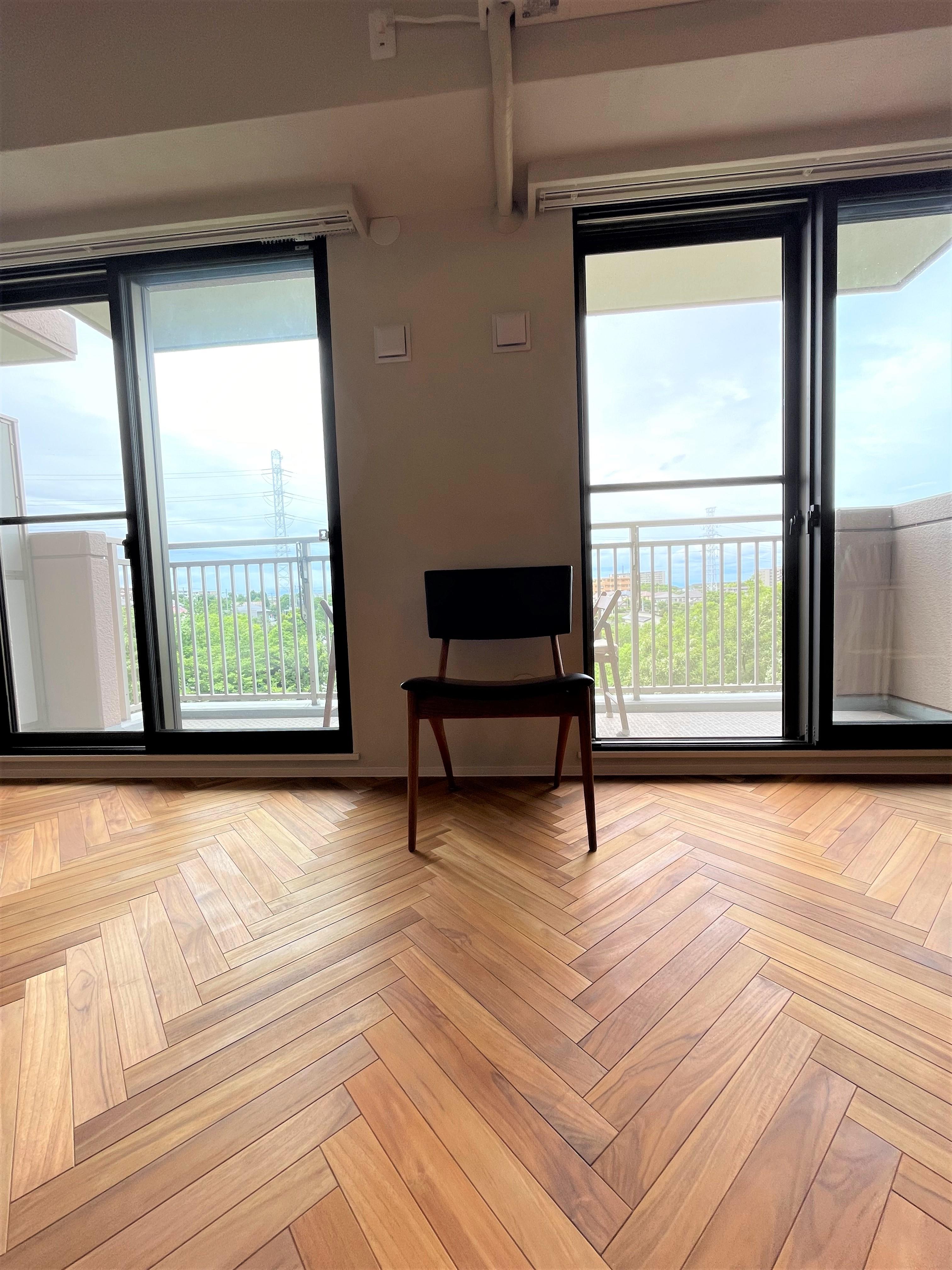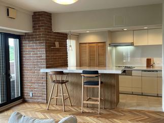 マンションの構造で多い「直コンクリート床」に対応できる防音マットを採用する事により、無垢フローリングを使用する事ができました。 ヘリンボーン貼りのフローリングと、キッチンはタイル貼りの床。天井と壁は「化学物質の高い浄化作用」がある天然無機の内装左官材を使用。 キッチンリビングの中央に置いてあるカウンターも特注です。 ご夫婦で一つ一つ丁寧に材料を選んでいただき、体にも優しく、居心地の良い空間に仕上がりました。