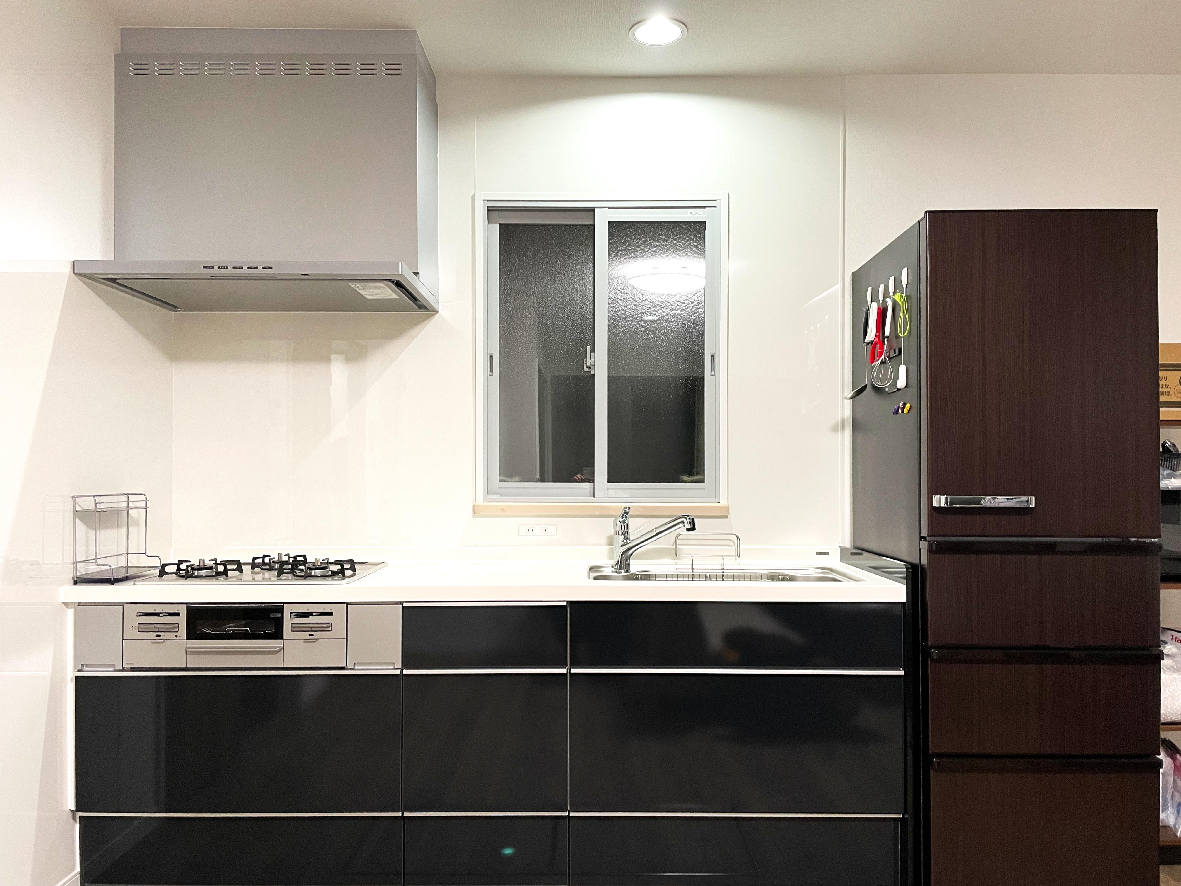 戸建ての1、2階のリノベーション。1階の和室を洋室にしてLDKとつなげ襖を木目に変えました。扉もラシッサDのラフオークに変えウッディなイメージに。 キッチンは白の木目から、ダークな色の扉に変えガラッと印象が変わりました。