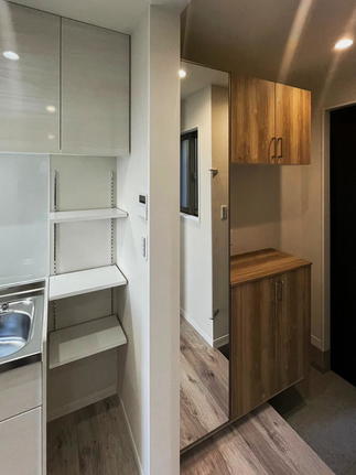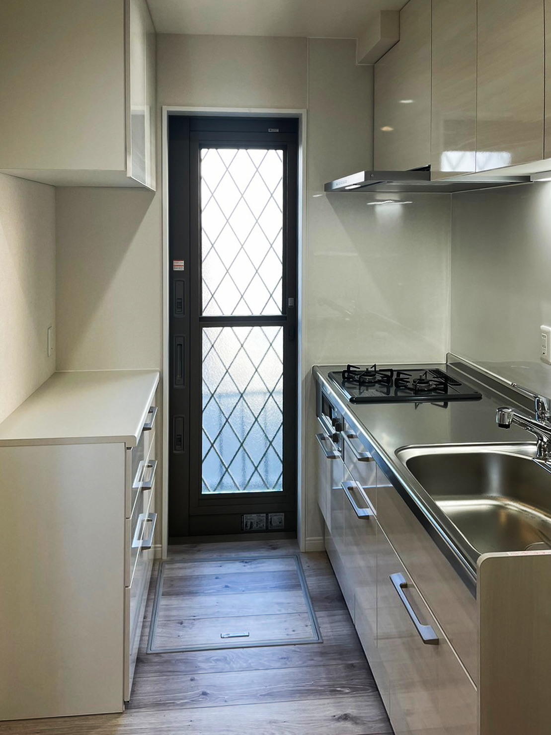 今回のリノベは柱を残してほぼスケルトンの工事でしたので工期も長くかかりました。 耐震補強をしつつ、窓をすべて入れ替えて断熱材を入れ、サイディングを貼ってとスペースの狭い中の作業は現場の苦労も多かったようですが、見違えるようになったリノベ後の建物をみて感慨もひとしおです。 プランでは7坪の中でも暮らしやすく個室を確保しつつ収納を工夫し、廊下に壁面収納を設置、階段上にも収納とランドリールームを設置しました。 通風と採光をできるだけ取り入れ、ベランダの壁や階段横にスリットを入れたり勝手口から通風を取り入れる工夫をしました。