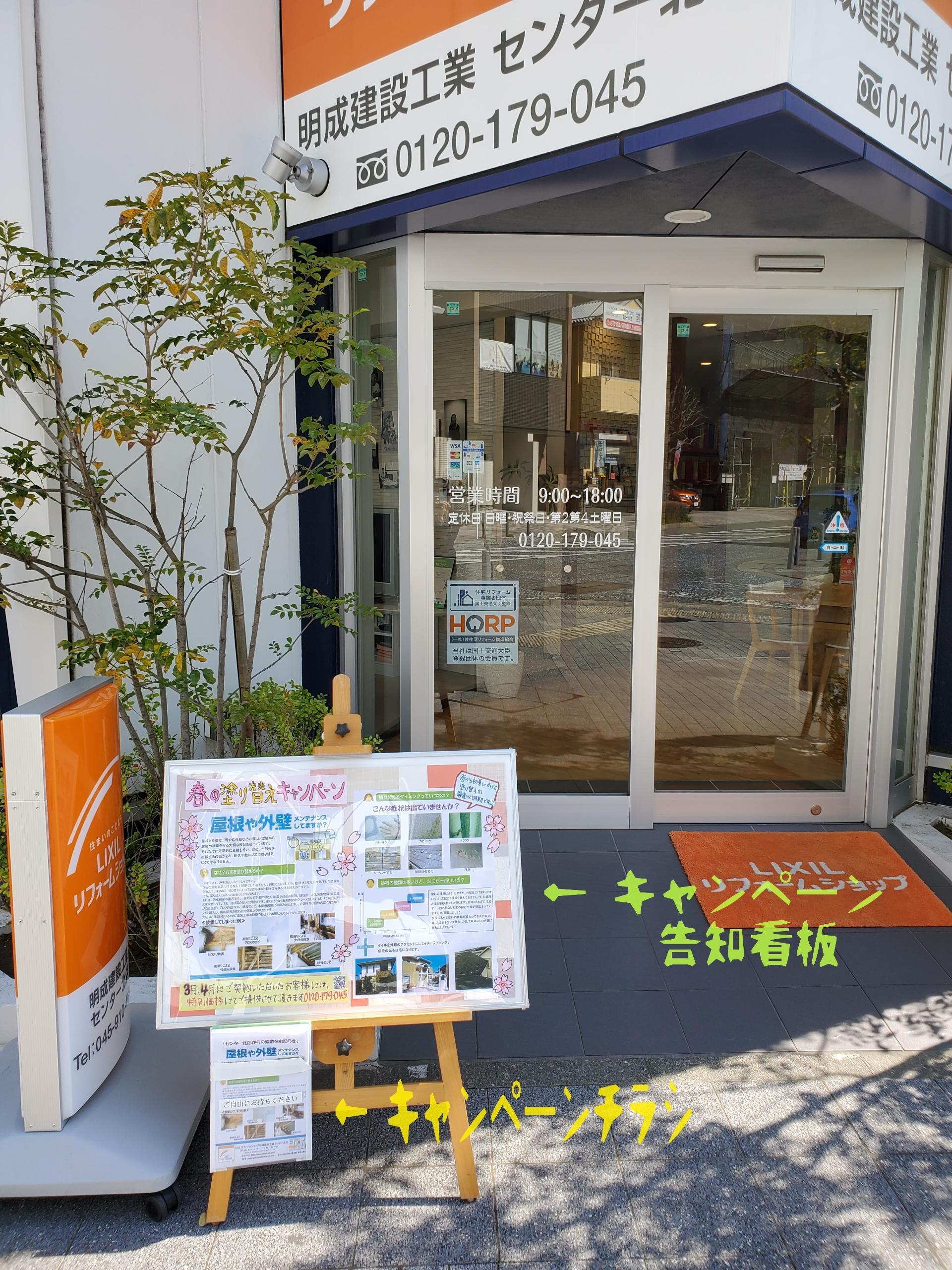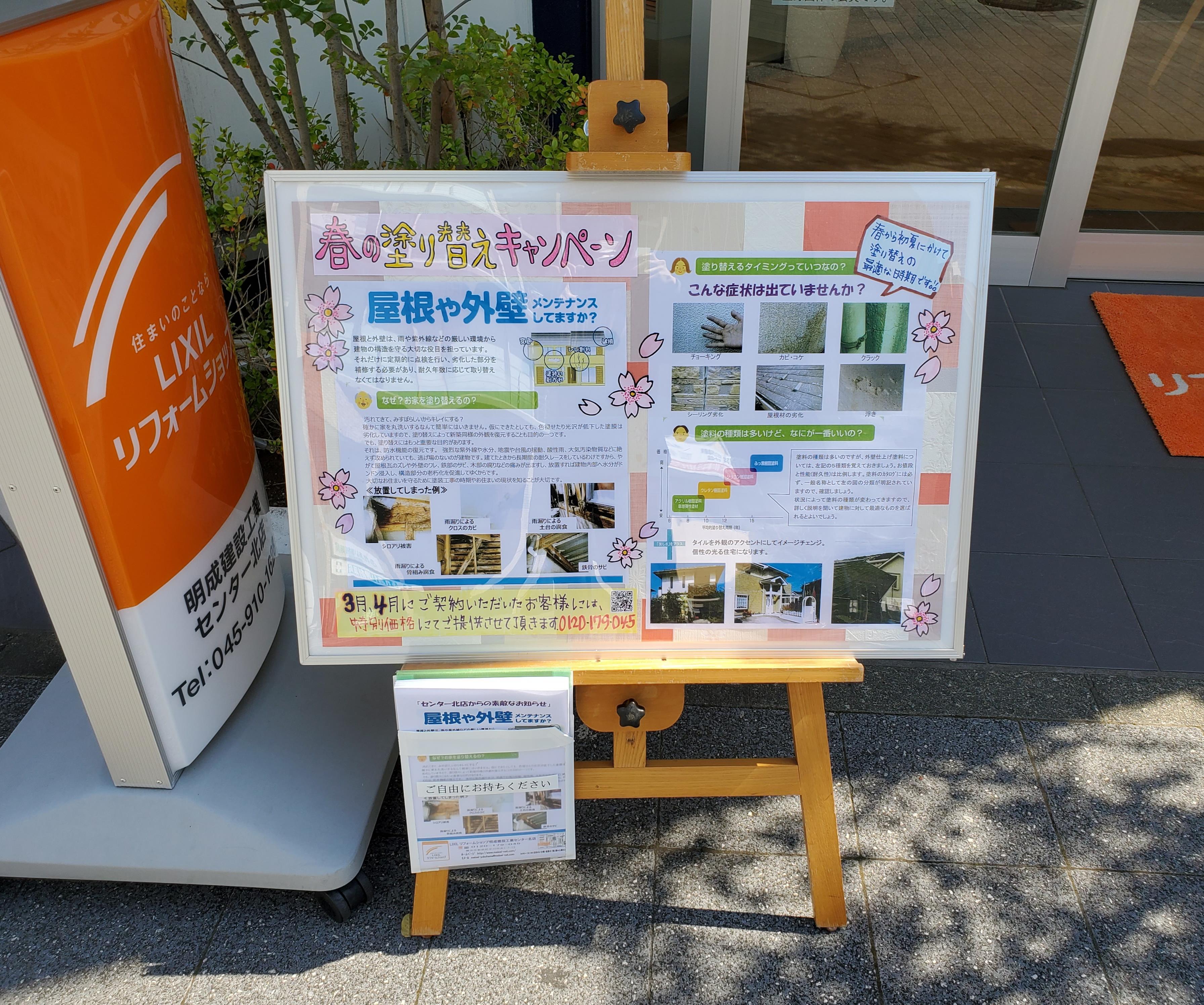 キャンペーンの告知看板とチラシは、店舗入り口前にございます。