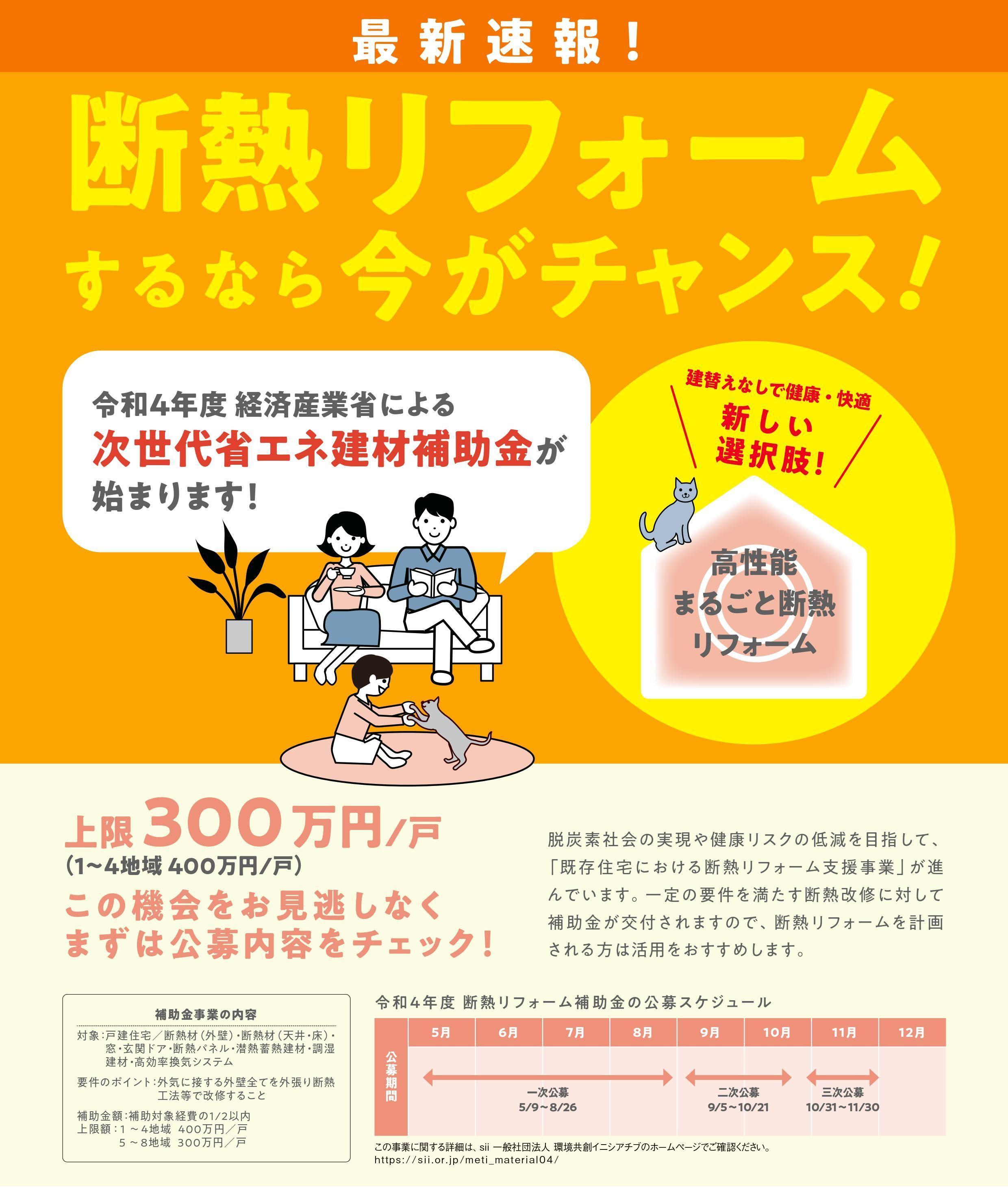 令和4年度の経済産業省による『次世代省エネ建材補助金』が始まります。