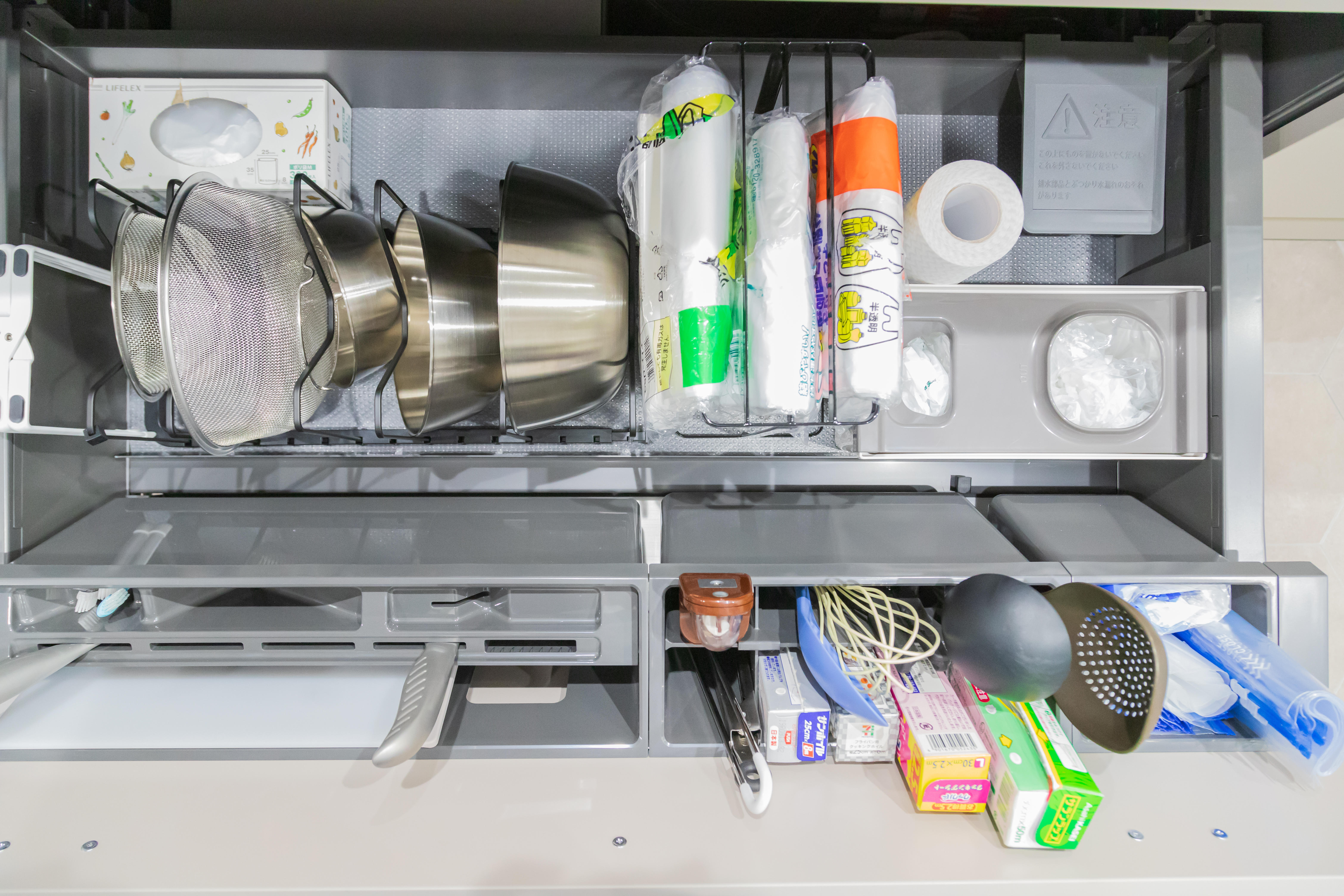 上の写真は、先日キッチンを交換させていただいたお客様の引出の使い方の一部です。
